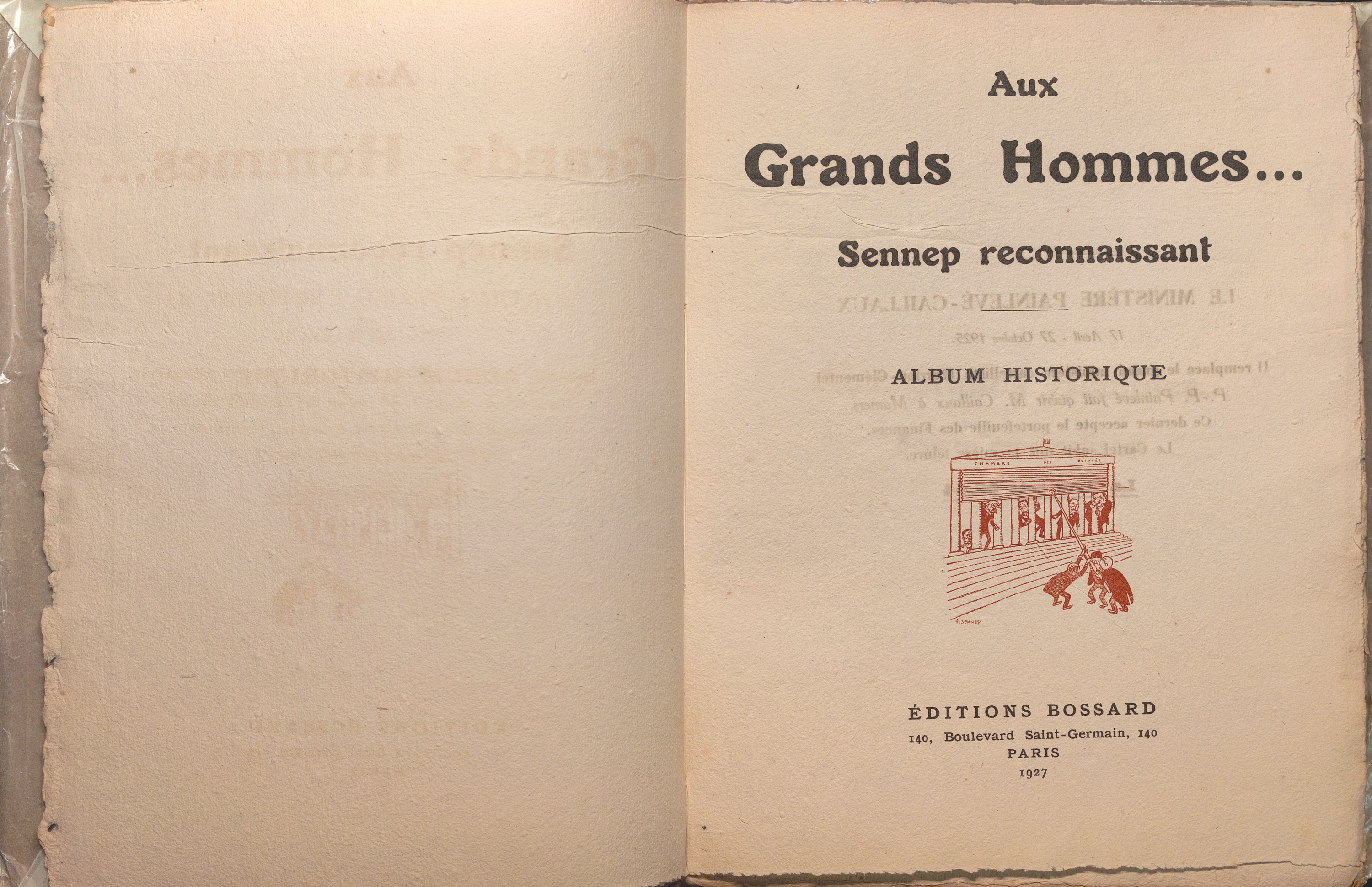 Joint: Sennep, Aux grands hommes Sennep reconnaissant. Album historique. Editions Bossard, 1927. Grand in-4, couv. illustrée, tiré à 960 exemplaires sur papier chiffe d’Auvergne. T.B.E.