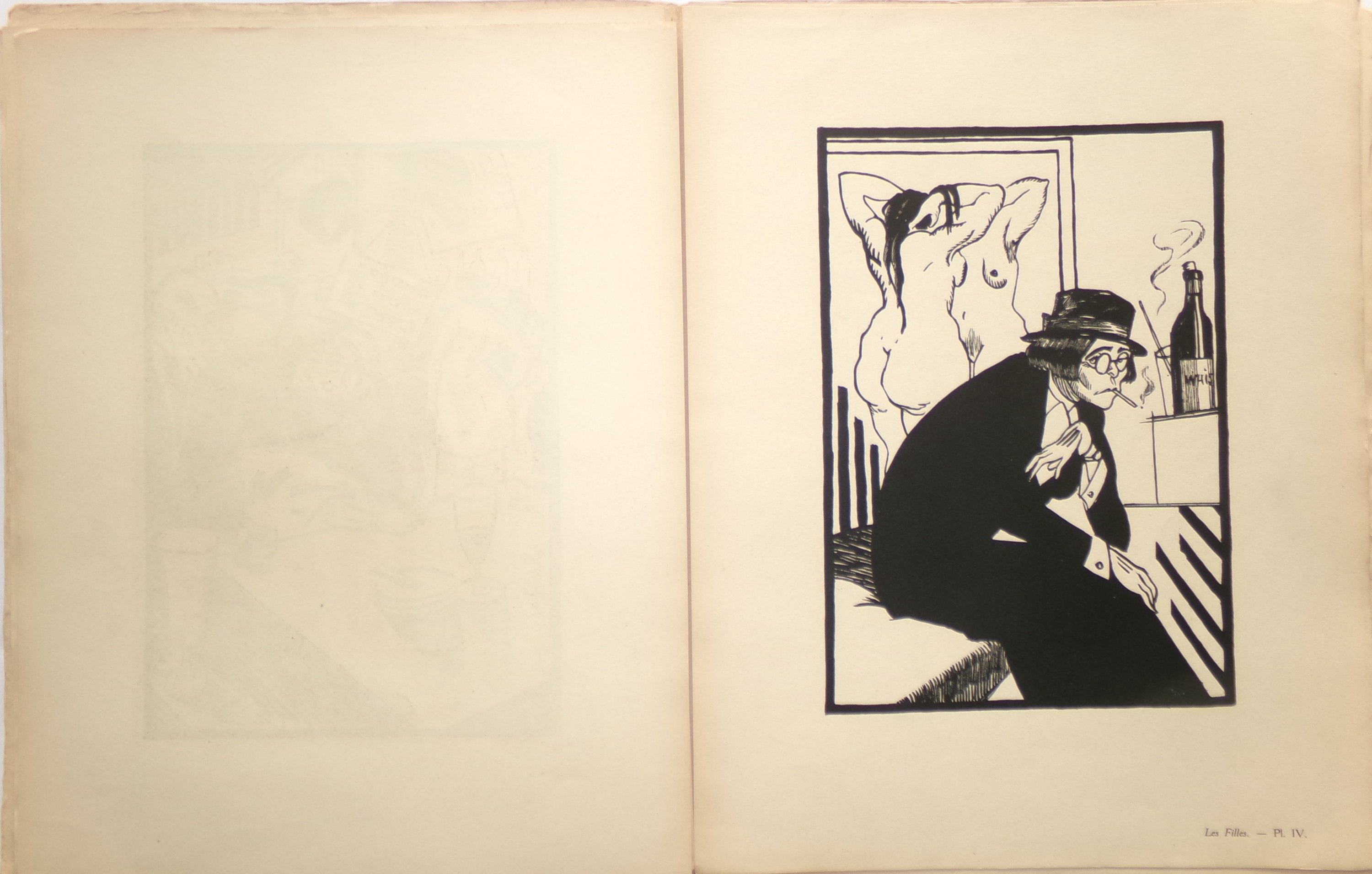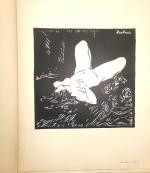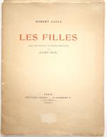 Robert Cayla et Julien Pavil, Les Filles, suite de 10 dessins originaux. Paris, Editions Sansot, 1923. Broch. in-fol., couv. impr. et rempliée, 17 pp. suivies de 10 compositions érotiques en noir impr. sur le thème de la prostitution, dessinées et signées par Julien Pavil. n°60/250 ex. sur vélin teinté. Envoi dédicacé, signé et daté: « A M. et Mme Paul Maître [architecte], ces créatures tristes quand elles sont de joie ; privées quand elles sont publiques, incorrigibles quand elles sont soumises. En souvenir de ma deuxième collaboration avec mon grand Pavil (1923, hélas), les compagnons de Rabelais n’existant pas »