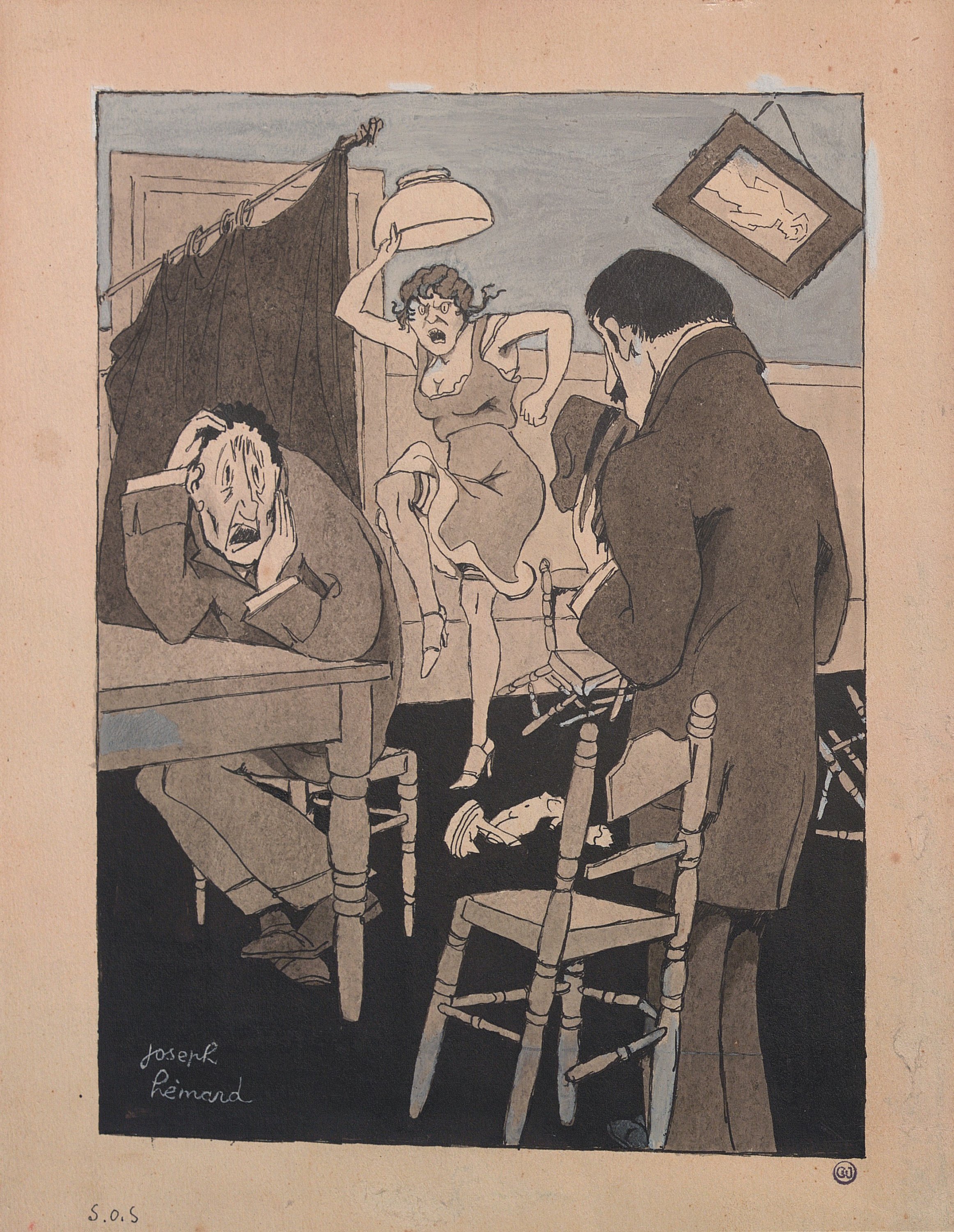 Joseph Hémard (1880-1961), S.O.S., encre et lavis, signé, légendé « Ah! mon pauv’ieux!! Viv’ment un dictateur!! », 32 x 24 cm.