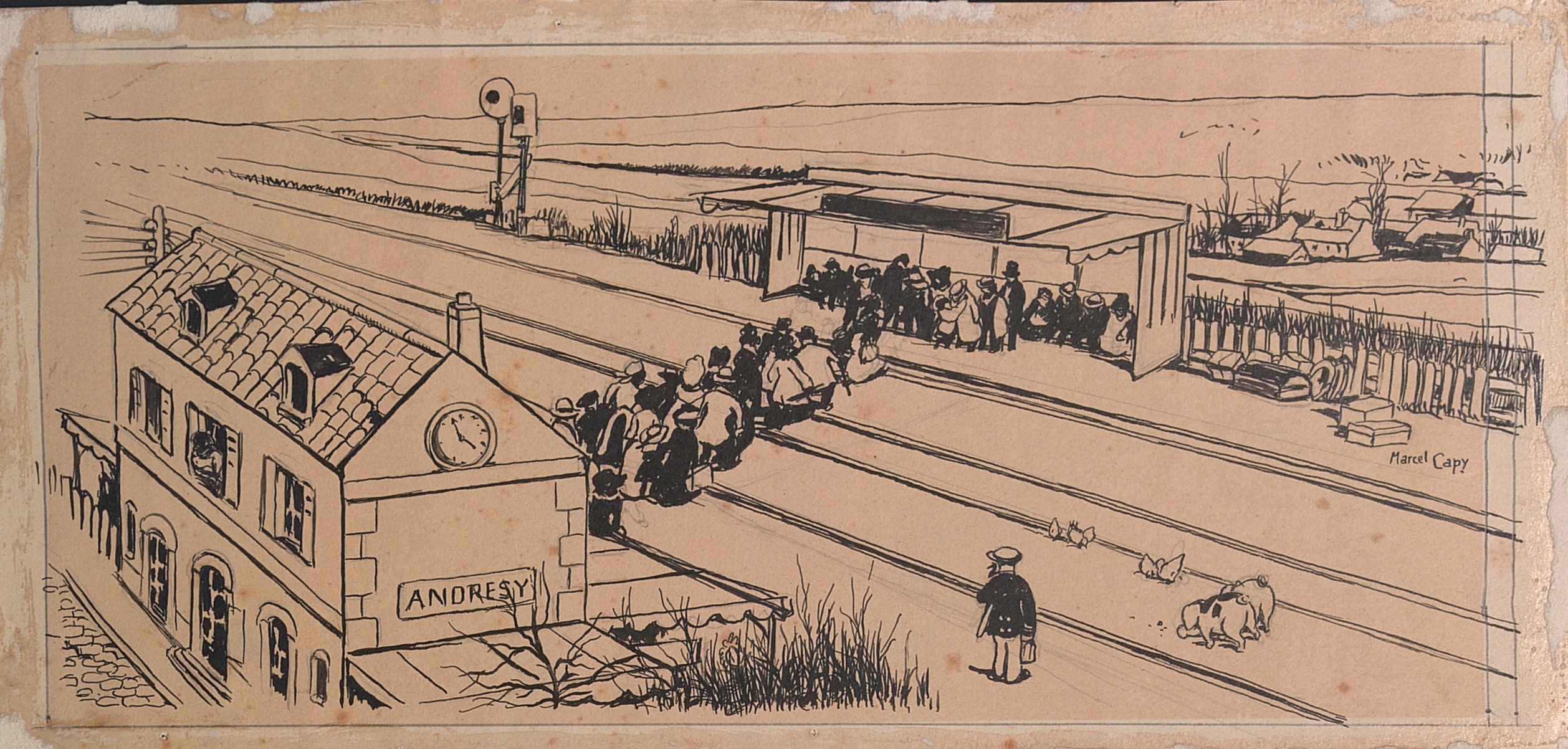 Marcel Capy (1875-1941), La gare d’Andrésy, encre, signé, 17 x 34 cm ;