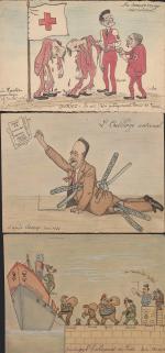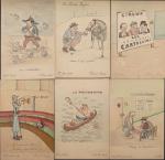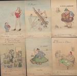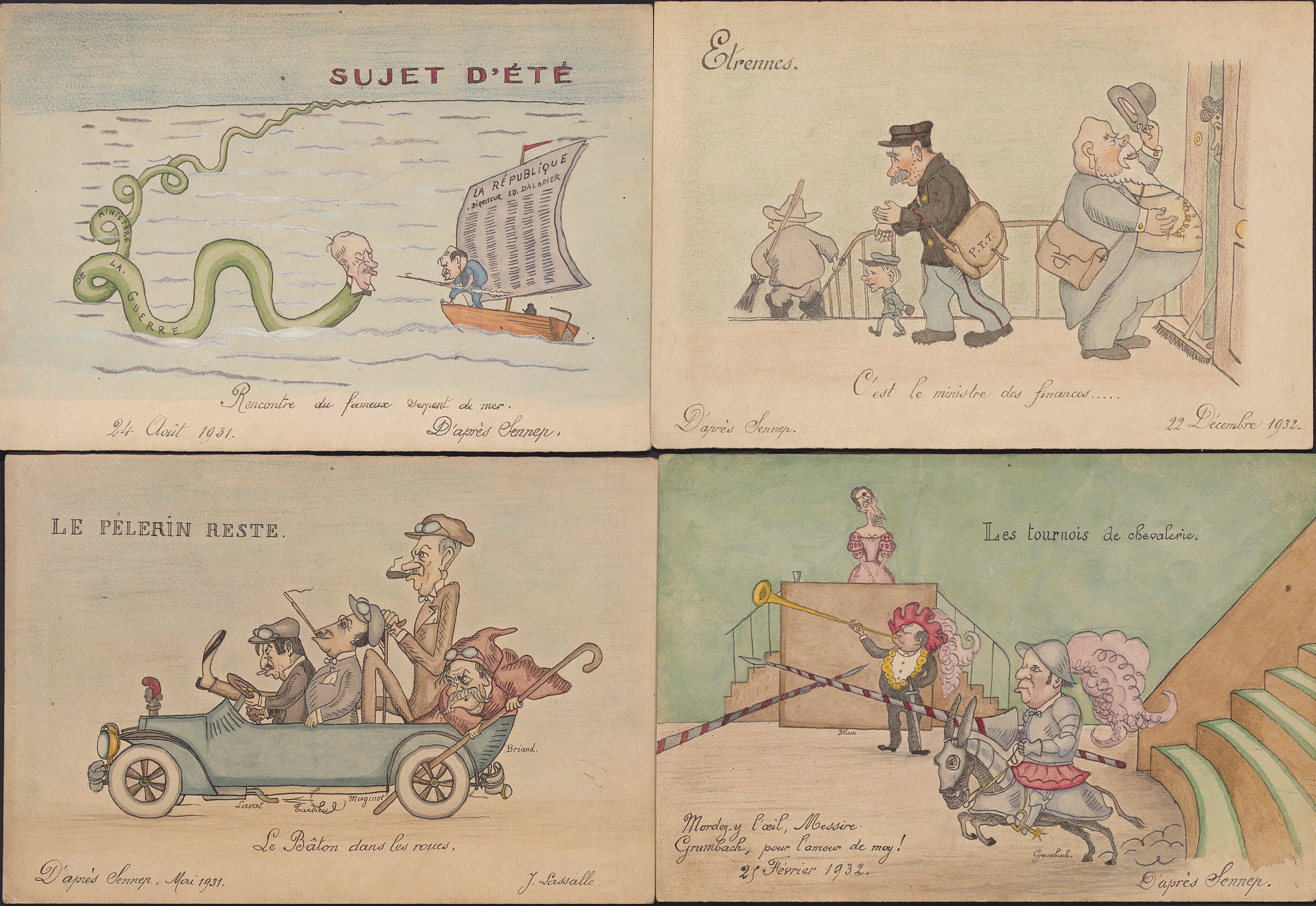 Réunion de 29 dessins originaux sur papier, encre et aquarelle, signés J. Lassalle, env. 14 x 20 cm, d’après le dessinateur de presse et caricaturiste Jean Sennep ; scènes humoristiques extraits de journaux d’époque publiés entre 1926 et 1933, dont: Le Pèlerin reste ; La Périssoire ; Le Réveil ; Au manège Huyghens ; Etrennes ; Le successeur ; Le Plongeoir ; etc.