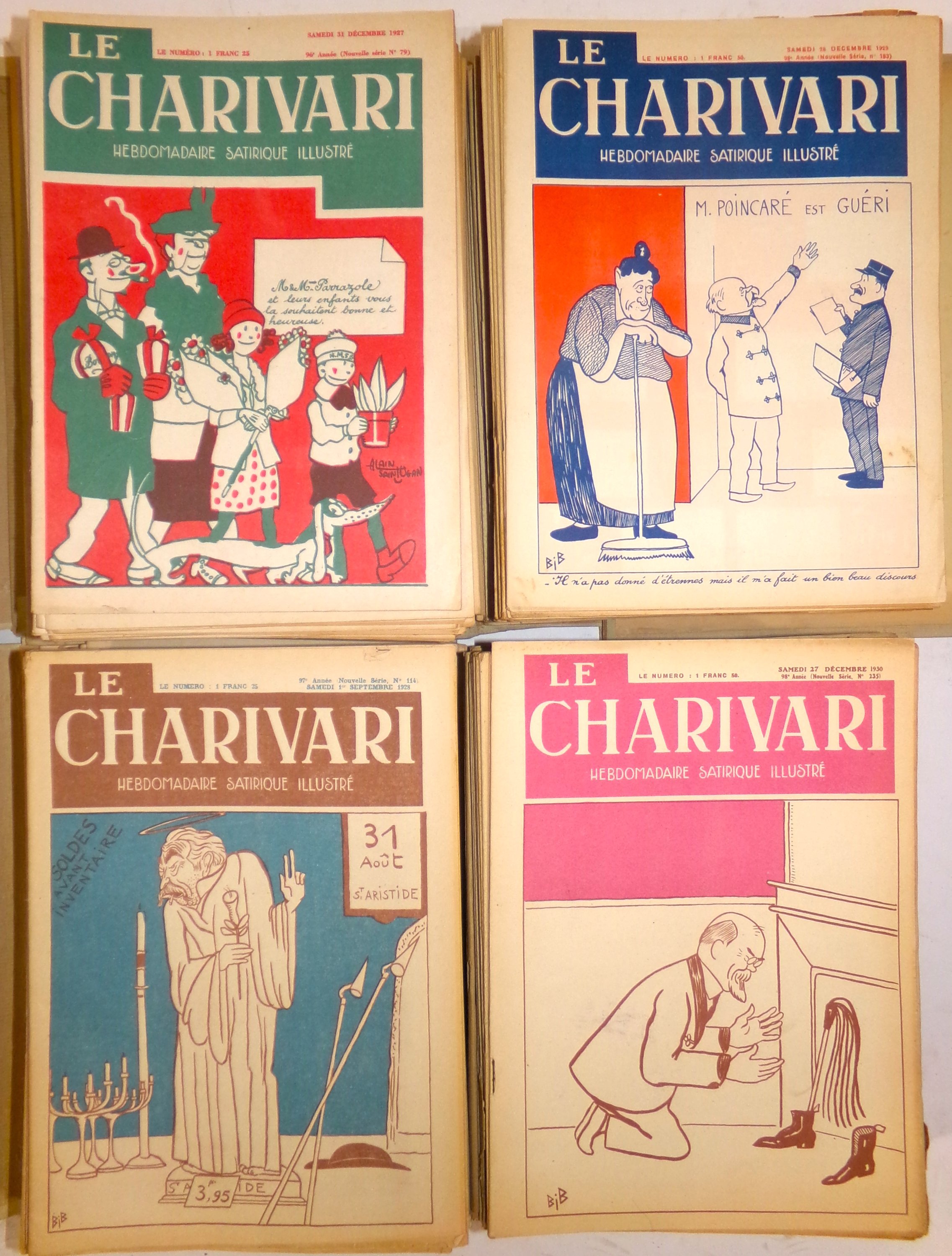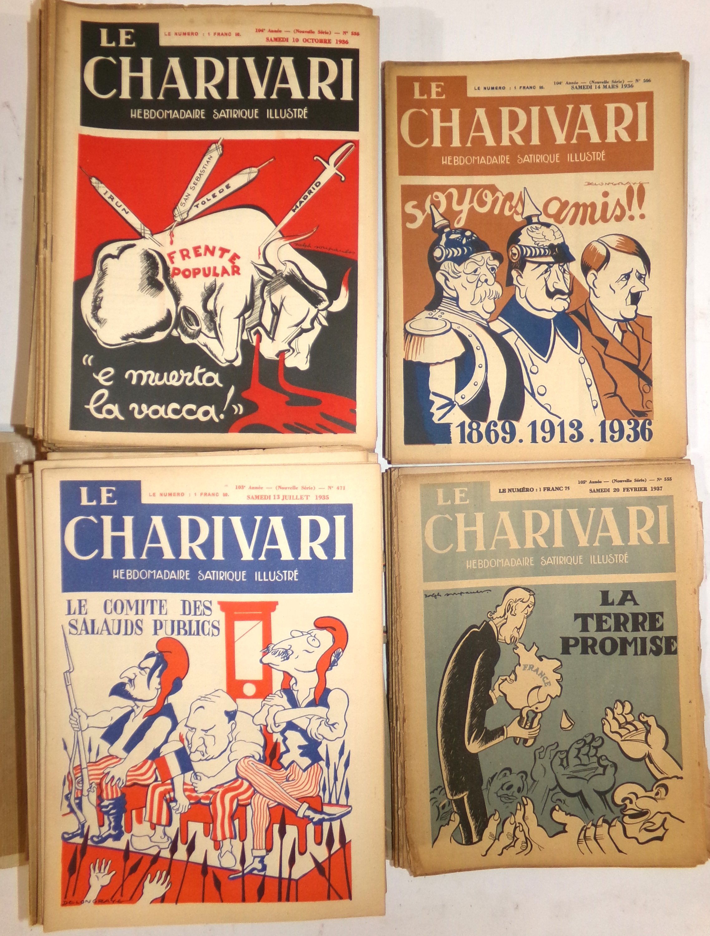 « S’appropriant le nom du célèbre quotidien fondé par Philipon en 1832, quelques amis royalistes liés à l’Action française lancent le 19 juin 1926 un journal éponyme, clairement marqué à droite. L’hebdomadaire, de taille modeste (20x28cm) par rapport à son aîné, fait preuve d’une originalité certaine pour l’époque en se dotant, pour rédacteur en chef, d’un dessinateur et non des moindres: Jehan Sennep. Le Charivari est détenu par la Société française des périodiques illustrés (également Nouvelle Société des journaux humoristiques) et géré par un certain Champetier. L’Imprimerie française de l’édition qui s’occupe du tirage dans les premiers temps réalise certaines publications de L’Action française. Après deux numéros à 18 pages, l’hebdomadaire s’étoffe de dix pages supplémentaires, conséquence du succès rencontré, dans un environnement pourtant très concurrentiel. Annoncé avec la participation des dessinateurs Bib et Touchagues ainsi que du chansonnier Martinni, Le Charivari comprend dès le second numéro la signature de Ralph Soupault, futur caricaturiste phare de la Collaboration. On peut évoquer également de grands noms du dessin de droite d’avant et d’après la Seconde Guerre mondiale: Chancel et Ben notamment. » (Ridiculosa, n°18, Guillaume Doizy, 2011)