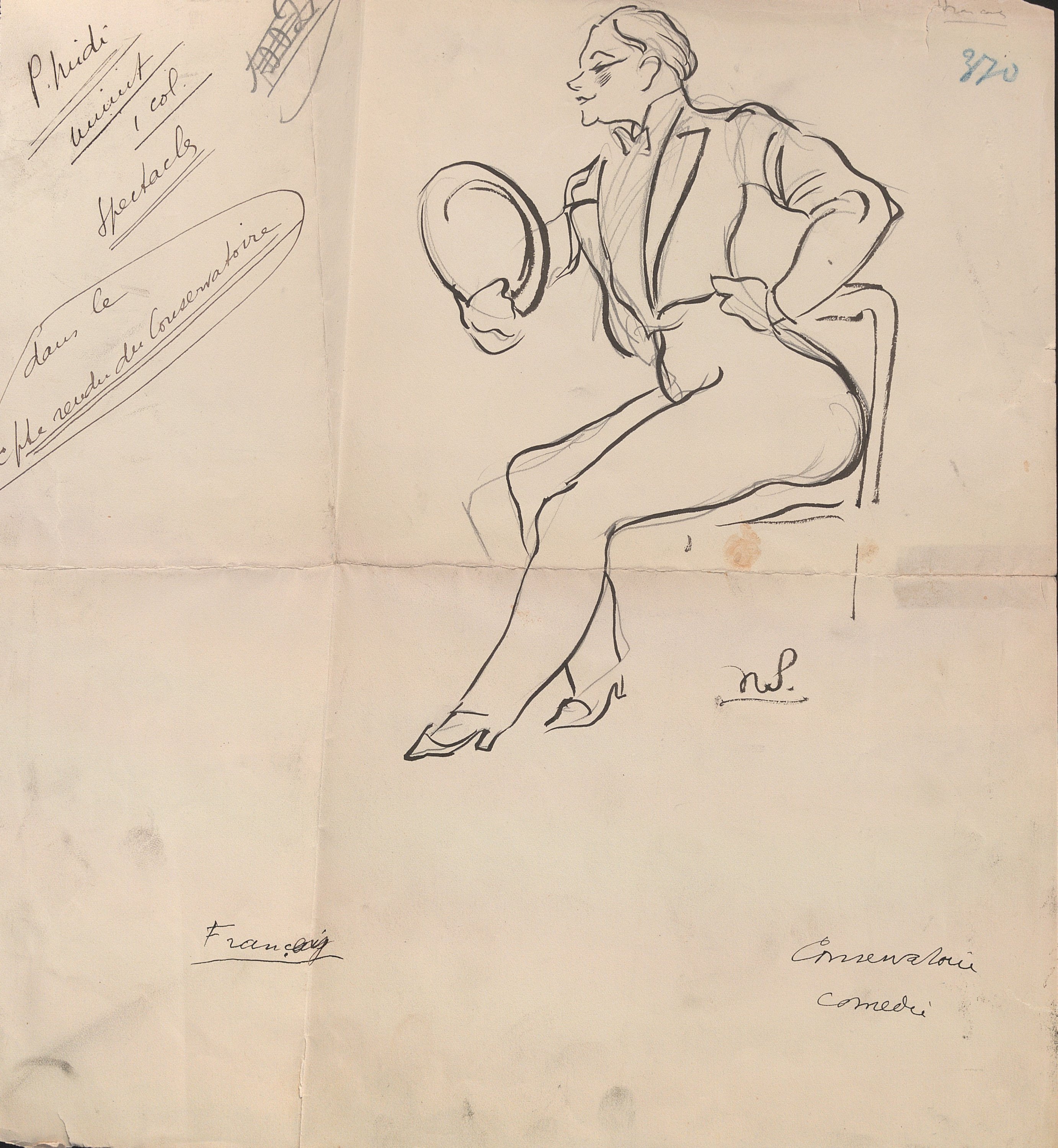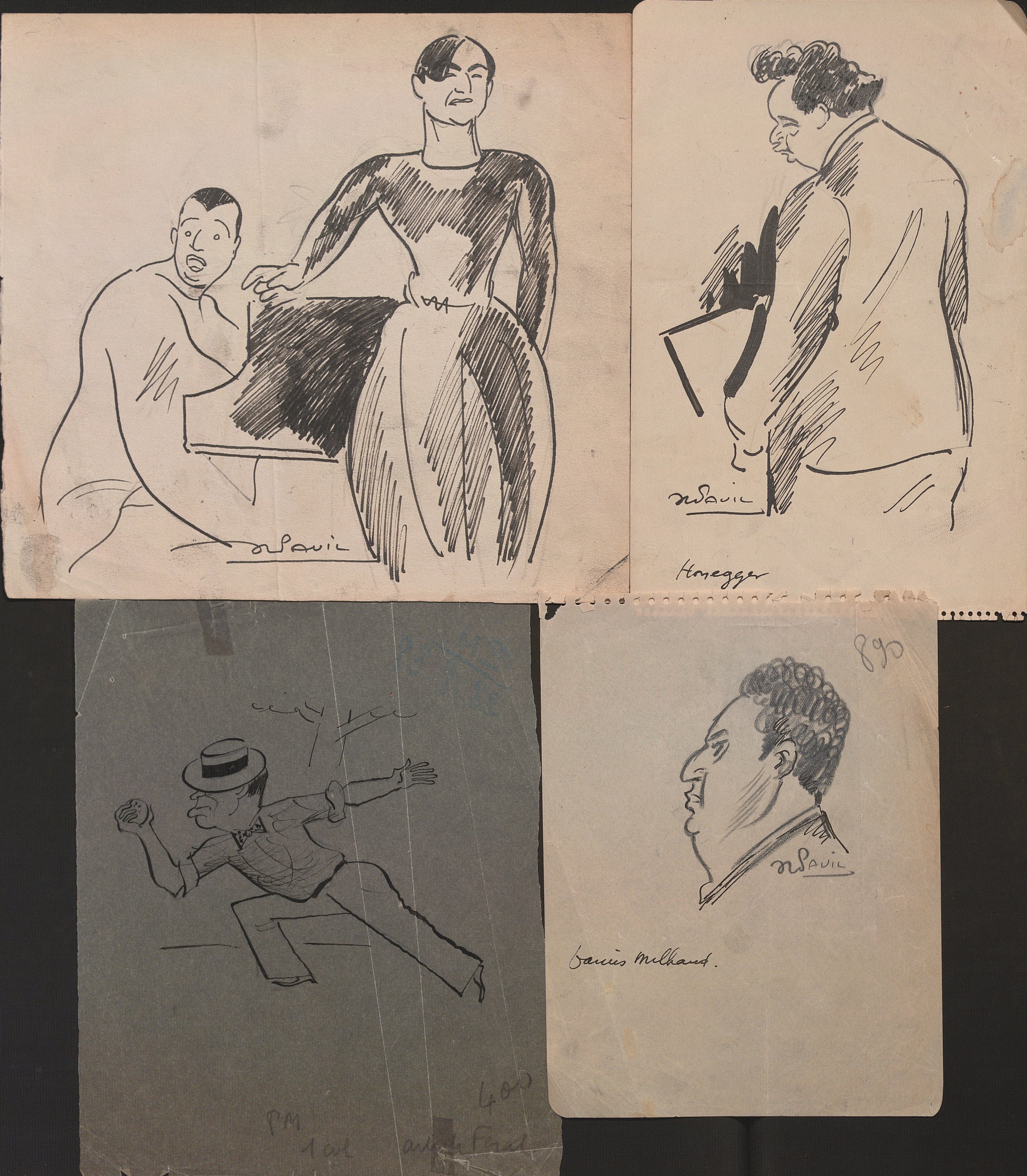 Portraits de comédien(ne)s, compositeurs de musique, dramaturges, acteurs/actrices, dont: « M. Varna [Henri] faisant une répétition » ; Cécile Sorel ; Carole Rémy dite Séverine ; Pierre Bertin ; Mary Marquet dans l’Hérodienne (1932) ; Pierre Dux au Conservatoire ; « Mme Chiappe [épouse du préfet de police de Paris] et Melle Mistinguett vendent des parapluies » ; Darius Milhaud ; Arthur Honegger ; Paul Claudel ; Eve Francis ; Greta Garbo ; Gloria Swanson ; Lily Pons à l’Opéra ; Pauline Carton ; Maud Loty ; Georges Milton ; Irène Popard et son école de gymnastique harmonique et rythmique ; Emélie Bouchaud dite Polaire à l’Alcazar ; Claude Dauphin ; Gilles et Julien (Jean Villard et Aman Maistre) ; Jean Giraudoux ; Adolphe Menjou arrivée à Paris (20 juillet 1929) ; etc.