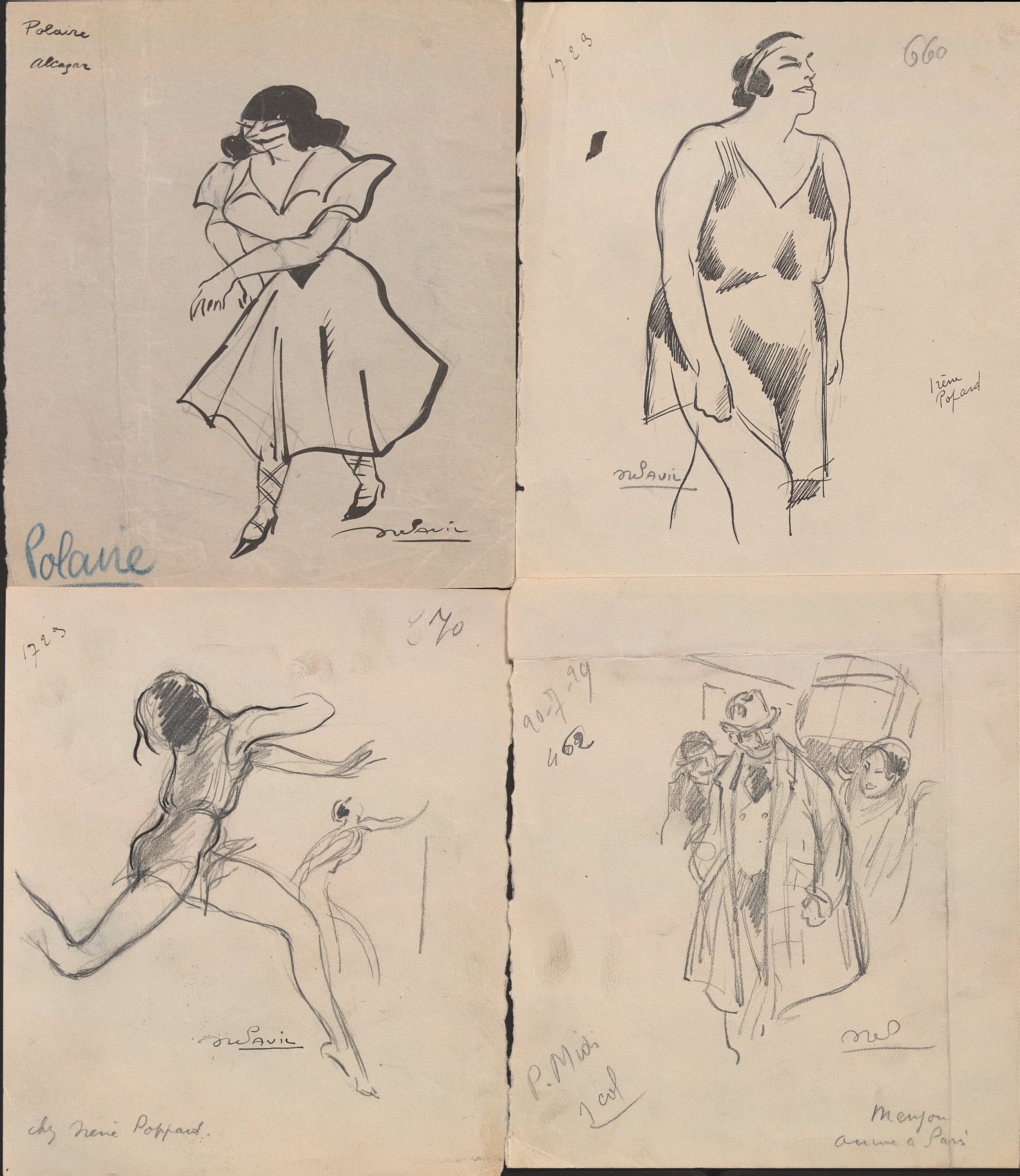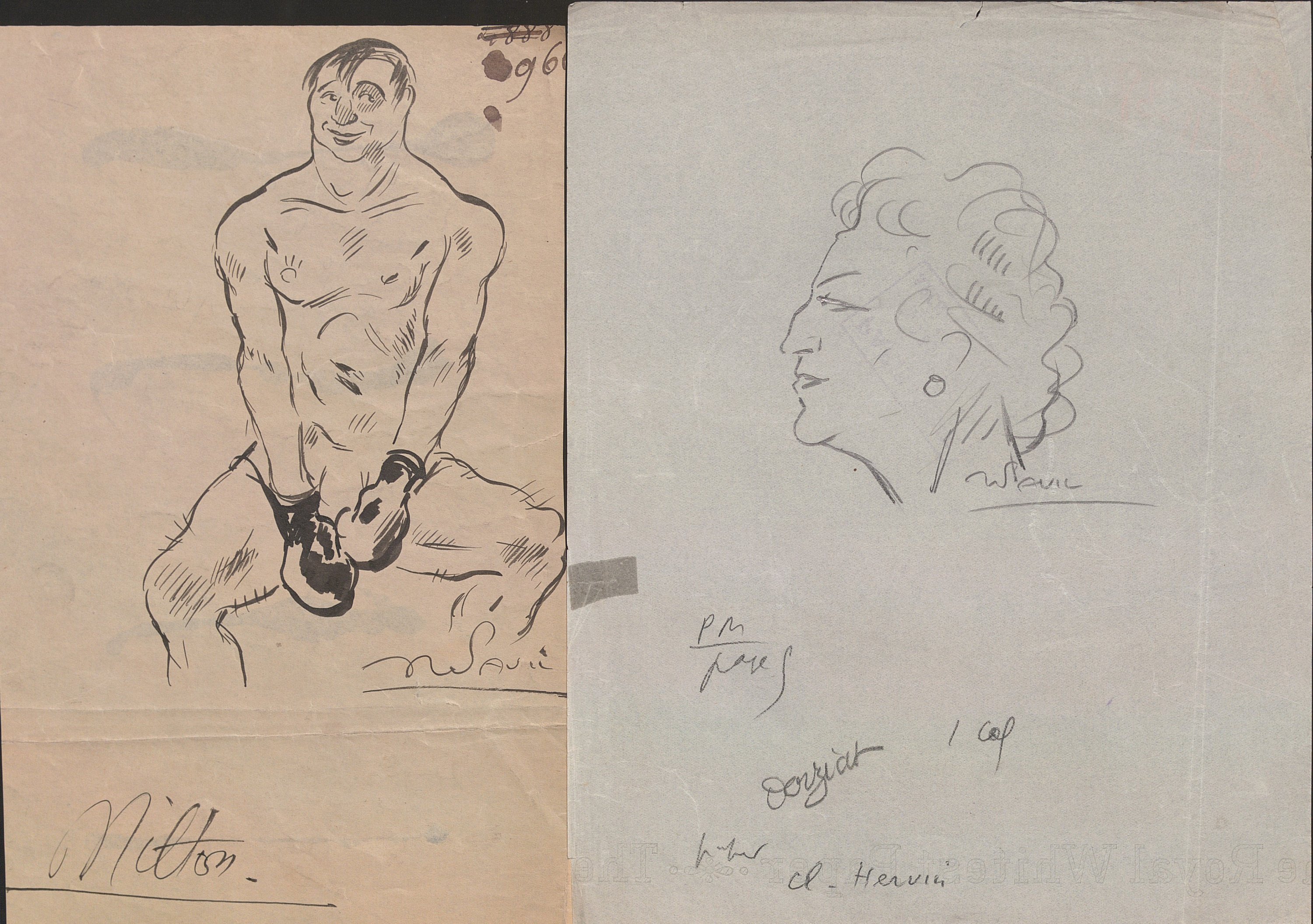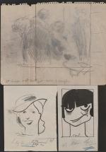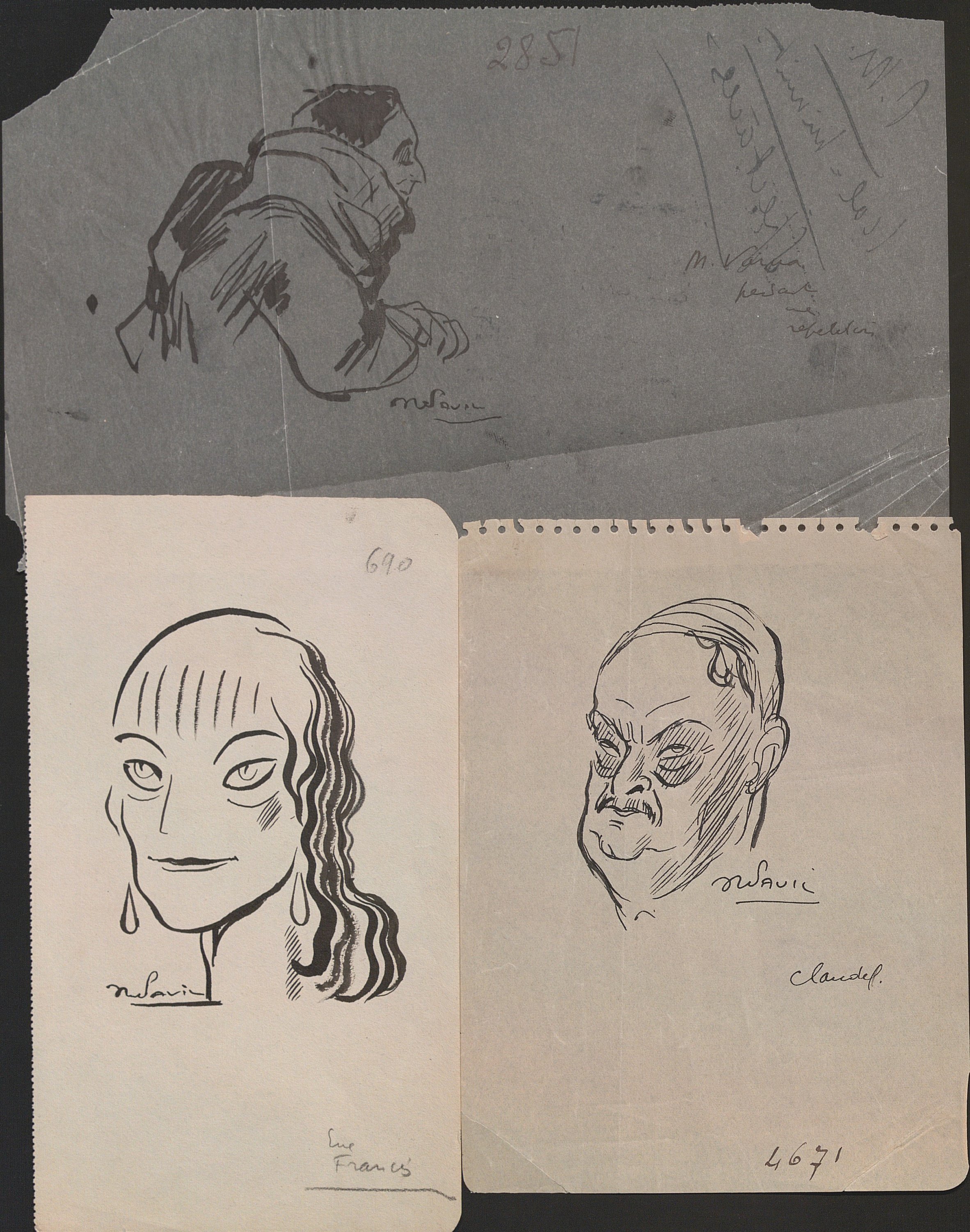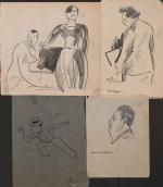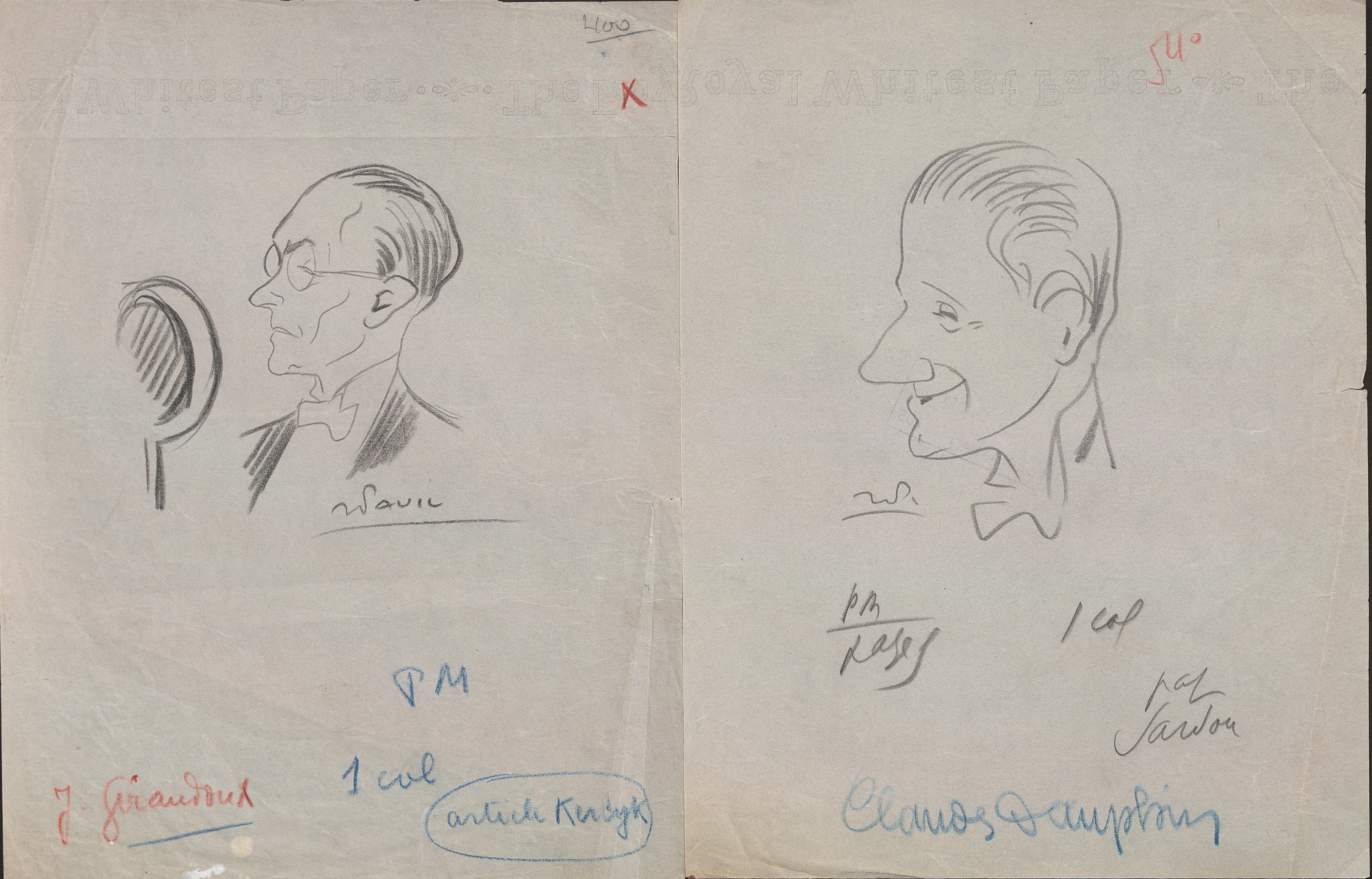 Portraits de personnalités, encre de chine et crayon, sur papier et calque, en majorité signés, formats divers, destinés à être publiés à la rubrique Les Spectacles du journal quotidien Paris-midi.