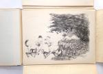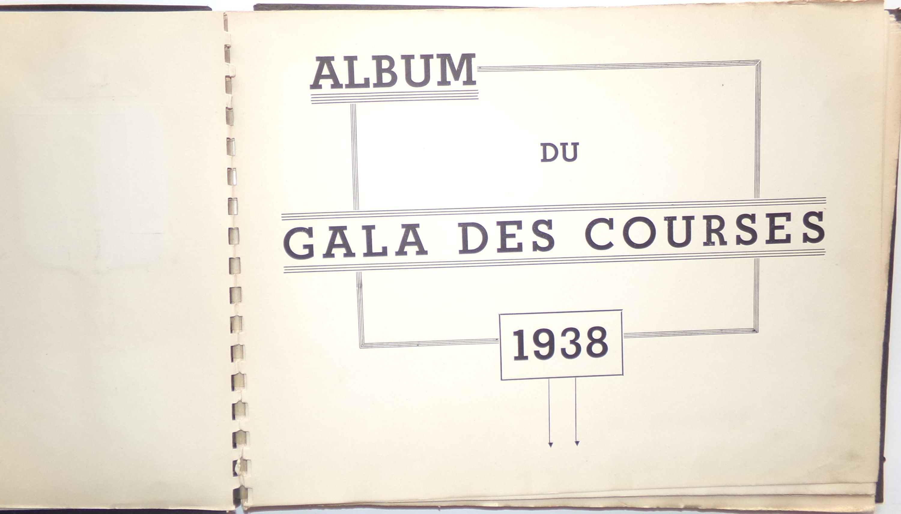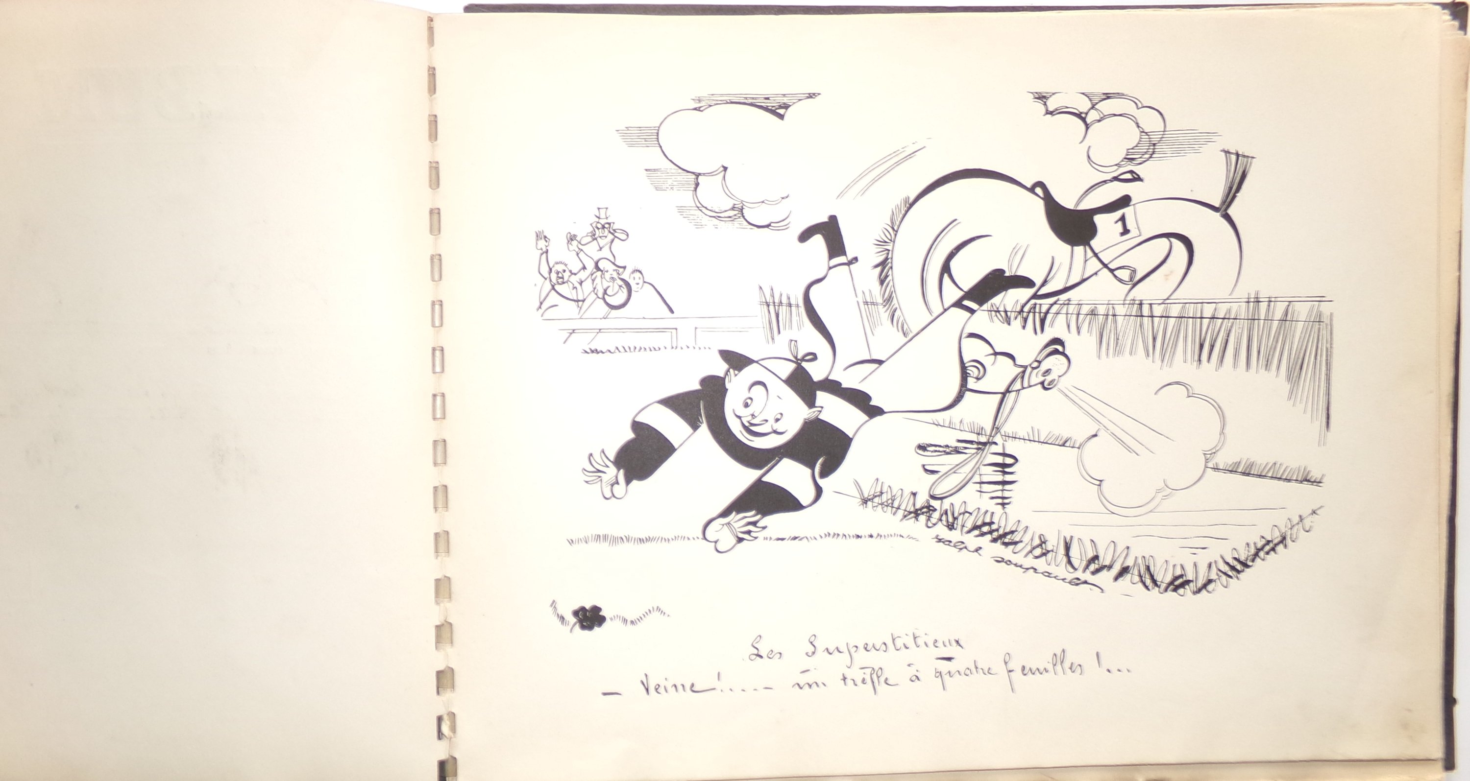 Album du gala des courses 1938. Paris, Lahure, 1938. In fol. oblong, cartonnage couvert de feutre noir, orné au premier plat d’un dessin sérigraphié de Malespina. Livre d’or édité à l’occasion du Gala des Courses organisé le 17 Juin 1938 au Théatre Marigny par le journal Paris Sport, illustré de 30 dessins humoristiques pleines pages avec le gracieux concours des dessinateurs: BIB, R. Carrizey, Chaurand Naurac, Don, Jean Effel, Raoul Guérin, Malespina, Raymond Pallier.