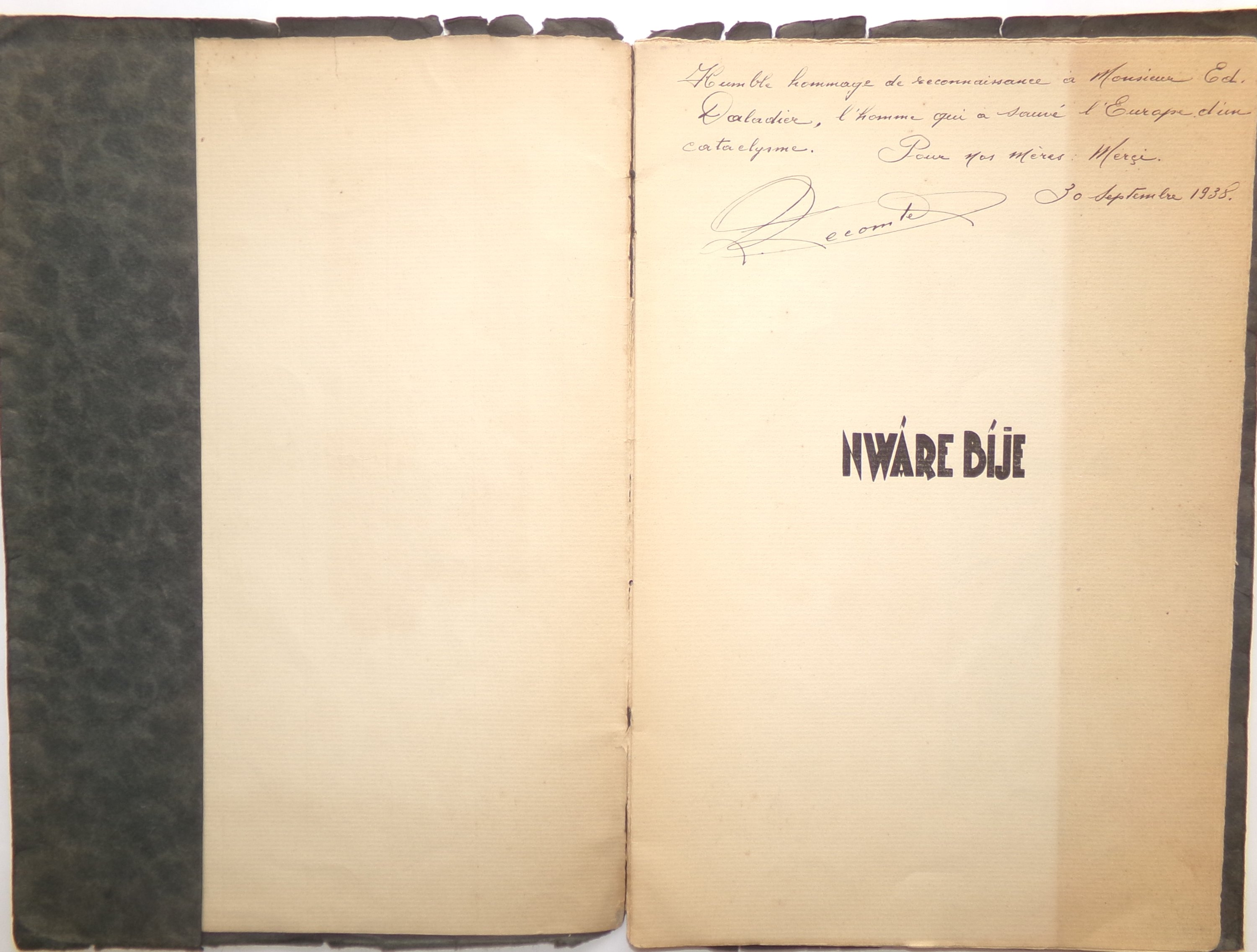 Louis Lecomte, Nware Bije. Illustrations de Gustave Camus. Gilly, Edition moderne Pierard, 1936. In-4 broch. Envoi dédicacé et daté à Edouard Daladier président du Conseil « Humble hommage à Monsieur Ed. Daladier, l’homme qui a sauvé l’Europe d’un cataclysme. Pour nos mères, merci » ;
