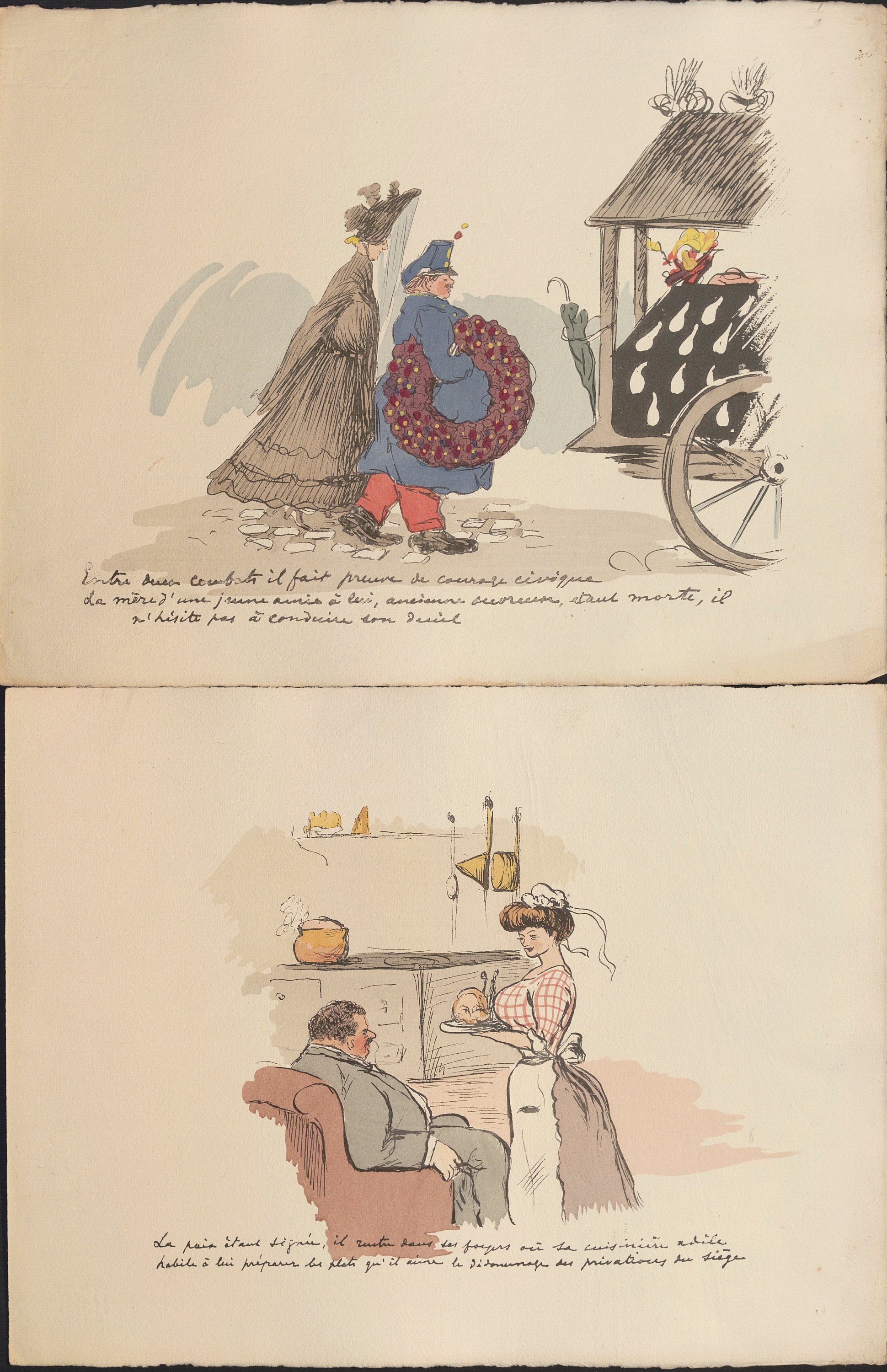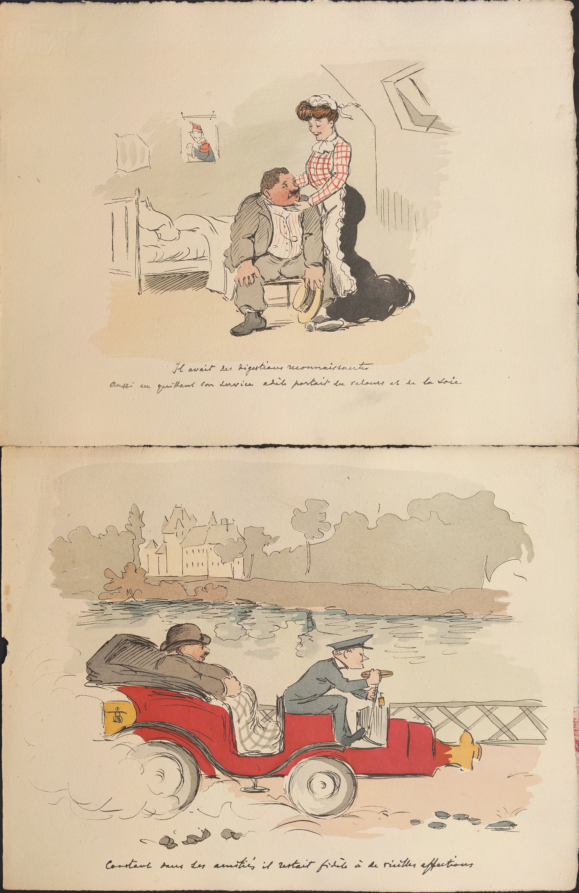Suite de 9 scènes humoristiques gravées et coloriées au pochoir d’époque, légendées, années 1910-1920, 25 x 32 cm ;