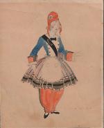« Pour Cocotte de la Halle », encre et aquarelle, signé en bas à droite, 15,5 x 12,5 cm ; Dessin du costume de cantinière de Cocotte à La Fête au village de Montmartre de 1932, fête de la République au Moulin de la Galette.