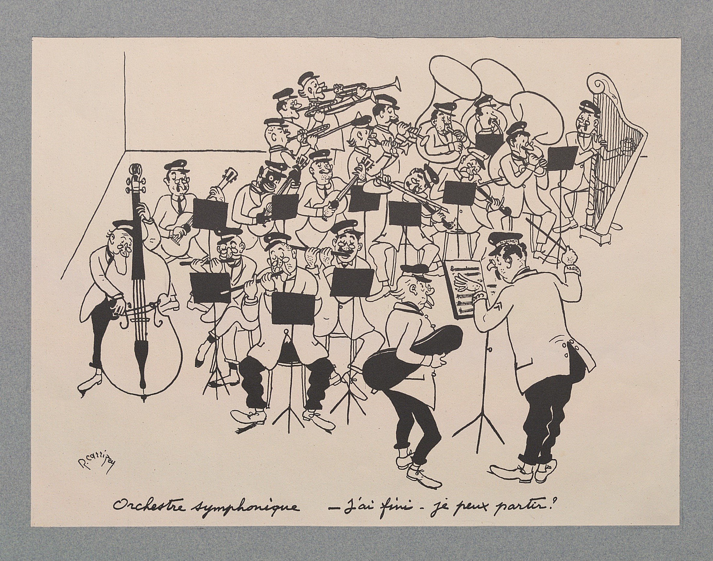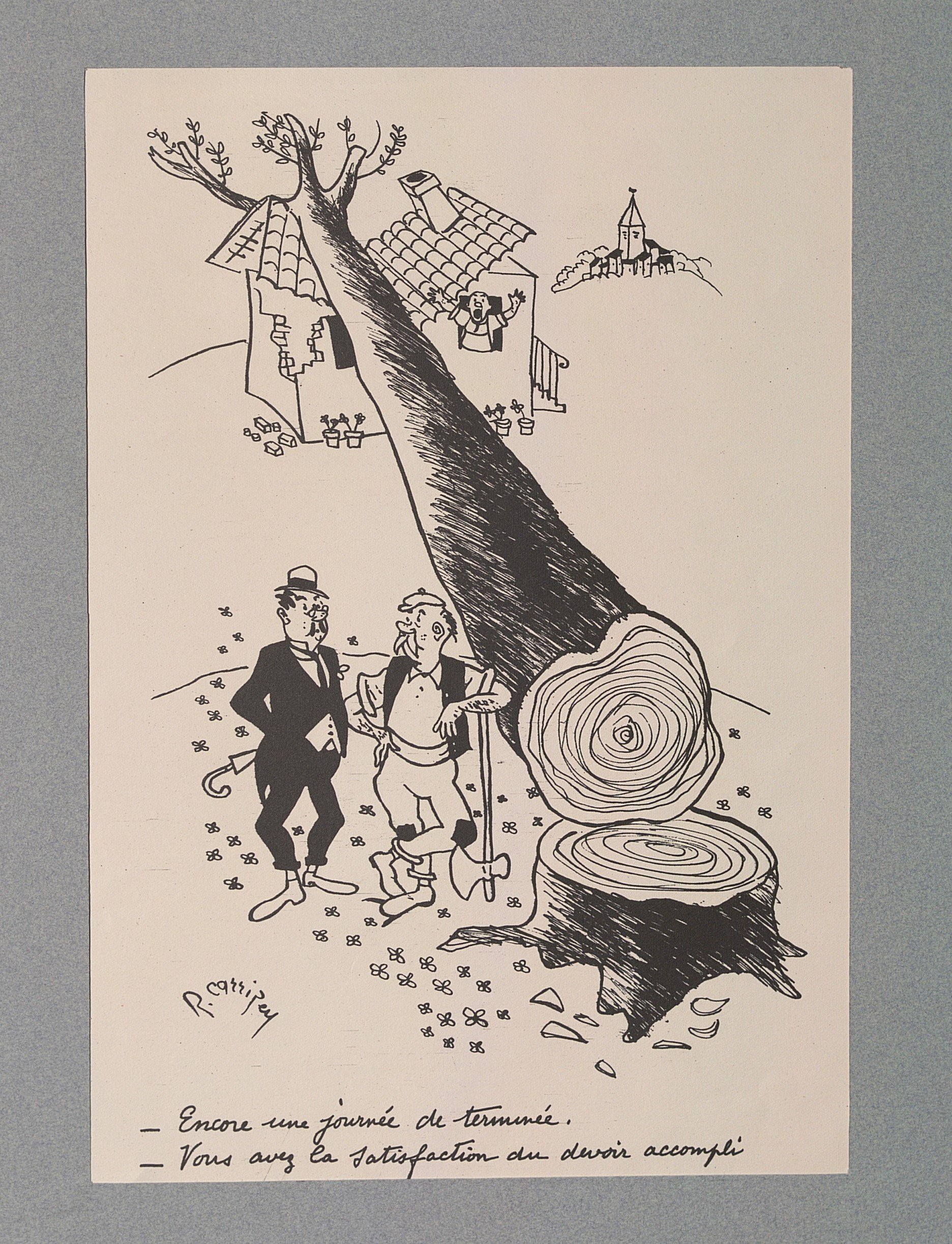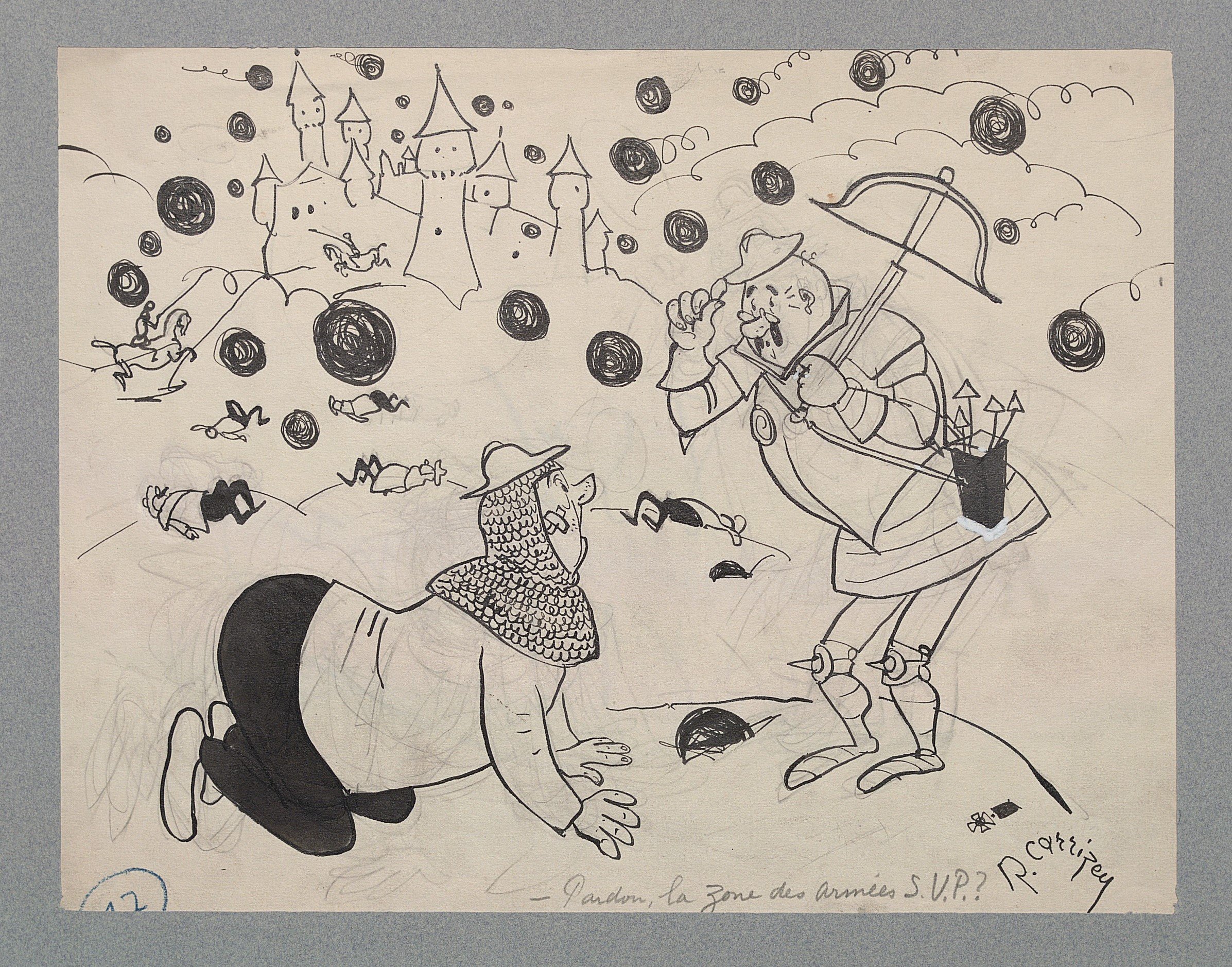 Pardon, la zone des armées SVP, légendé au crayon ; L’accident de voiture, légendé à l’encre ; L’orchestre symphonique, légendé à l’encre ; Le dialogue de sourd, légendé à l’encre ; Le bûcheron, légendé à l’encre.