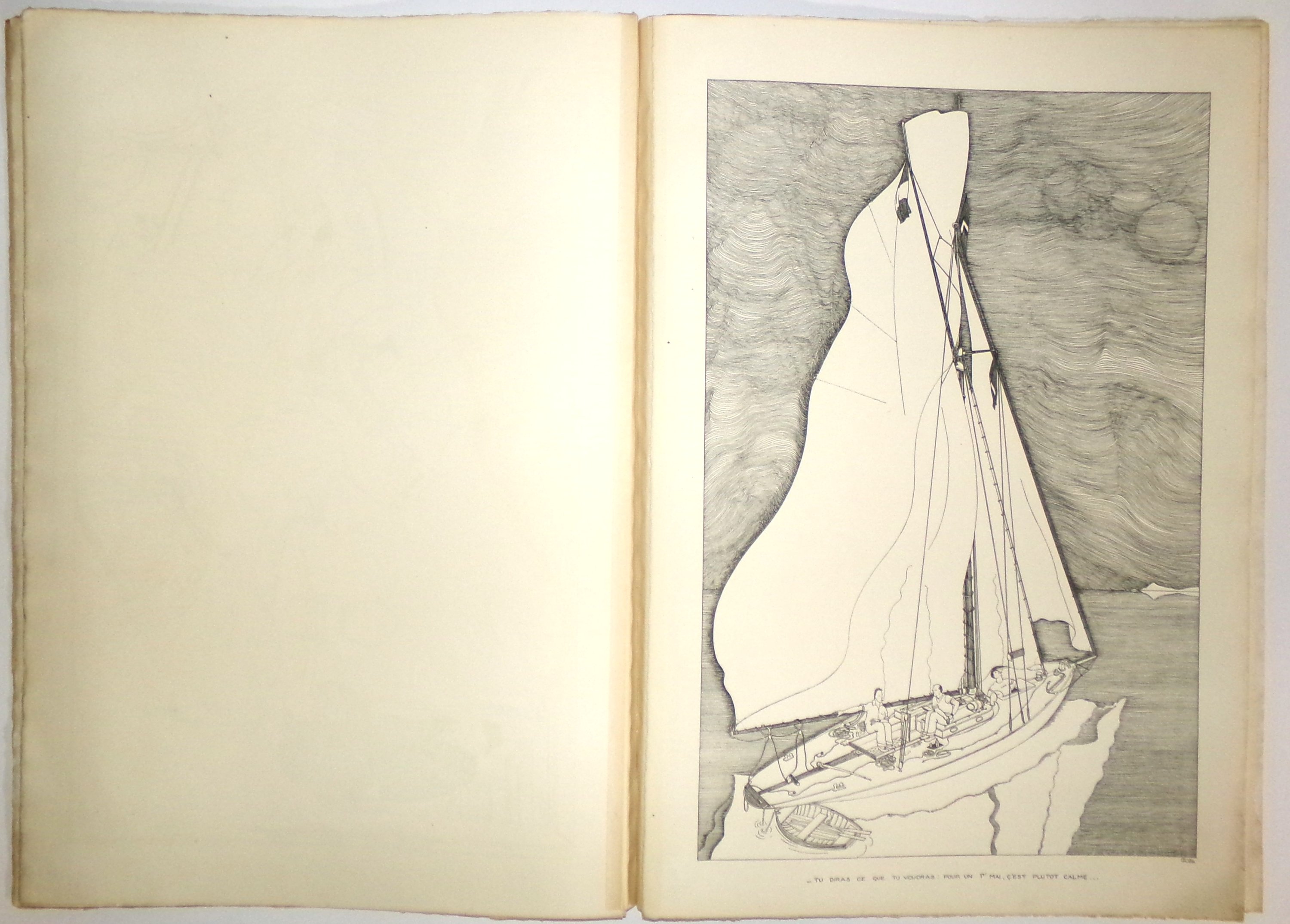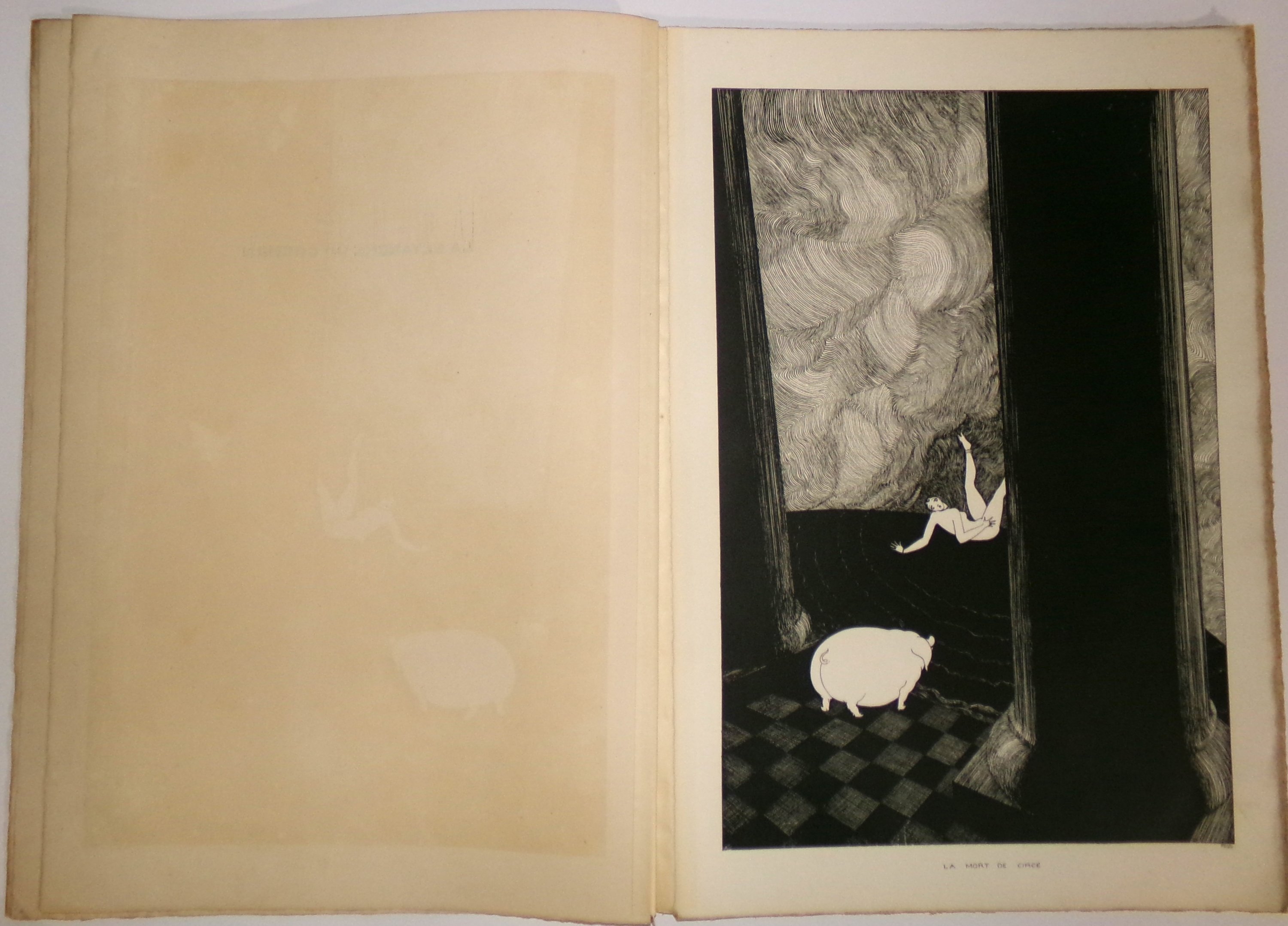 Grand in-folio, broch., [3]ff., 12 planches en noir, l'ensemble monté sur onglets, couverture imprimée de l'éditeur (dos factice, couverture salie), bel exemplaire (intérieur propre). Un des 750 exemplaires avec les illustrations sur papier d’Arches, non numéroté. Surprenant ouvrage qui comporte plusieurs critiques de la part de l'illustrateur Paul Iribe (1883-1935): charge contre le cubisme, manifeste dès la première planche qui figure la mort de la magicienne Circé, qui avait métamorphosé les compagnons d'Ulysse en pourceaux. " Circé incarne pour Iribe la ligne courbe et l'esthétique fin-de-siècle au sein de laquelle il fit oeuvre, le cochon l'expansion déraisonnée de la géométrie et du cubisme qu'il abhorre" ; l'album est par ailleurs dédié " A Sircé ". Réalisé au retour des Etats-Unis, La mort de Circé sonne également le glas de l'aventure hollywoodienne et de la collaboration avec le réalisateur Cecil B. DeMille ; Iribe démontre son ressentiment à l'égard des américains et mais également, tel Ulysse qui rentre de son Odyssée malheureuse, à bord du paquebot " l'Ile est Vilaine "- comprendre Manhattan - envers sa Pénélope qu'il retrouve endorm ie auprès de son amant. (Paul Iribe, précurseur de l'art déco, Mairie de Paris, Bibliothèque Fornay, Hôtel de Sens, 1983, n° 265. Mythes de la décadence sous la direction d'Alain Montandaon, PU Blaise Pascal, 2001, pp. 119-120).