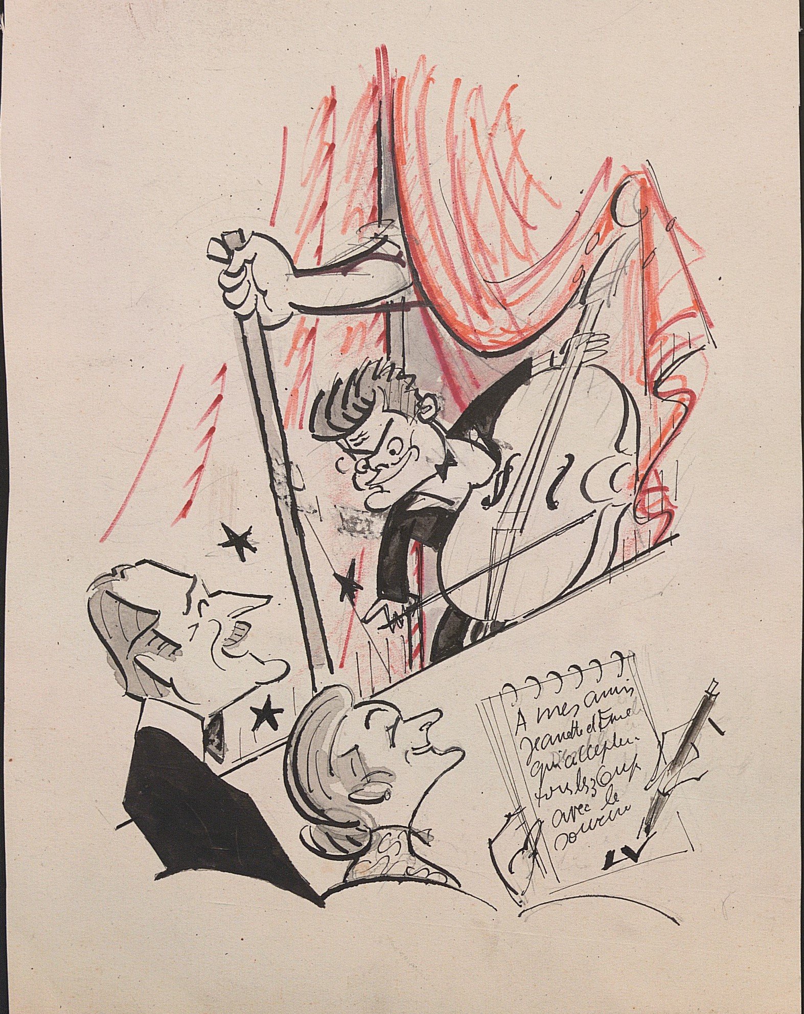 « A mes amis Jeannette et Emeline qui acceptent tous les 3 coups avec le sourire », encre, signée, 27,5 x 21,5 cm ;