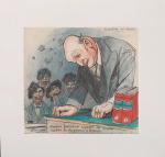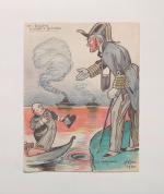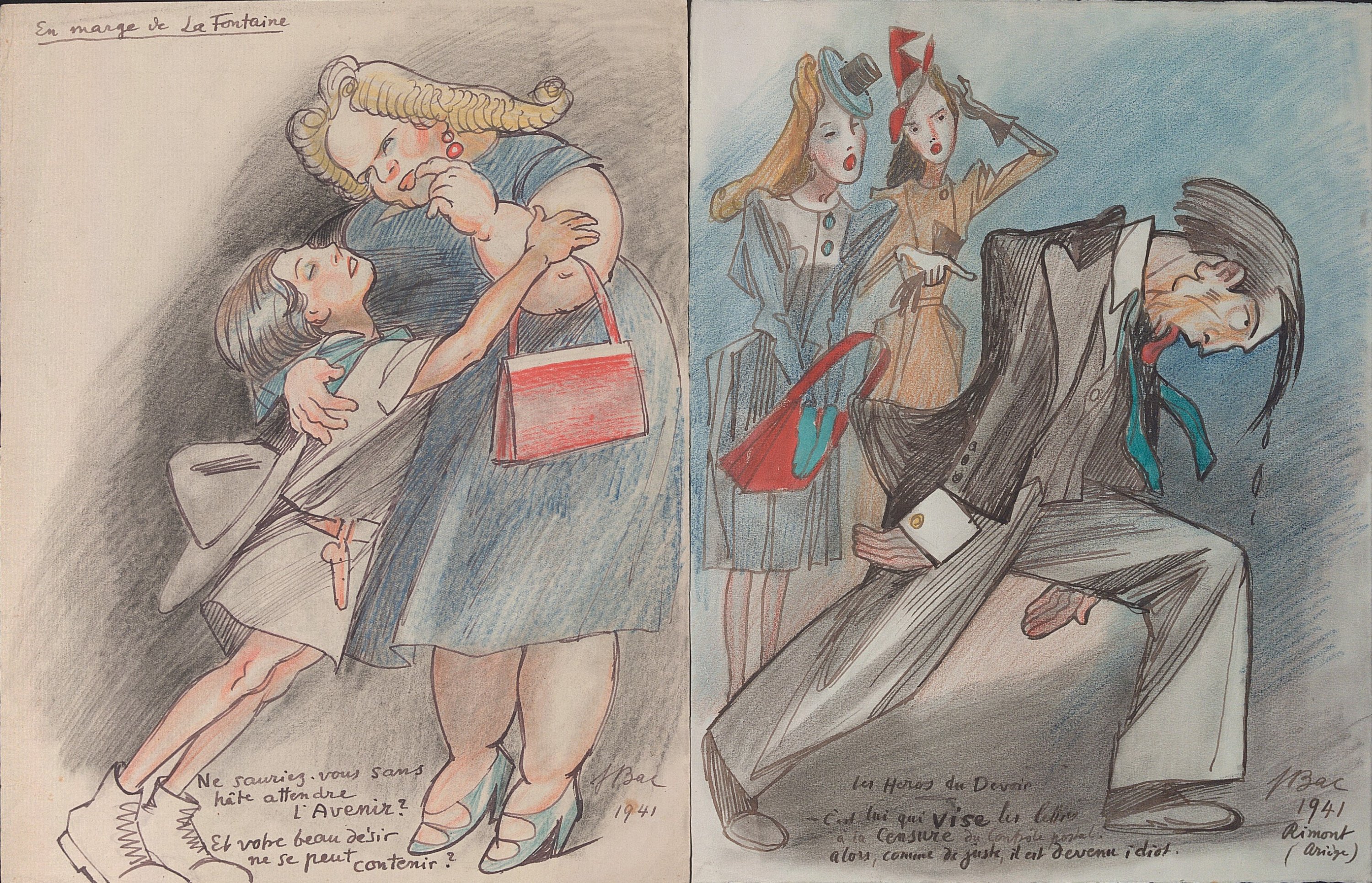 Les héros du Devoir, encre, fusain et crayons de couleurs, sur papier, signé en bas à droite et daté 1941 à Rimont (Ariège), légendé à la plume: « C’est lui qui vise les lettres à la censure du contrôle postal. Alors, comme de juste, il est devenu idiot », 27 x 21 cm ;