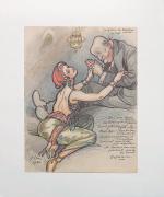 4 dessins relatifs au séjour au Maroc en juin et juillet 1940 d’Edouard Daladier, ancien président du Conseil, encre, aquarelle, gouache et crayons de couleurs, sur papier contrecollés sur carton, tous signés, datés « 1940 » et légendés, 27 x 21 cm ; face à la débâcle de l’armée française, 27 parlementaires décident de quitter la France en juin 1940 à bord du paquebot le Massilia pour rejoindre Casablanca au Maroc. De retour en France au début d’août 1940, Daladier est arrêté par le gouvernement de Vichy et transféré à Buchenwald ;