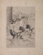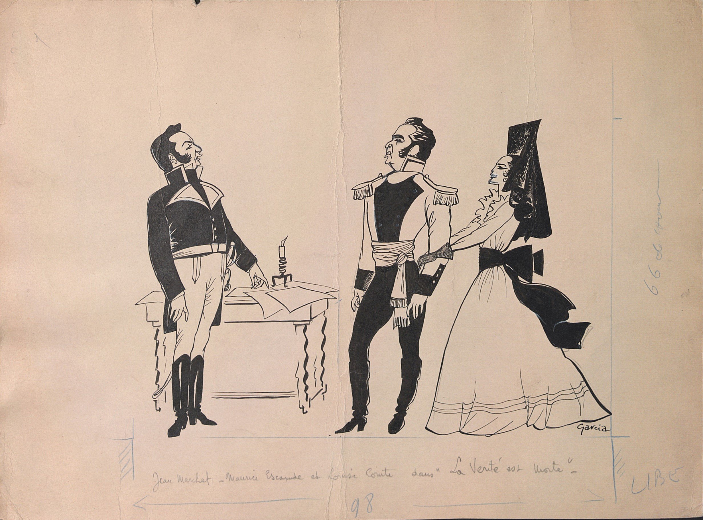 Garcia, 2 dessins à l’encre, signés, légendés, « Jean Marchat Maurice Escarude et Louise Comte dans La Vérité est morte » « R.J. Chauffard, Monique Delaroche, Sylvie Pelays et Michel Piccoli dans Les Naturels du Bordelais », 25 x 34 cm ; 2 dessins pour Libération, rubrique théâtre/spectacle ;
