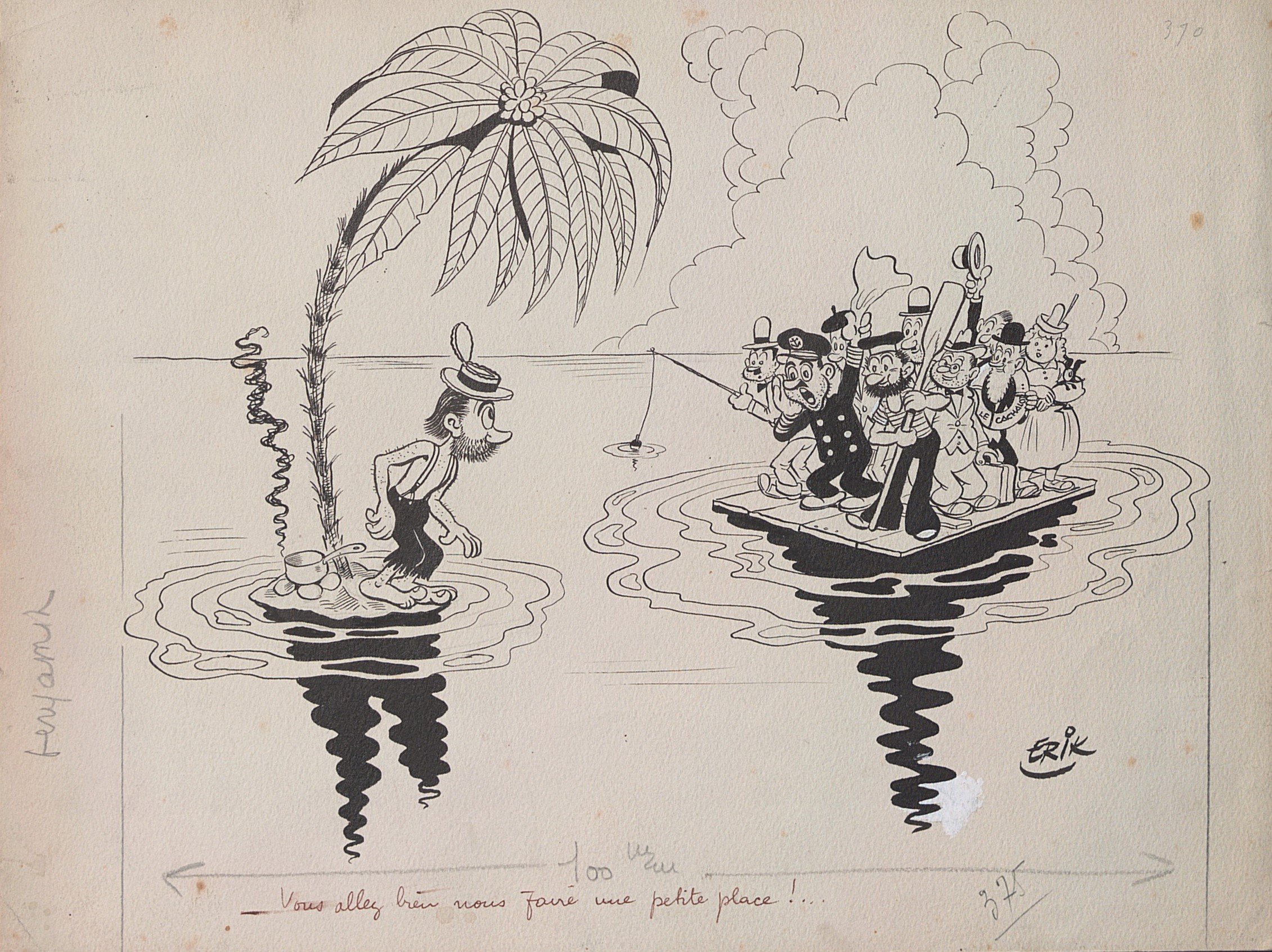 André Joly dit Erik (1912-1974), encre, signé, légendé « Vous allez bien nous faire une petite place! », 23,5 x 31,5 cm.