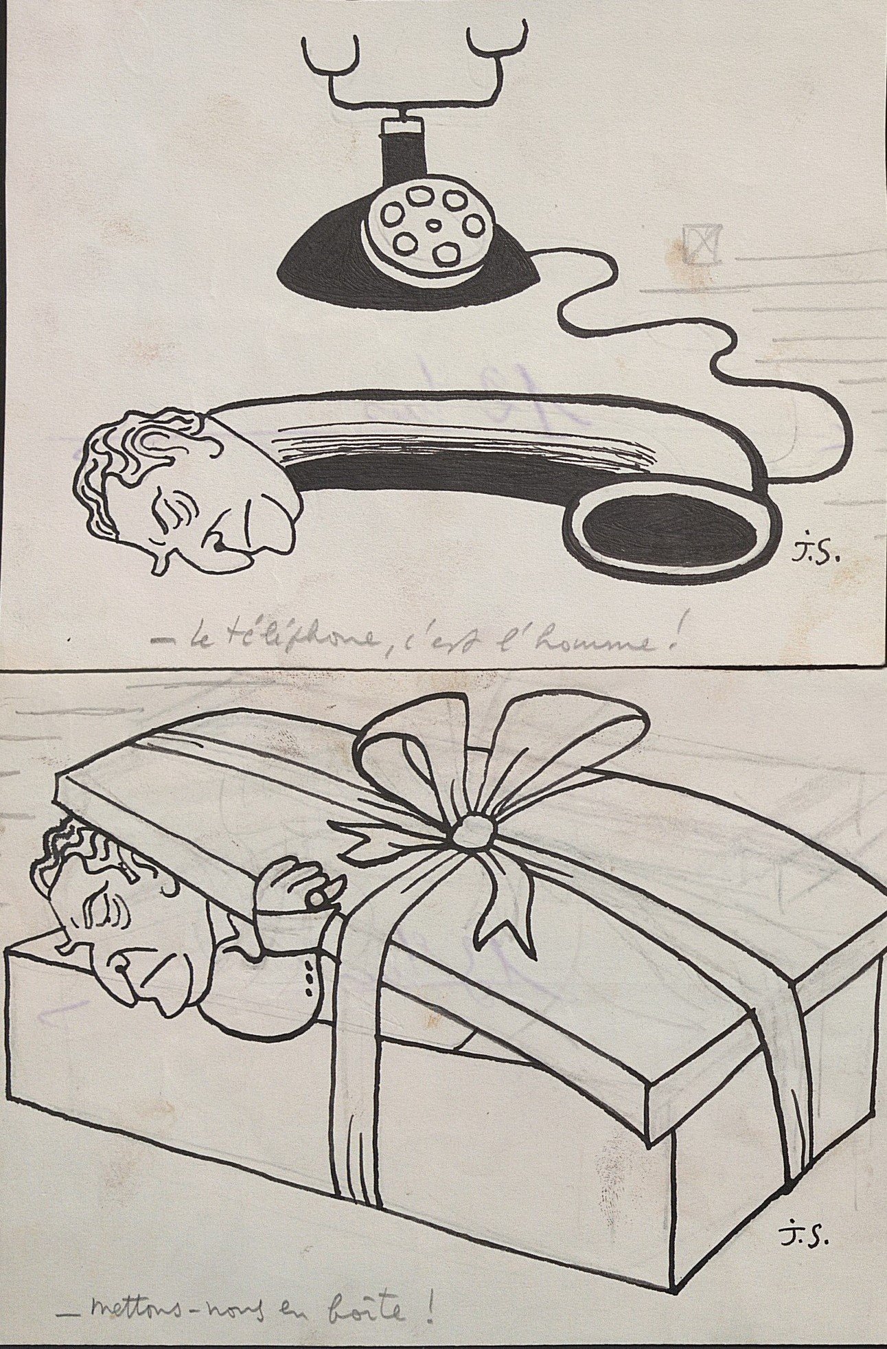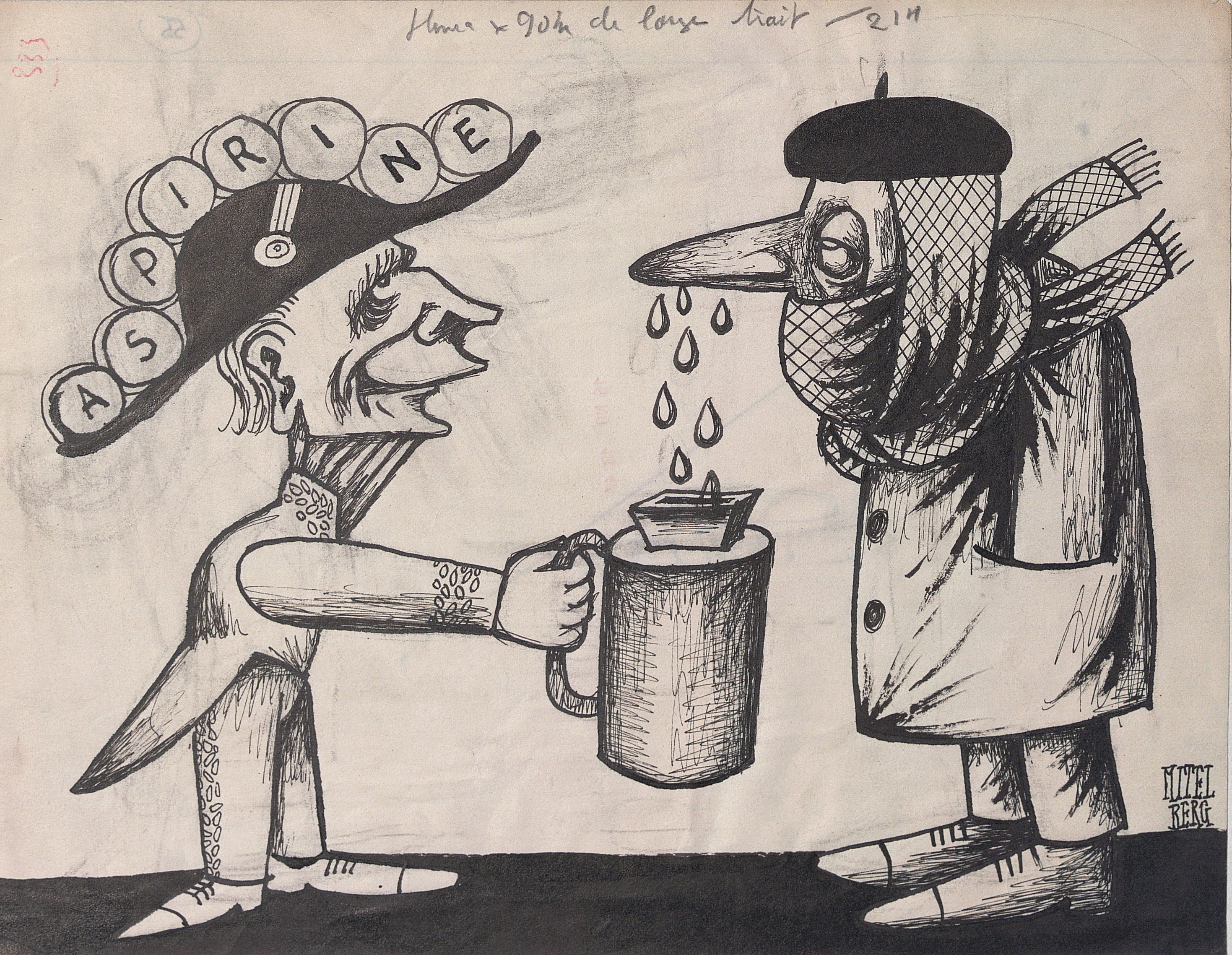 Louis Mitelberg (1919-2002), Aspirine et sans titre, encre, signé en bas à droite et en haut à gauche, contrecollés sur carton fort, 21 x 27 cm ;