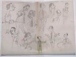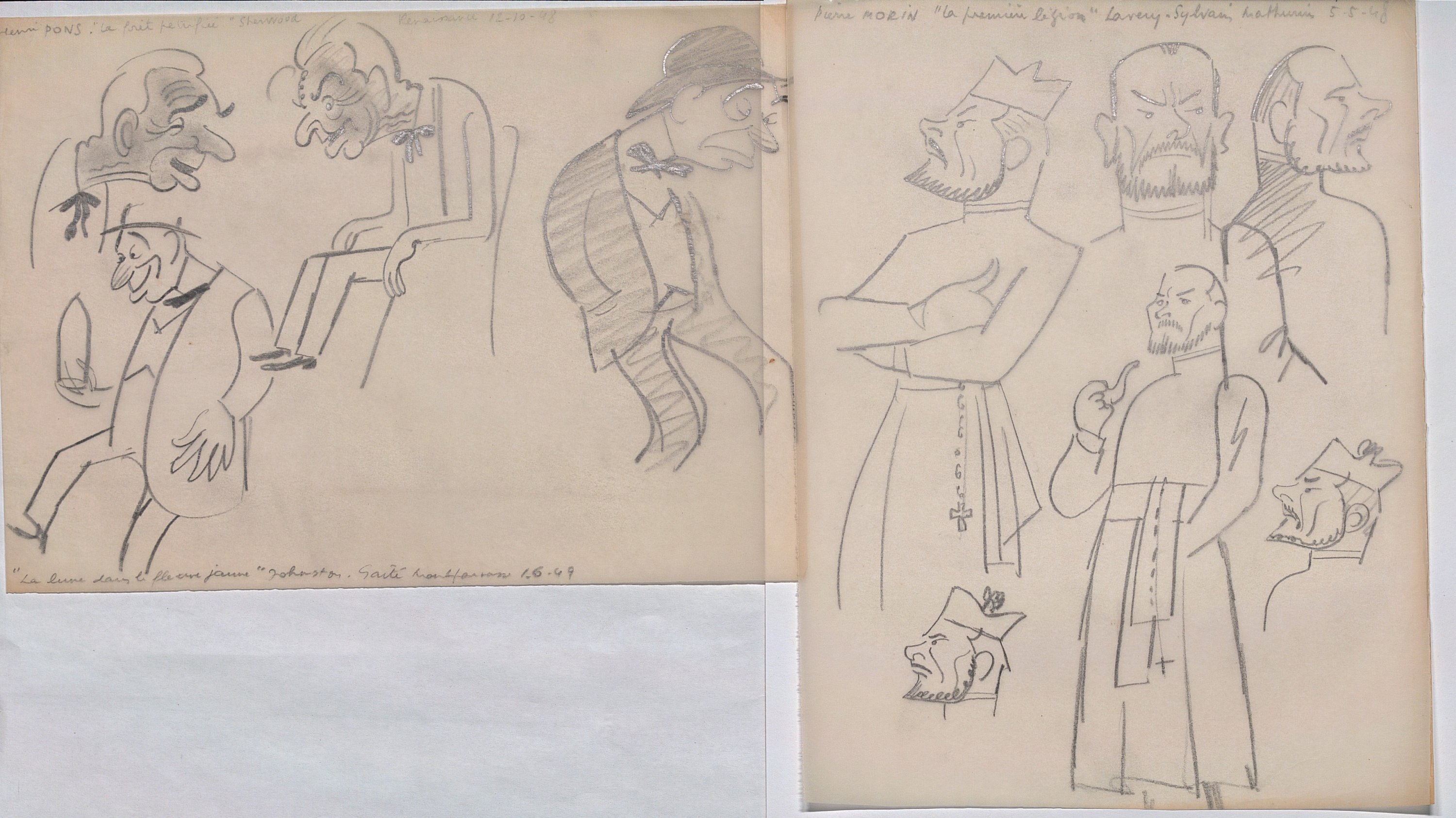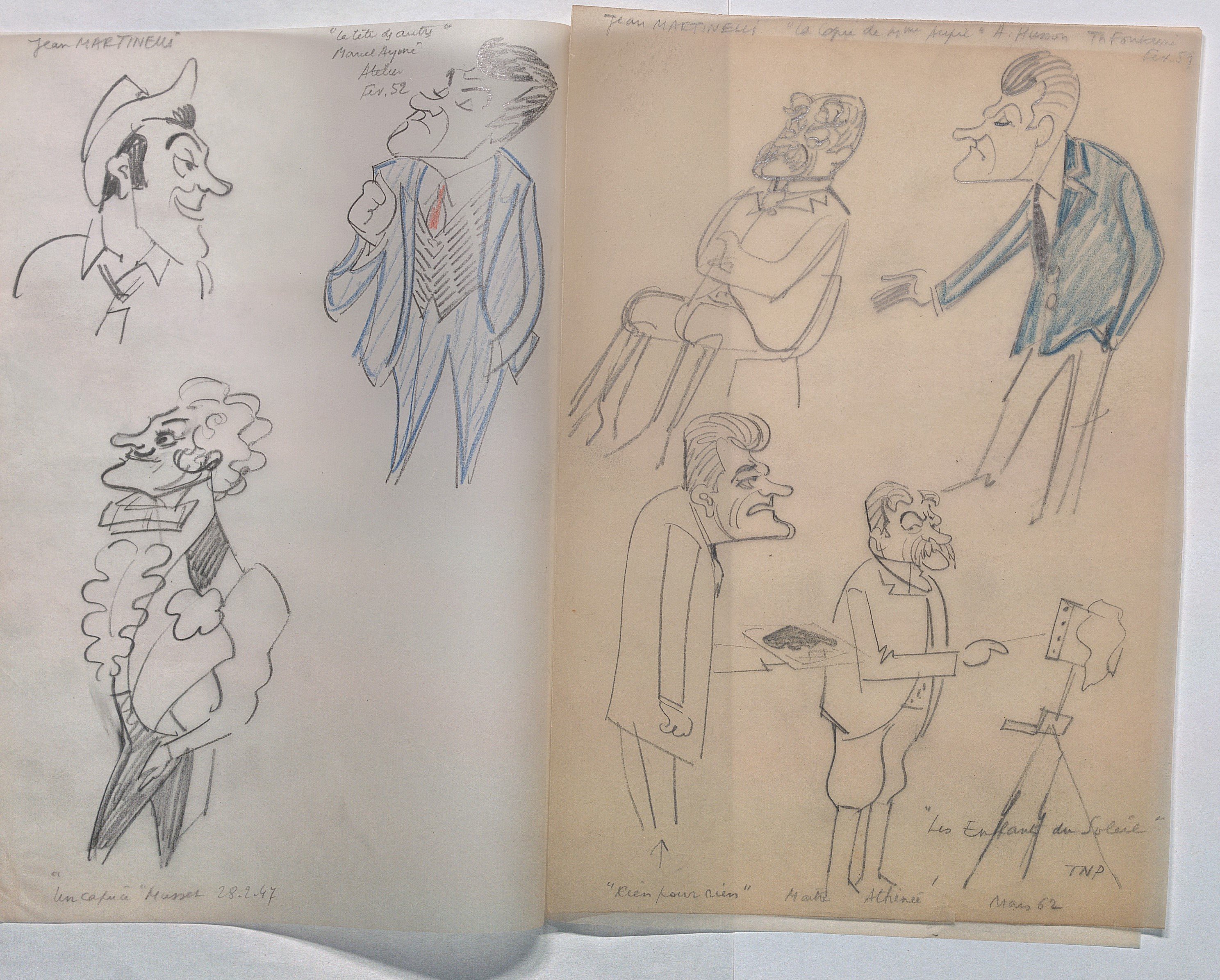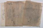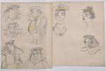 Réunion d’env. 175 calques, env. 30 x 21 cm, sur lesquels sont reproduits au crayon, certains à rehauts de couleurs, de multiples portraits caricaturés de personnalités majoritairement issues du monde du théâtre et du monde politique, années 1940-1970, légendés et datés. Ce rare ensemble de dessins pourrait être attribué à Luc Vincent, connu pour ses nombreux caricaturés du monde du spectacle, du sport et de la politique, illustrant de nombreux journaux d’après-guerre.