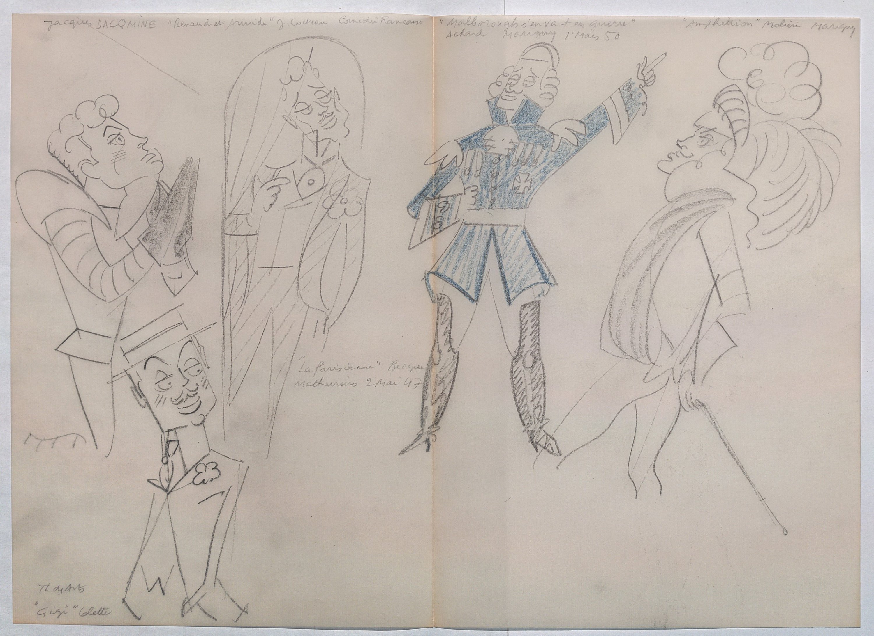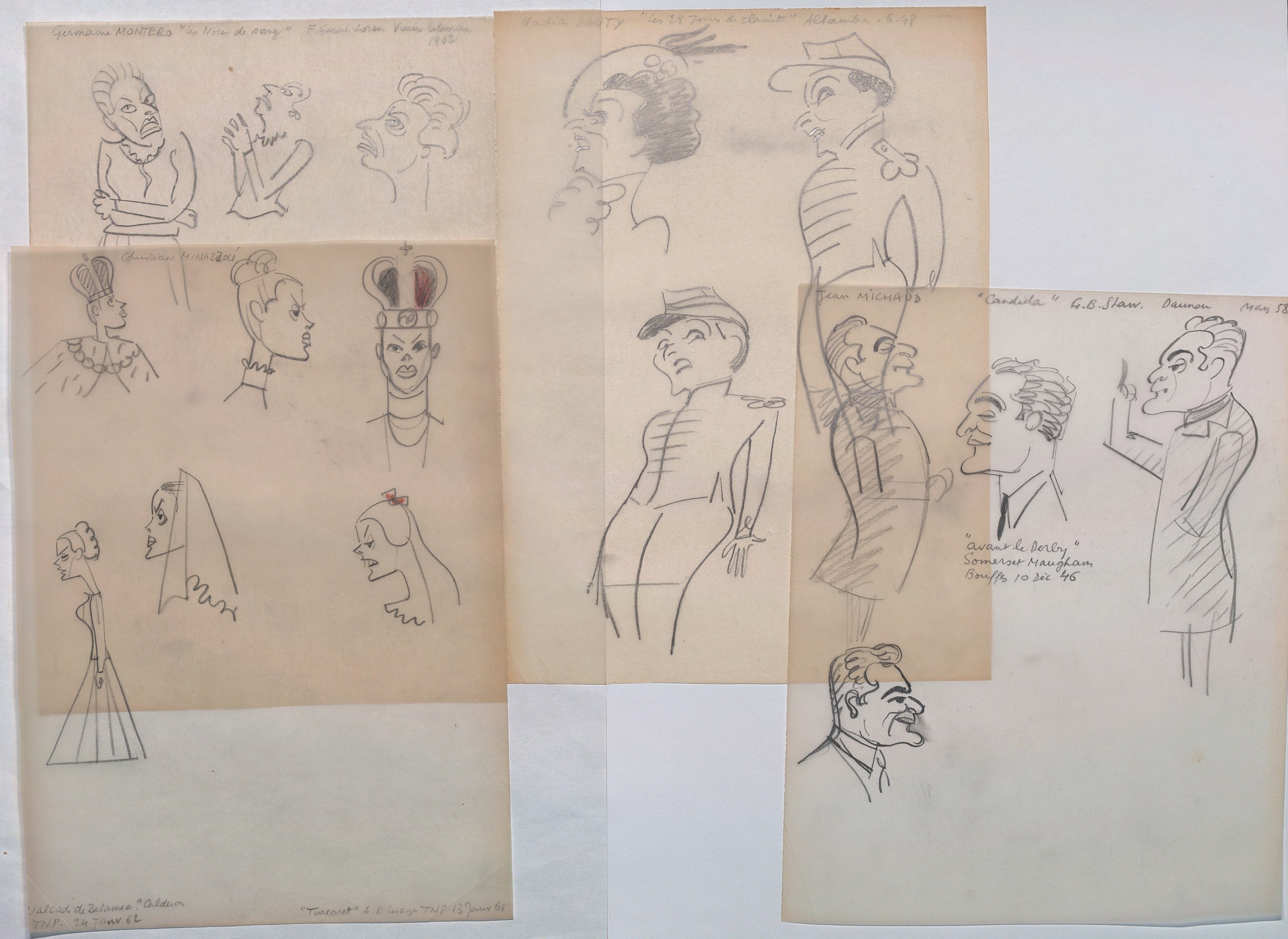 La plupart des croquis caricaturent des comédien/nes en représentation dans les théâtres parisiens (Michodière, Vieux Colombier, Capucines, La Coupole, Madeleine, Marigny, Renaissance, Folies bergères, Montparnasse, Mathurins, Athénée, etc).