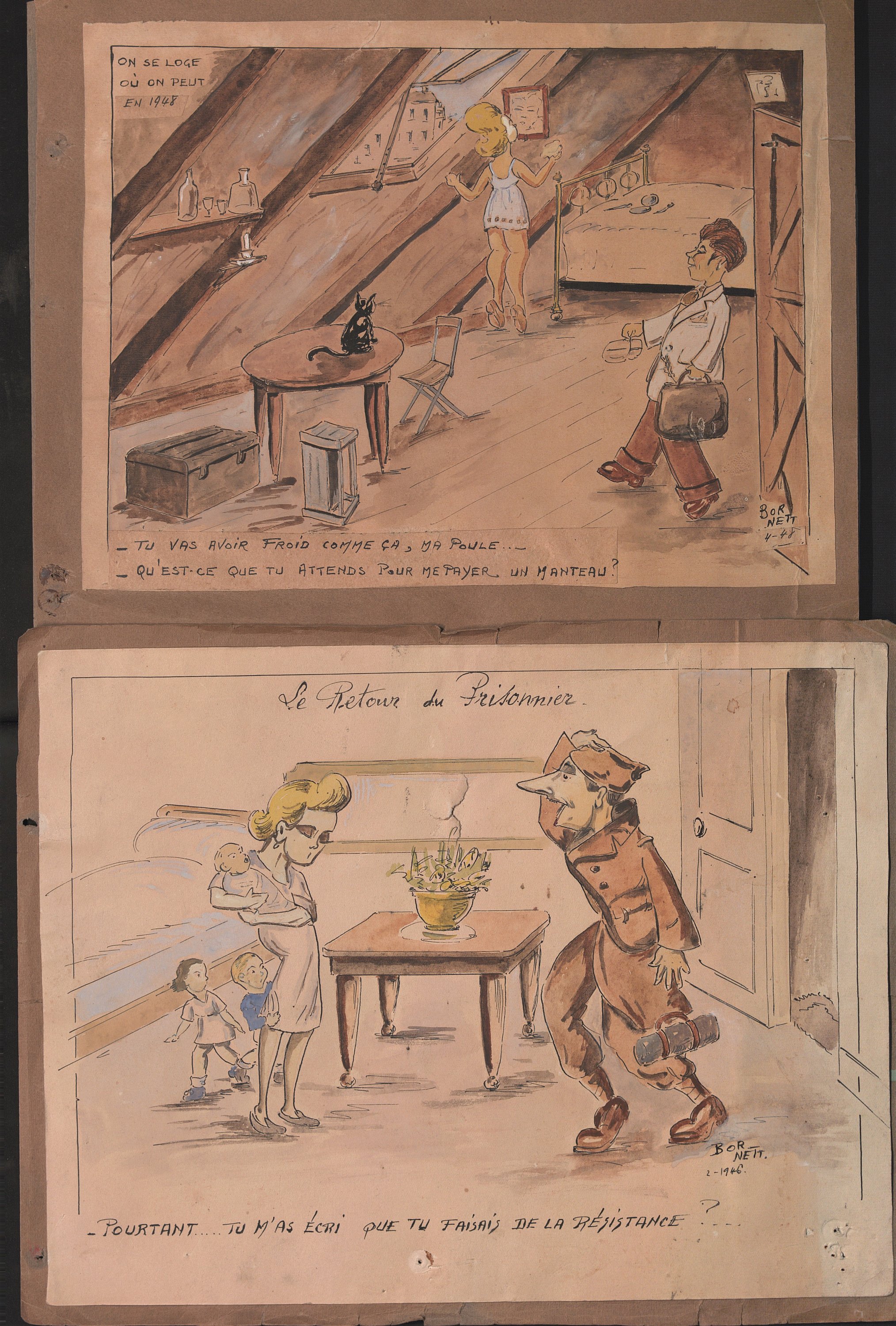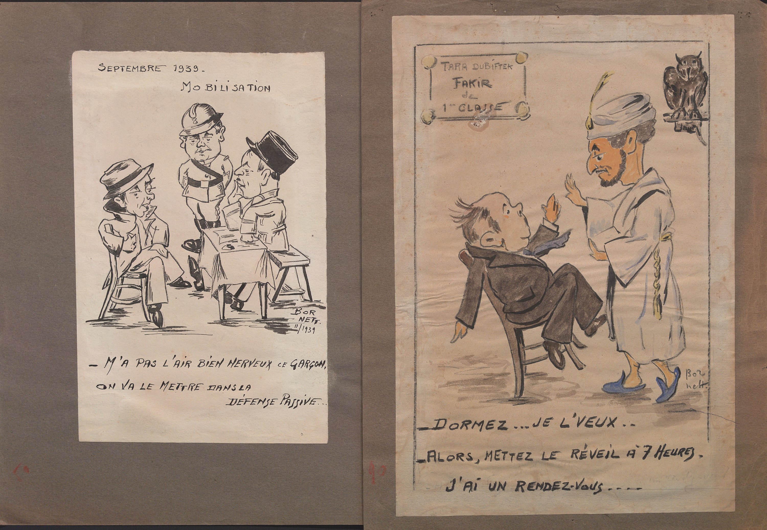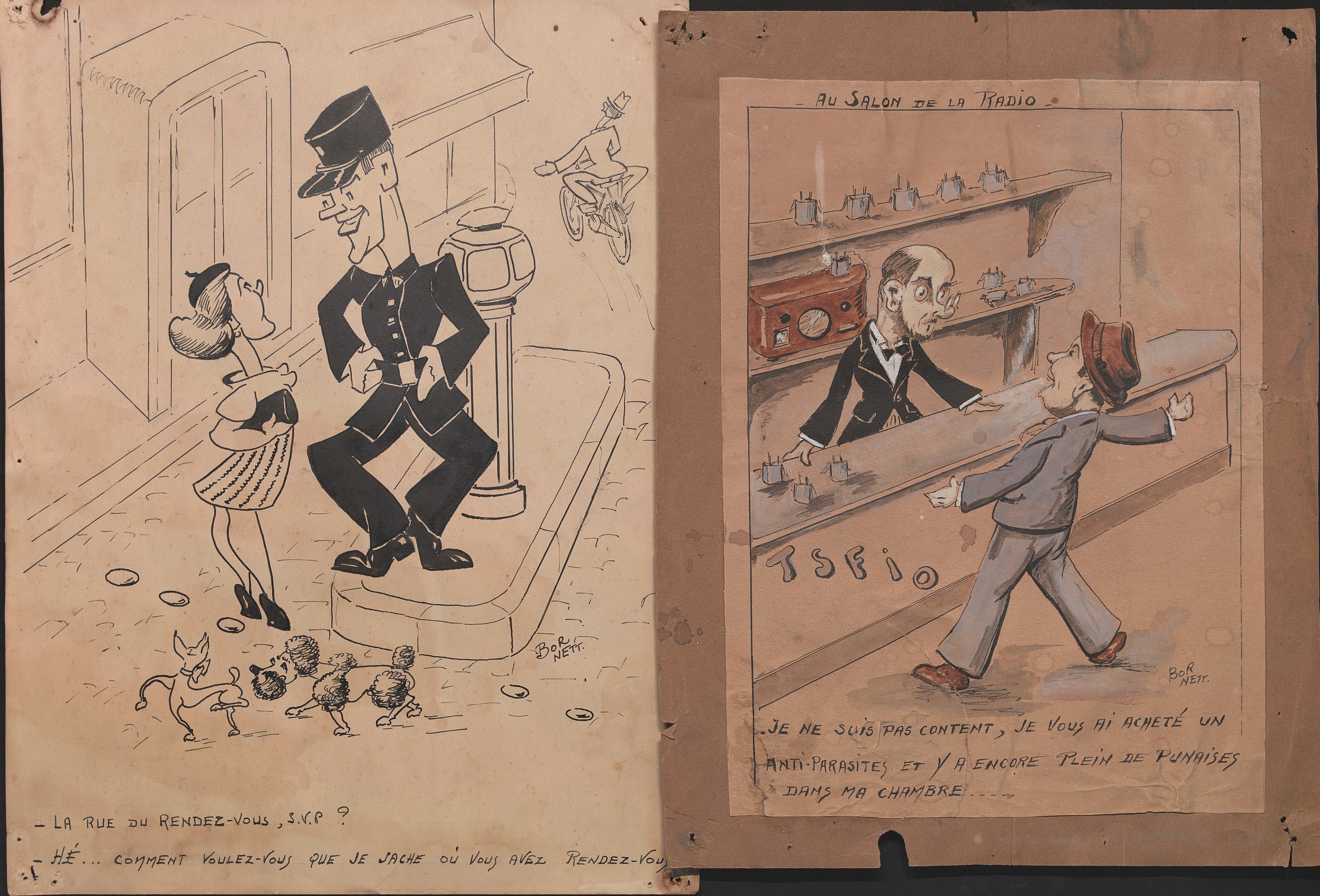 Qualifié dans la presse de la fin des années 1930 de chanteur caricaturiste humoriste des cabarets de la Butte, le Musée d’histoire contemporaine conserve une soixantaine de dessins humoristiques dont caricatures d’Adolf Hitler dit Dodoff, Joseph Darnand, Pierre Laval, etc.