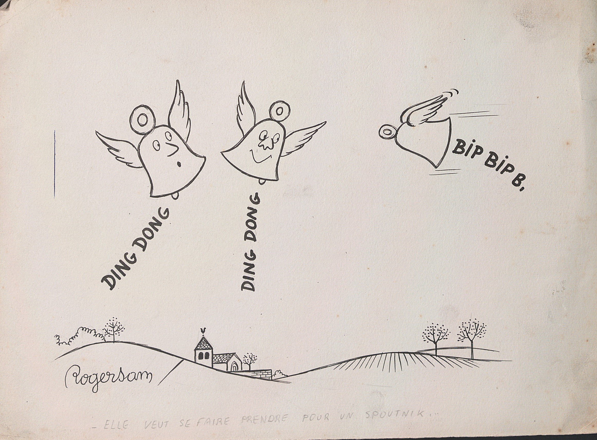 Les cloches, encre, signé en bas à droite, légendé au crayon « Elle veut se faire prendre pour un spoutnik », 24 x 32 cm ;
