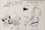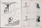 6 dessins de presse humoristiques et frivoles sur papier fort, encre, signés, légendés ou commentés sauf 3 sans parole, 25 x 16 cm.