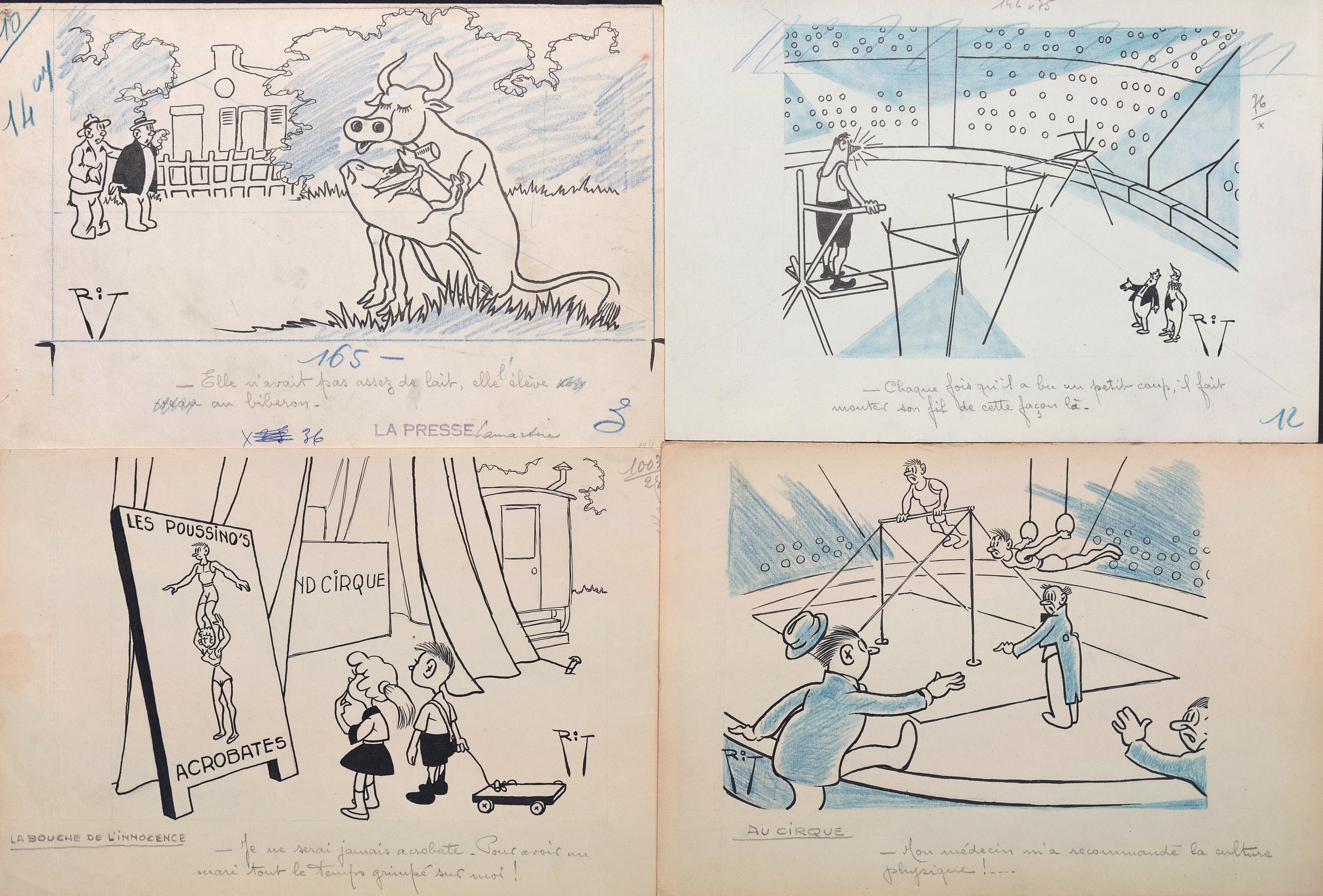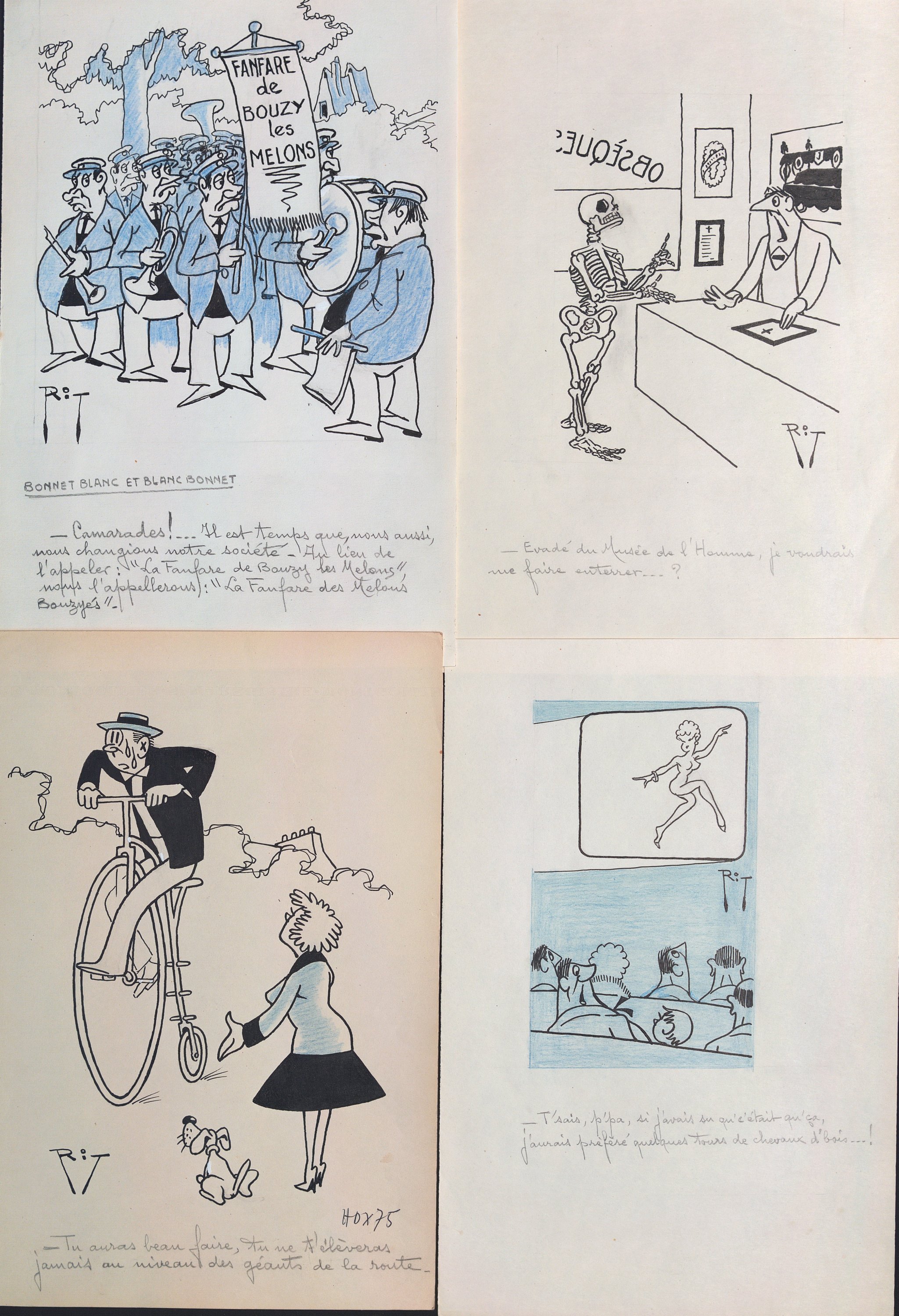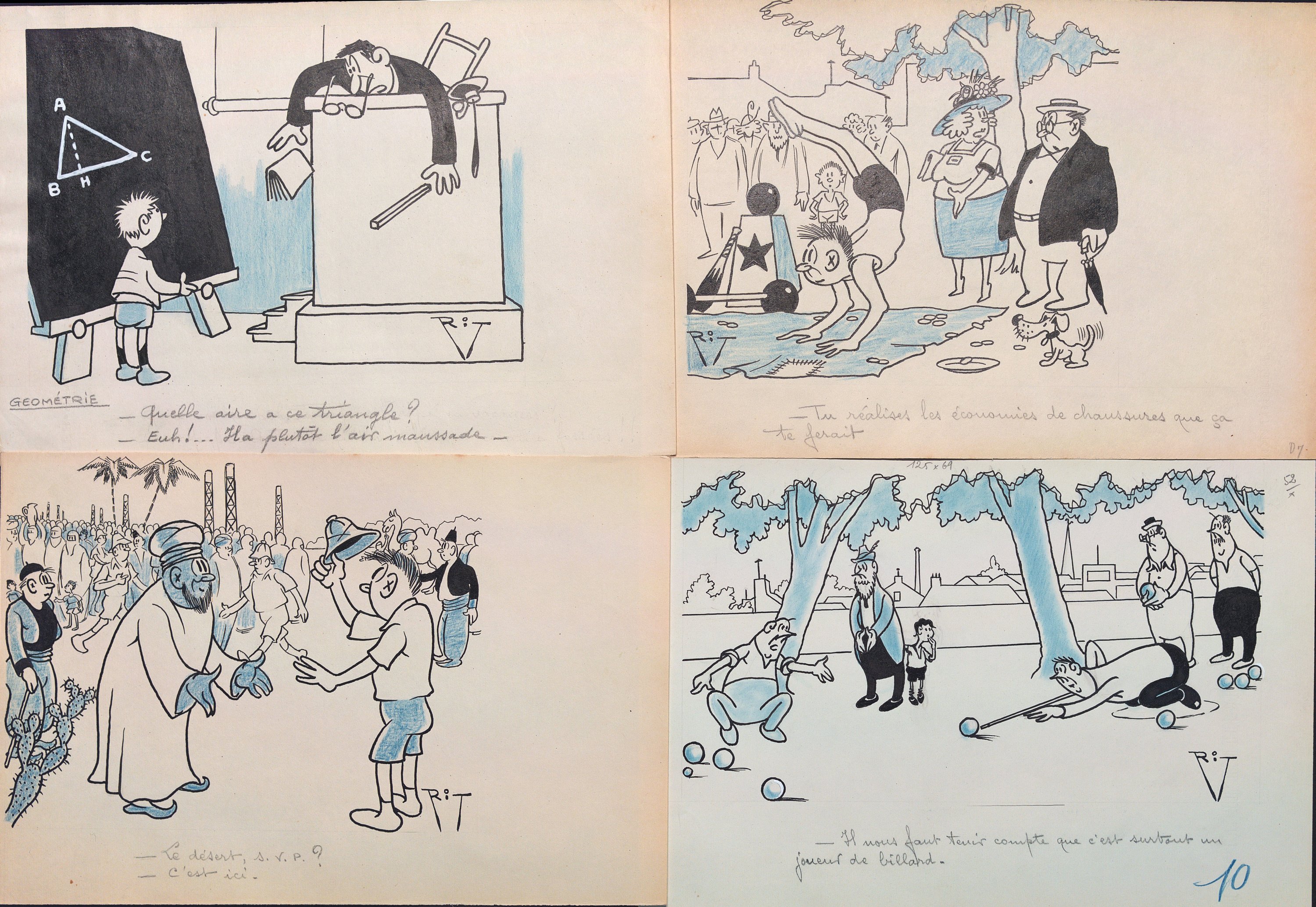 Maquettes destinées à la publication dans la presse satirique et humoristique tel que le journal « Franc-Rire » édité à partir de 1957 par André Rouff, dont: Au cirque ; La bouche de l’innocence ; Bonnet blanc et blanc bonnet ; Cent paroles ; Géométrie ; etc.