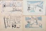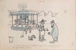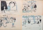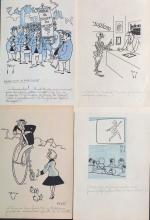 Lot de 14 dessins originaux humoristiques, années 1960/1970, encre rehaussés au crayon bleu sur papier épais, titres et citations manuscrites au crayon bois, signés, 19 x 28 cm.