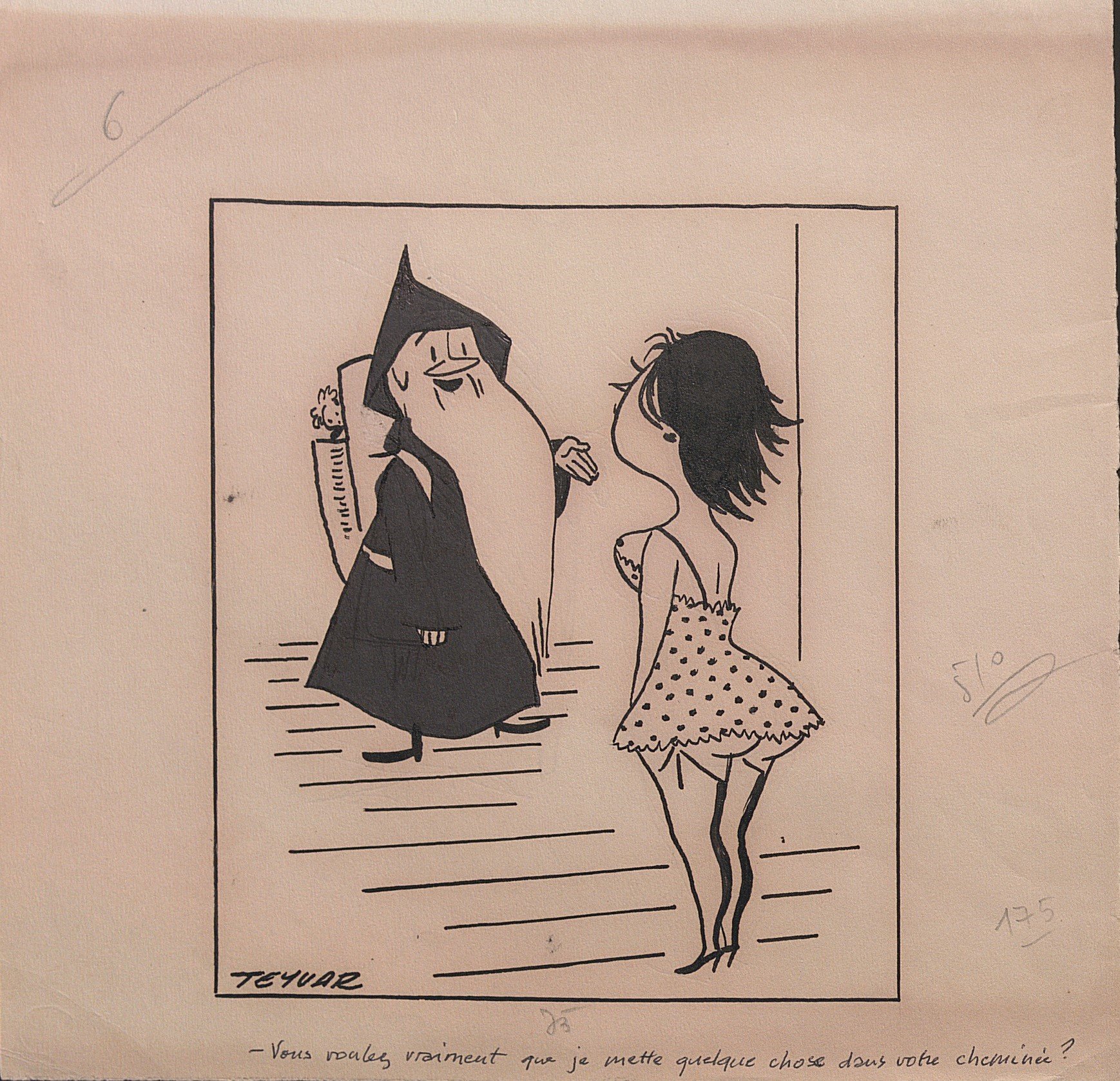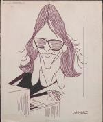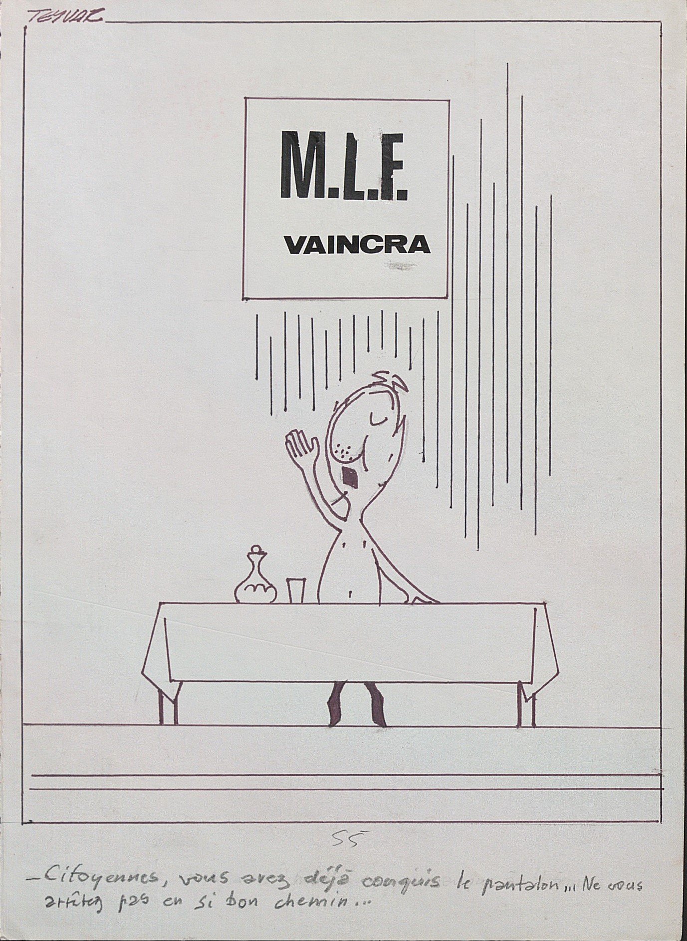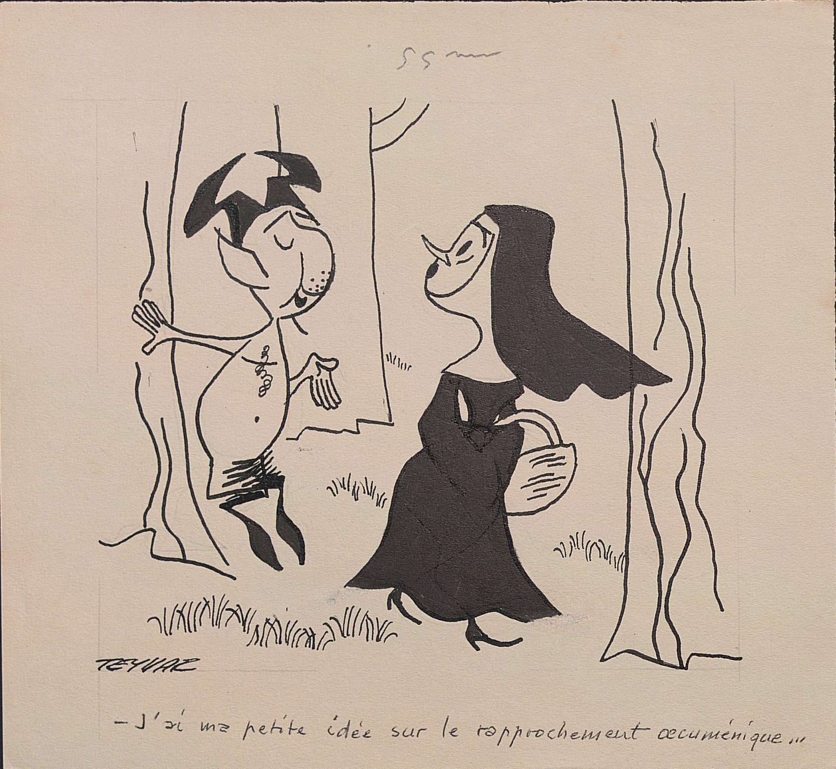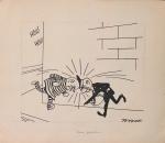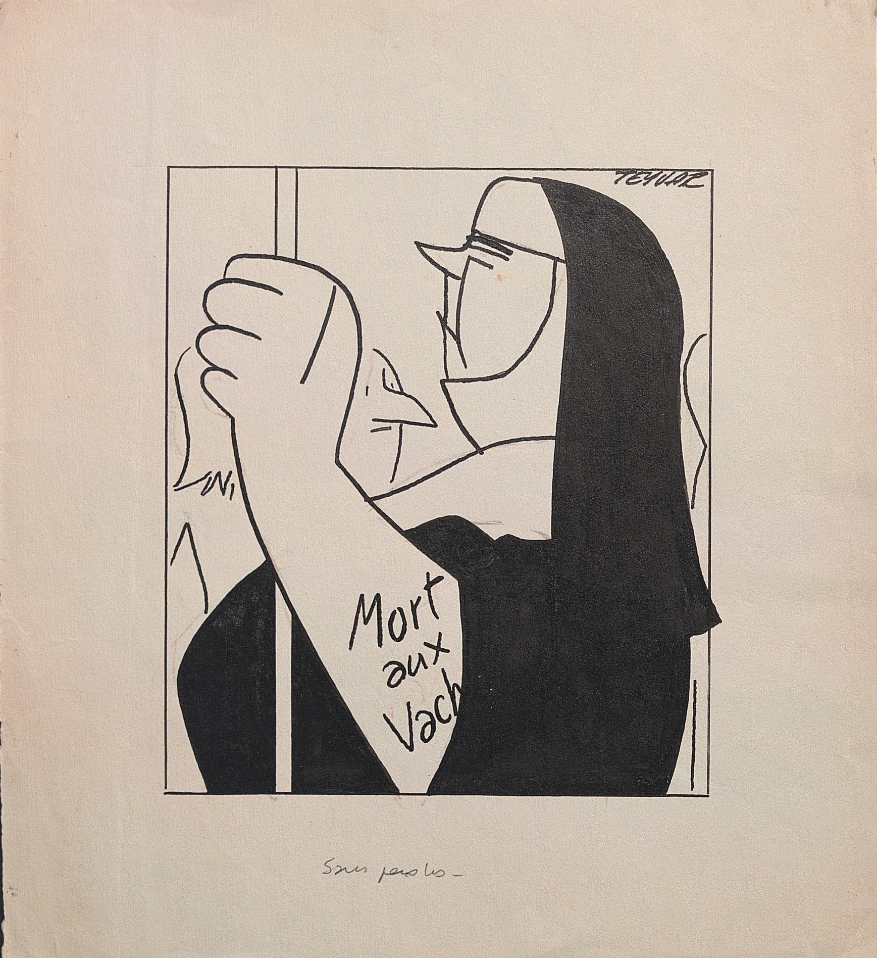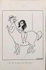 17 dessins de presse humoristiques et satiriques, encre, sur papier épais, signés, certains légendés, formats divers, dont: M.L.F. vaincra [Mouvement de libération des femmes], légendé au crayon « Citoyennes, vous avez déjà conquis le pantalon ne vous arrêtez pas en si bon chemin », 25,5 x 19 cm ; « J’ai ma petite idée sur le rapprochement œcuménique », 21,5 x 23 cm ; « Pile, je me marie face, je reste célibataire », 29 x 5 cm ; « Mort aux Vaches », 26 x 24 cm ; « Je voudrais tirer un petit coup », 25 x 28,5 cm ; « Vous voulez vraiment que je mette quelque chose dans votre cheminée? », 23,5 x 24 cm ; « Fin de saison », 28,5 x 25 cm ; portrait-charge de Gilbert Montagné, Dalida ; etc.