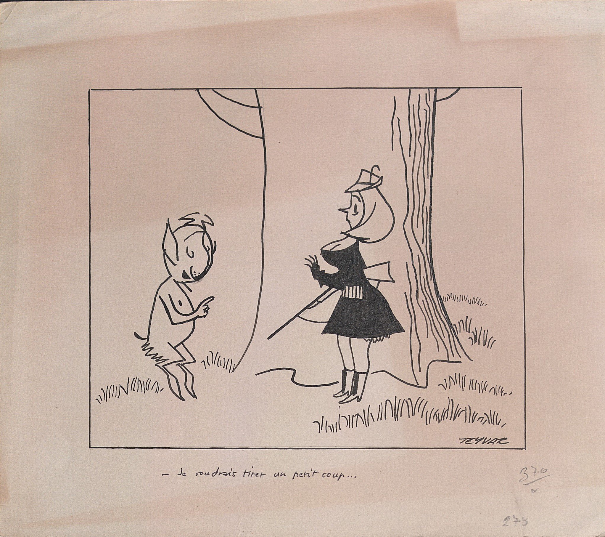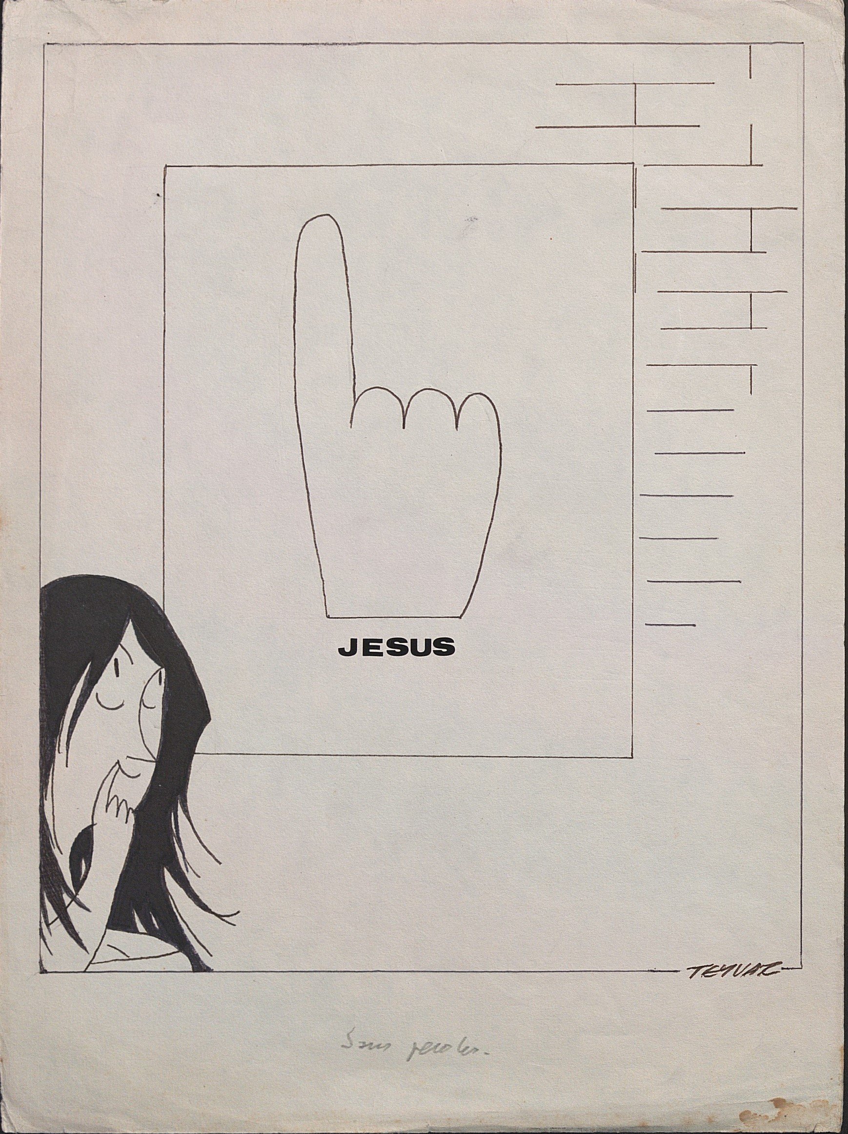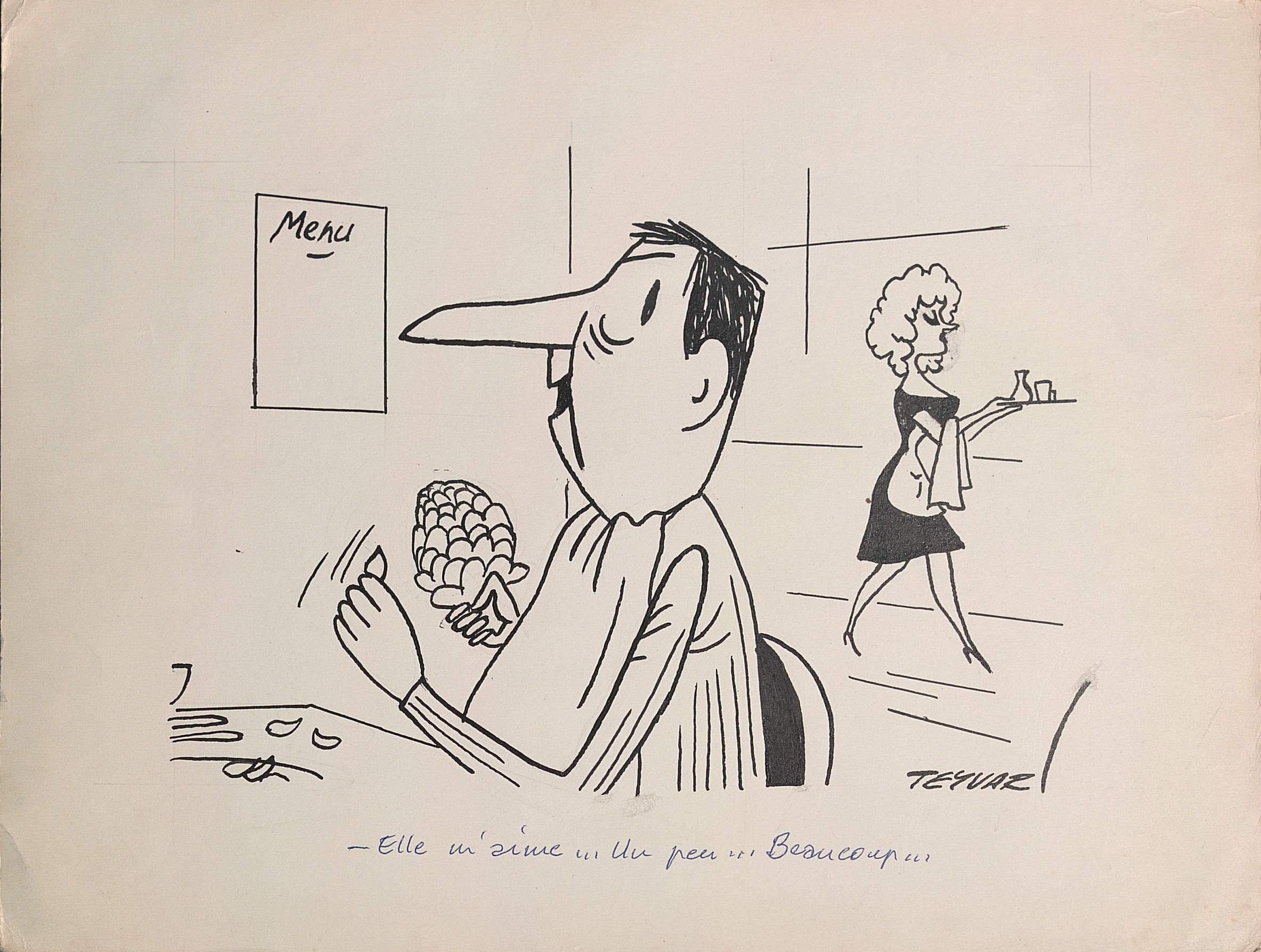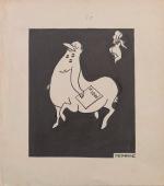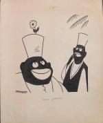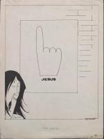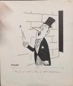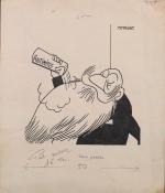 17 dessins de presse humoristiques et satiriques, encre, sur papier épais, signés, certains légendés, formats divers, dont: M.L.F. vaincra [Mouvement de libération des femmes], légendé au crayon « Citoyennes, vous avez déjà conquis le pantalon ne vous arrêtez pas en si bon chemin », 25,5 x 19 cm ; « J’ai ma petite idée sur le rapprochement œcuménique », 21,5 x 23 cm ; « Pile, je me marie face, je reste célibataire », 29 x 5 cm ; « Mort aux Vaches », 26 x 24 cm ; « Je voudrais tirer un petit coup », 25 x 28,5 cm ; « Vous voulez vraiment que je mette quelque chose dans votre cheminée? », 23,5 x 24 cm ; « Fin de saison », 28,5 x 25 cm ; portrait-charge de Gilbert Montagné, Dalida ; etc.