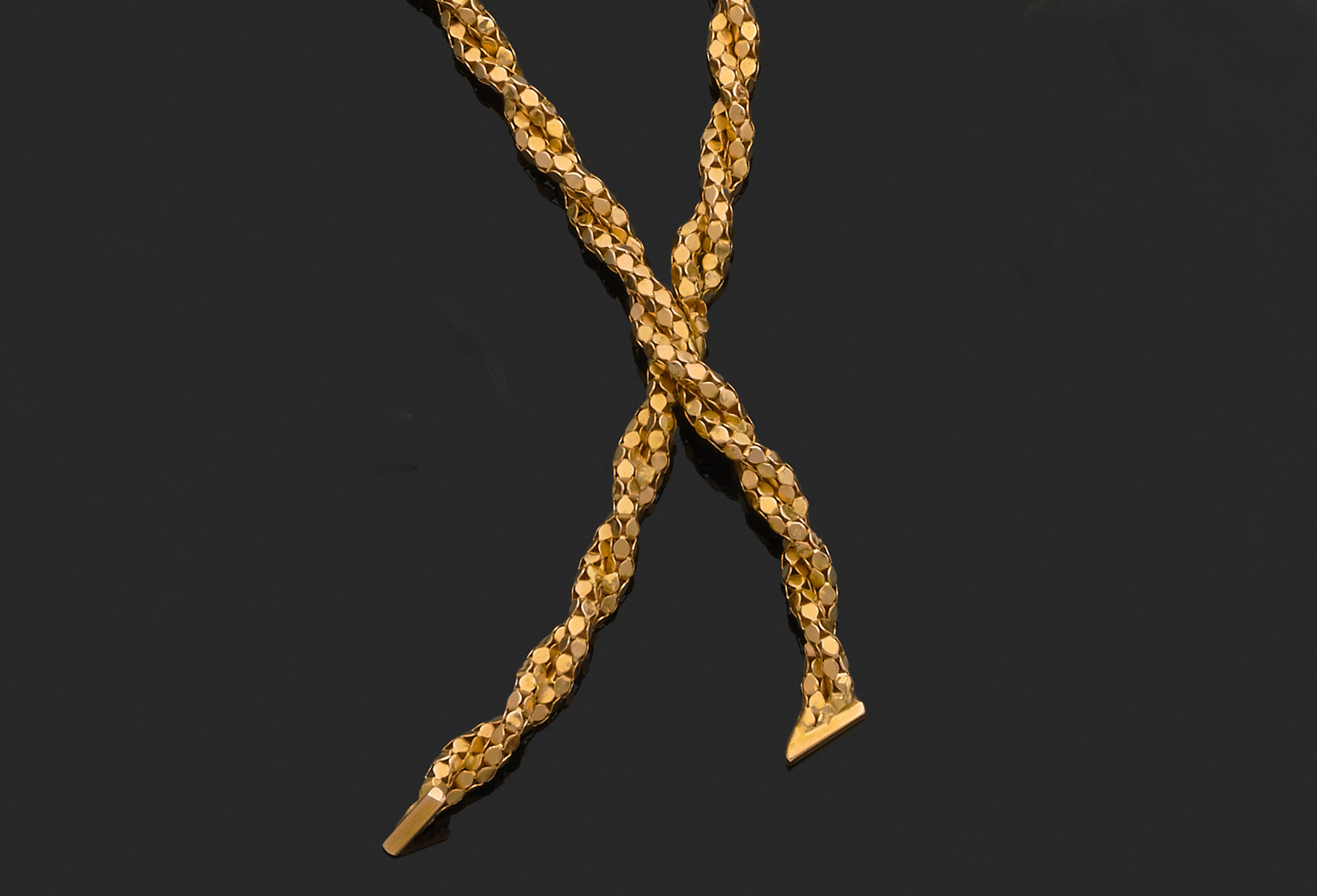 Or jaune 750 millièmes, figurant une torsade, le centre décoré de brins en pampille.