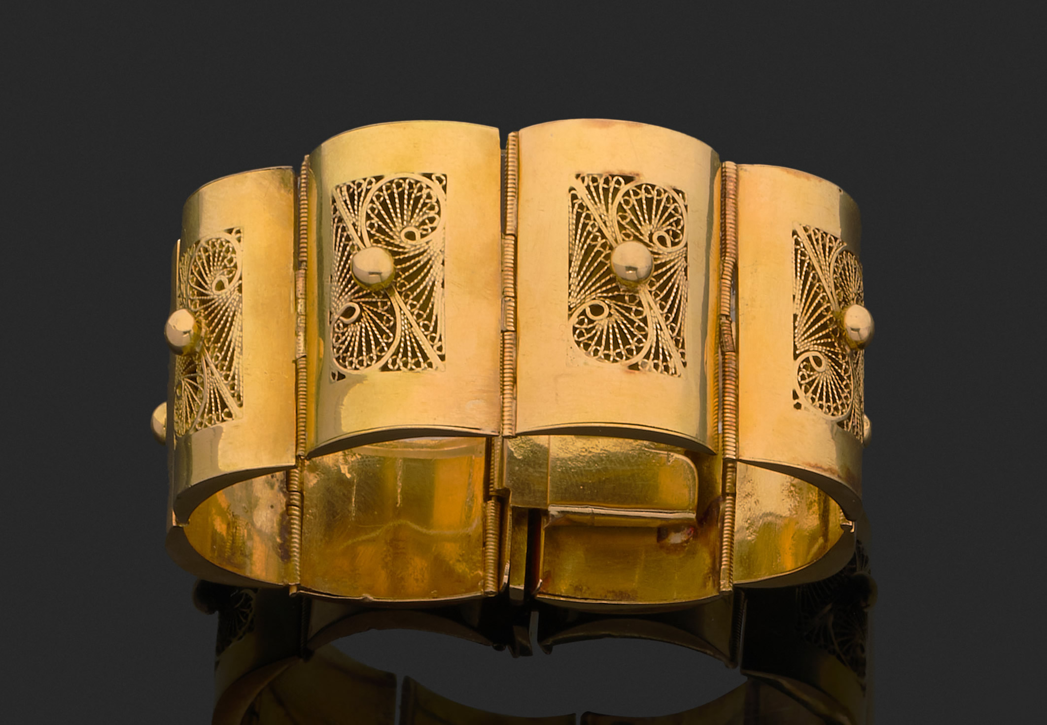 Or jaune 750 millièmes, les maillons de forme bombée, les centres à décor filigrané et ornés d'une boule d'or.