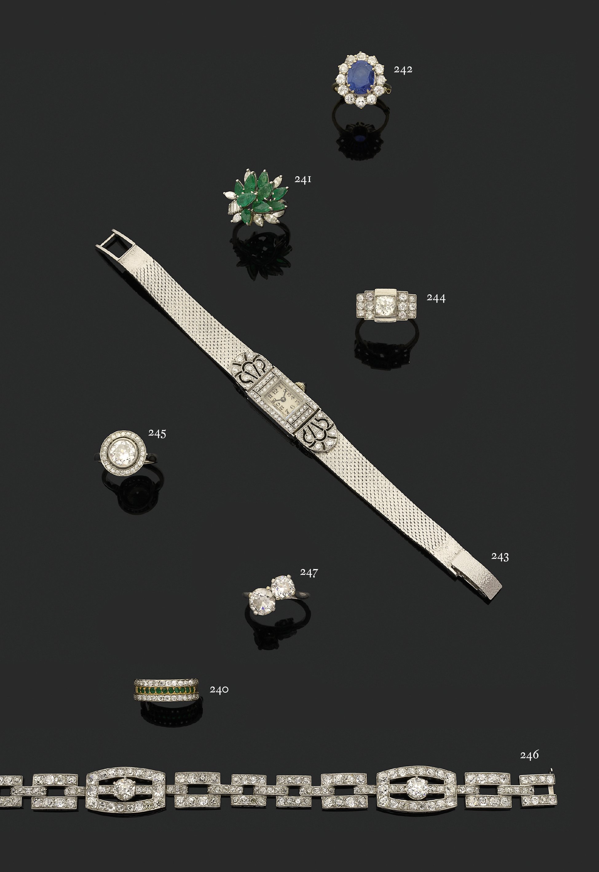 Or gris 750 millièmes, ornée au centre d'une ligne d'émeraudes entre deux lignes de diamants de taille ancienne.