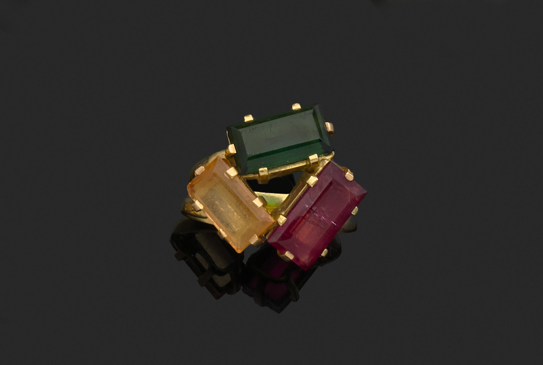Or jaune 750 millièmes, le centre orné de trois pierres fines (probablement tourmalines) de forme rectangulaire.