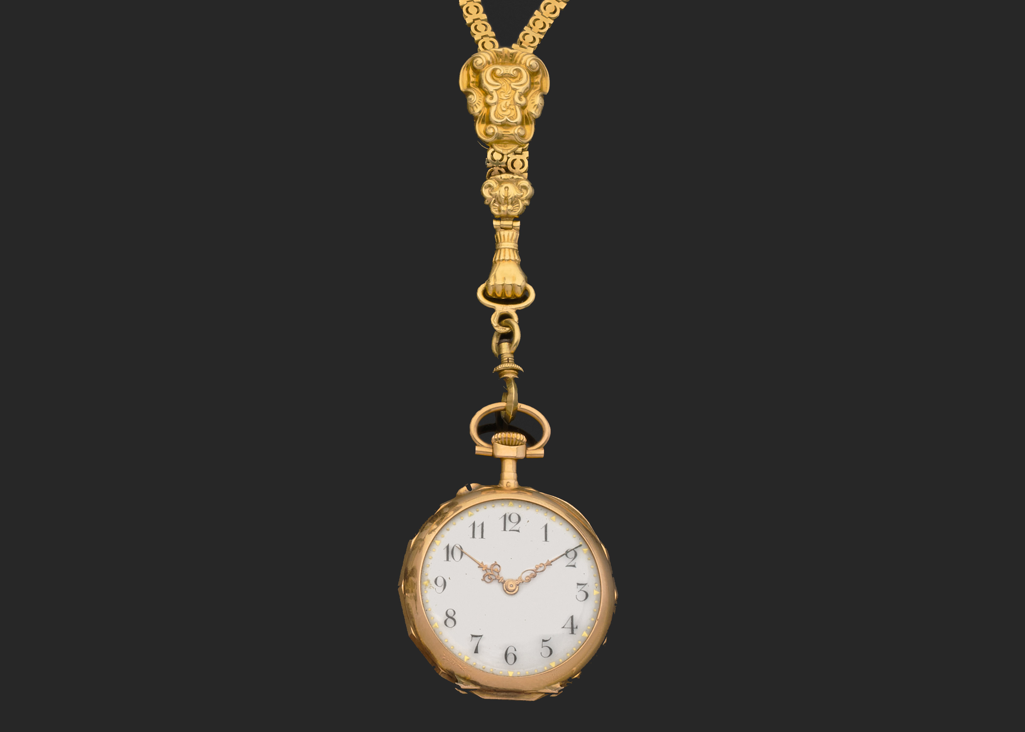 Les maillons plats, décoré d'un coulant, l'extrémité figurant une main retenant une montre de dame en or jaune 750 millièmes, le fond uni, cadran émaillé blanc, chiffres arabes pour les heures.