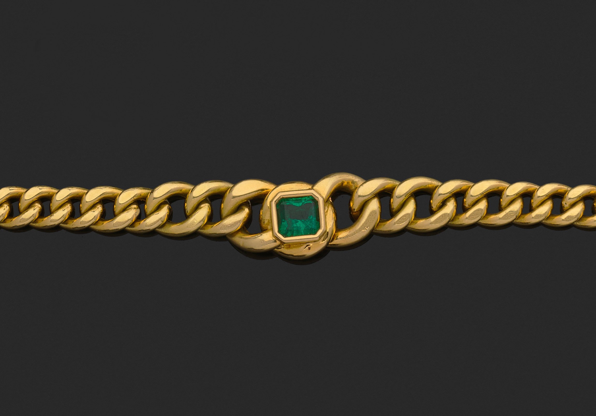 Or jaune 750 millièmes, les maillons en chute, décoré au centre d'une émeraude rectangulaire à pans coupés sertie clos.