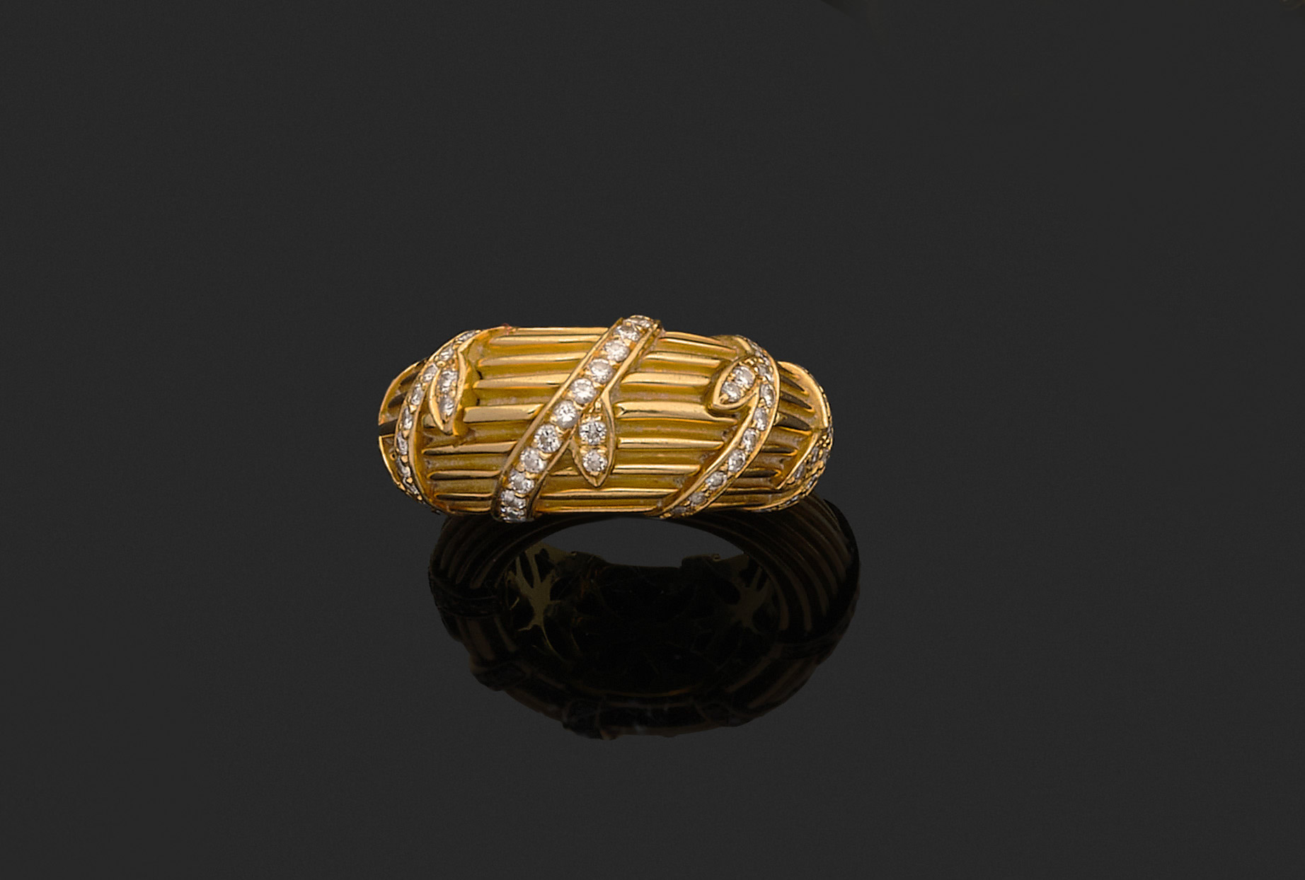 Or jaune 750 millièmes, entièrement gravée de filets, le centre de forme bombée décoré de feuillages ornés de diamants ronds de taille brillant.