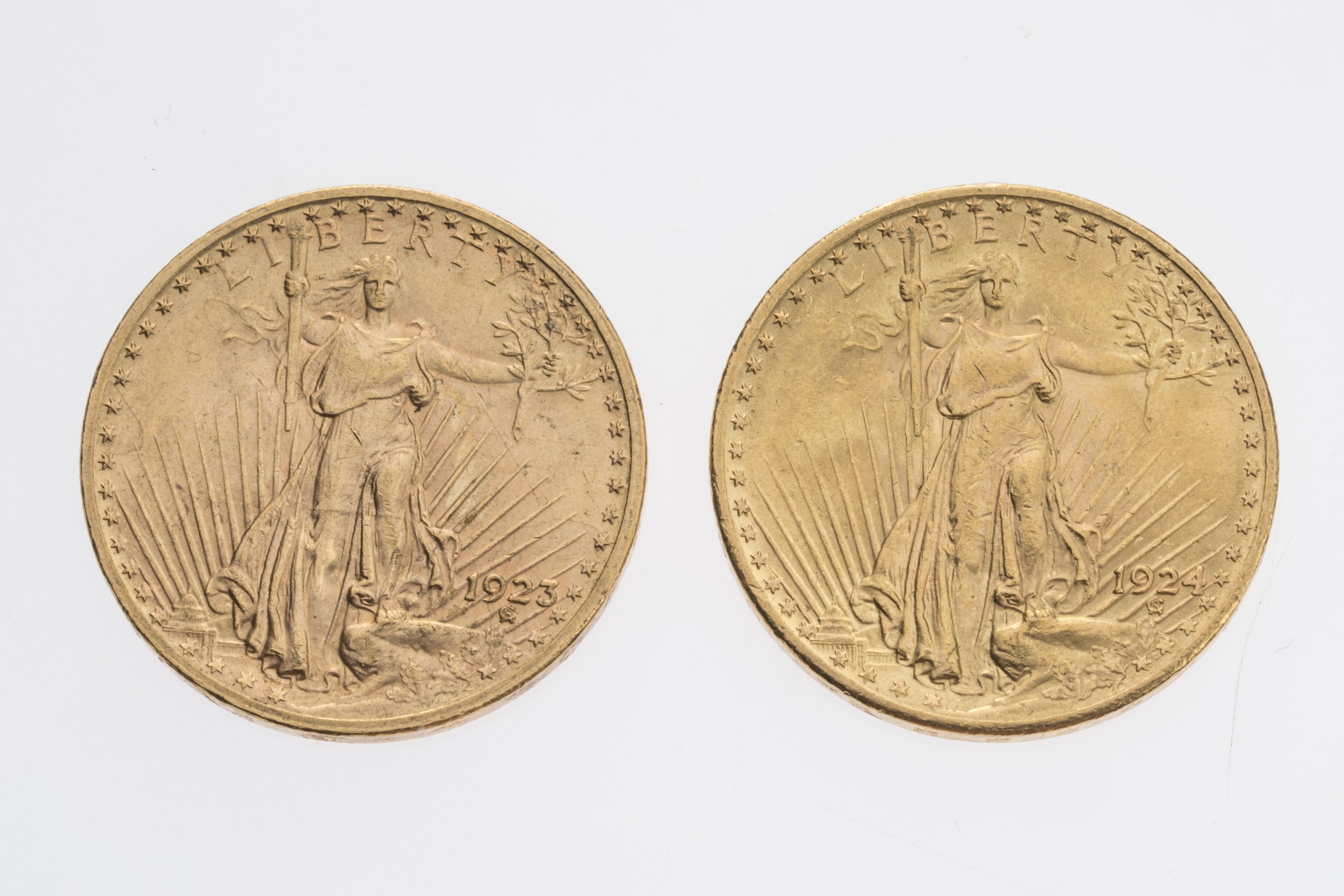 2 pièces de 20 dollars, Liberty, 1923 et 1924.