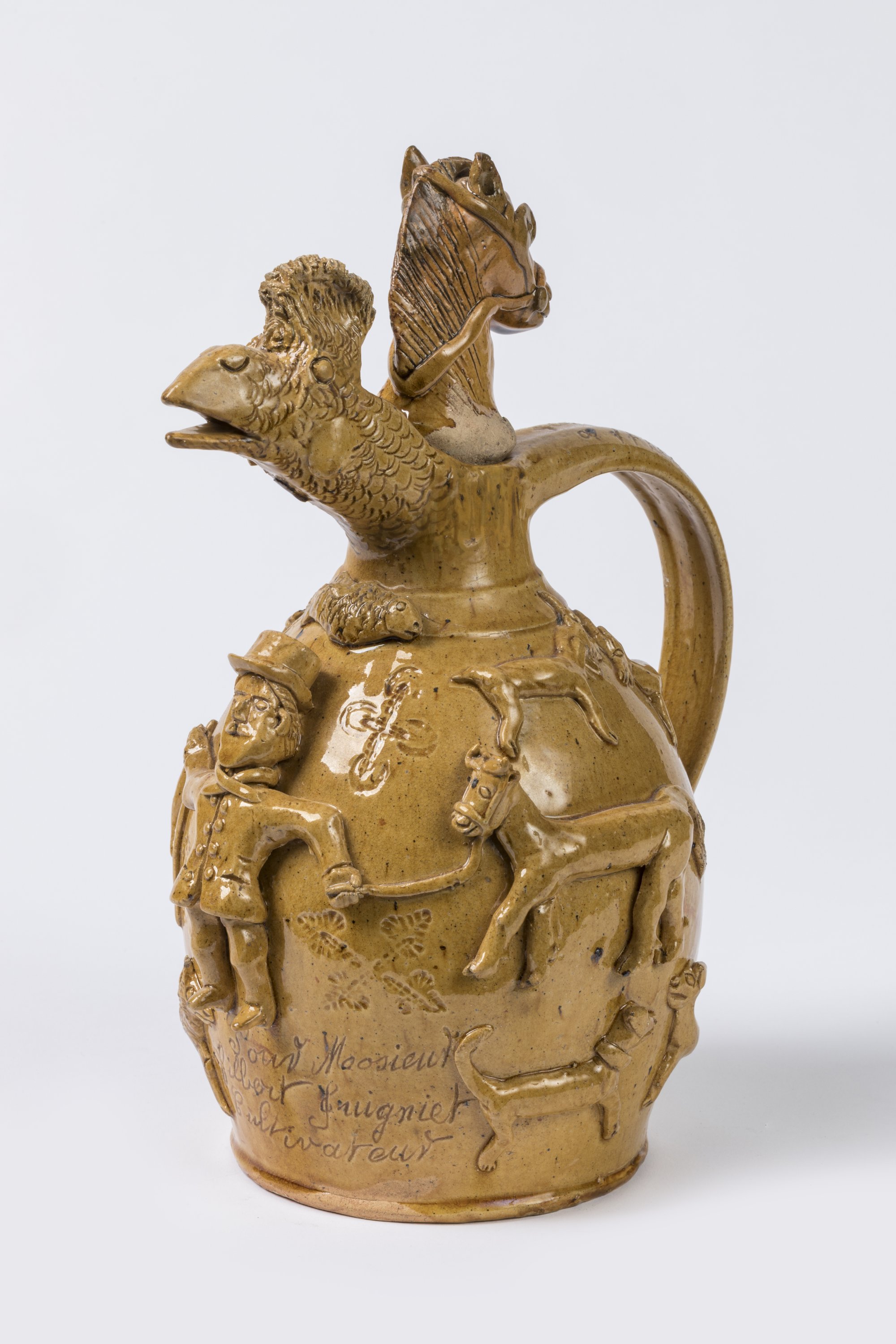 Le bec en forme de tête de coq, la panse ornée d'un homme et son boeuf entouré de chevaux, chèvres, chiens, un mouton et un poisson. Le bouchon à tête de cheval.