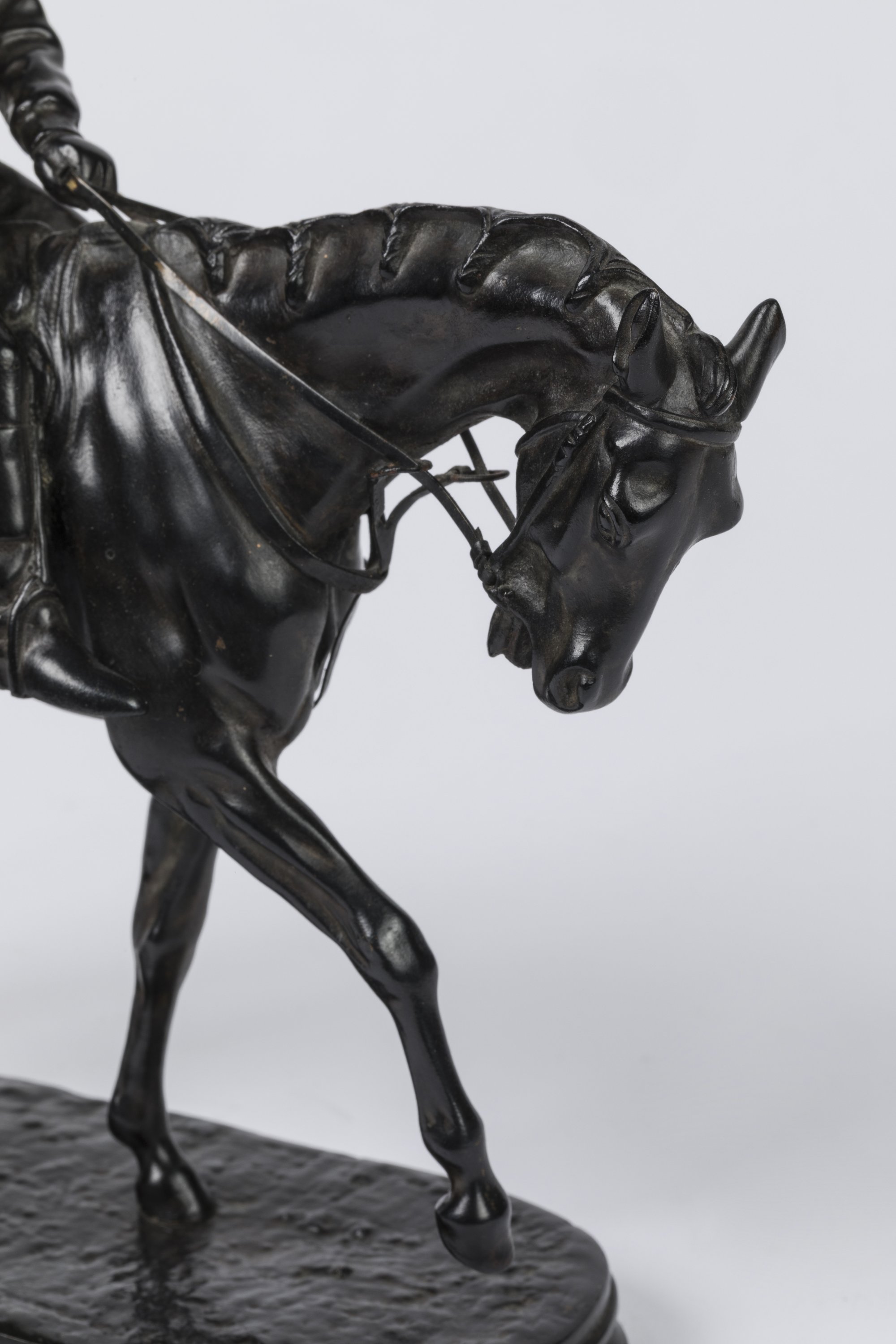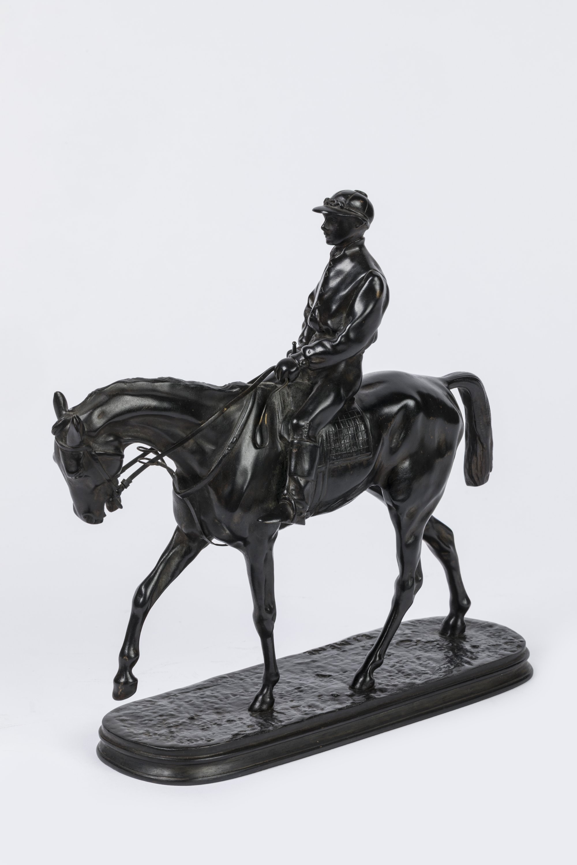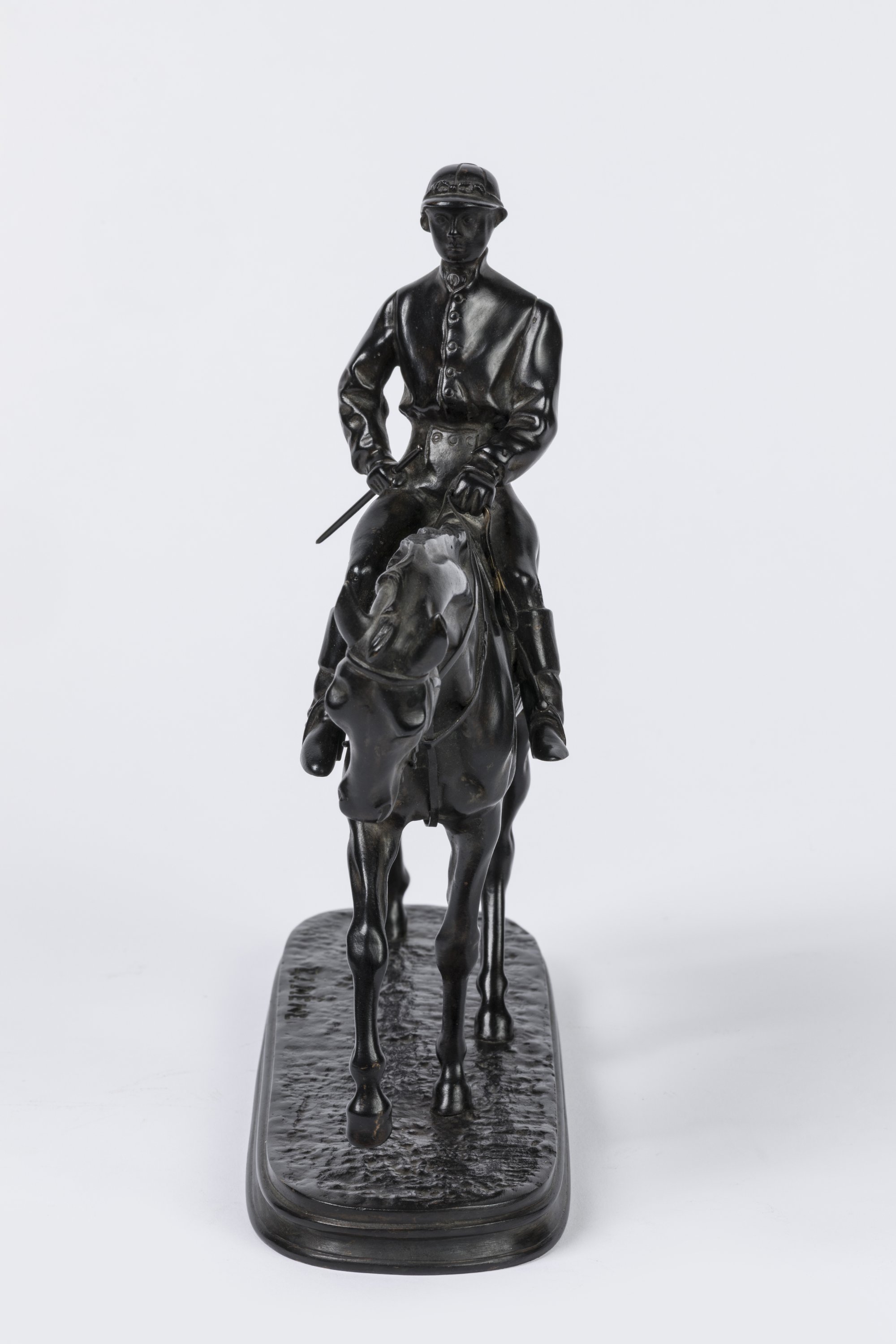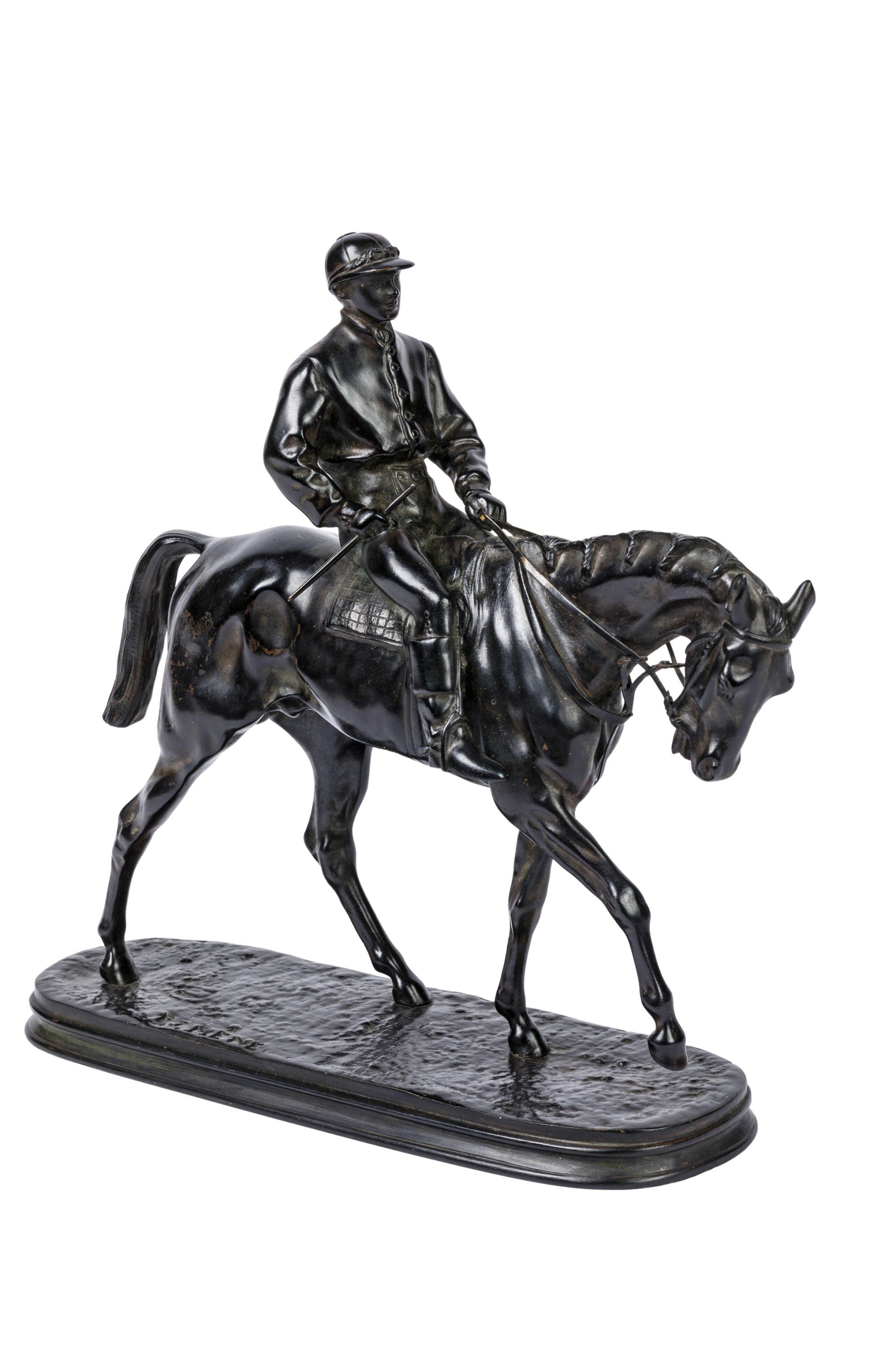 After Pierre-Jules Mène. A bronze sculpture of a jockey on horseback. Signed.