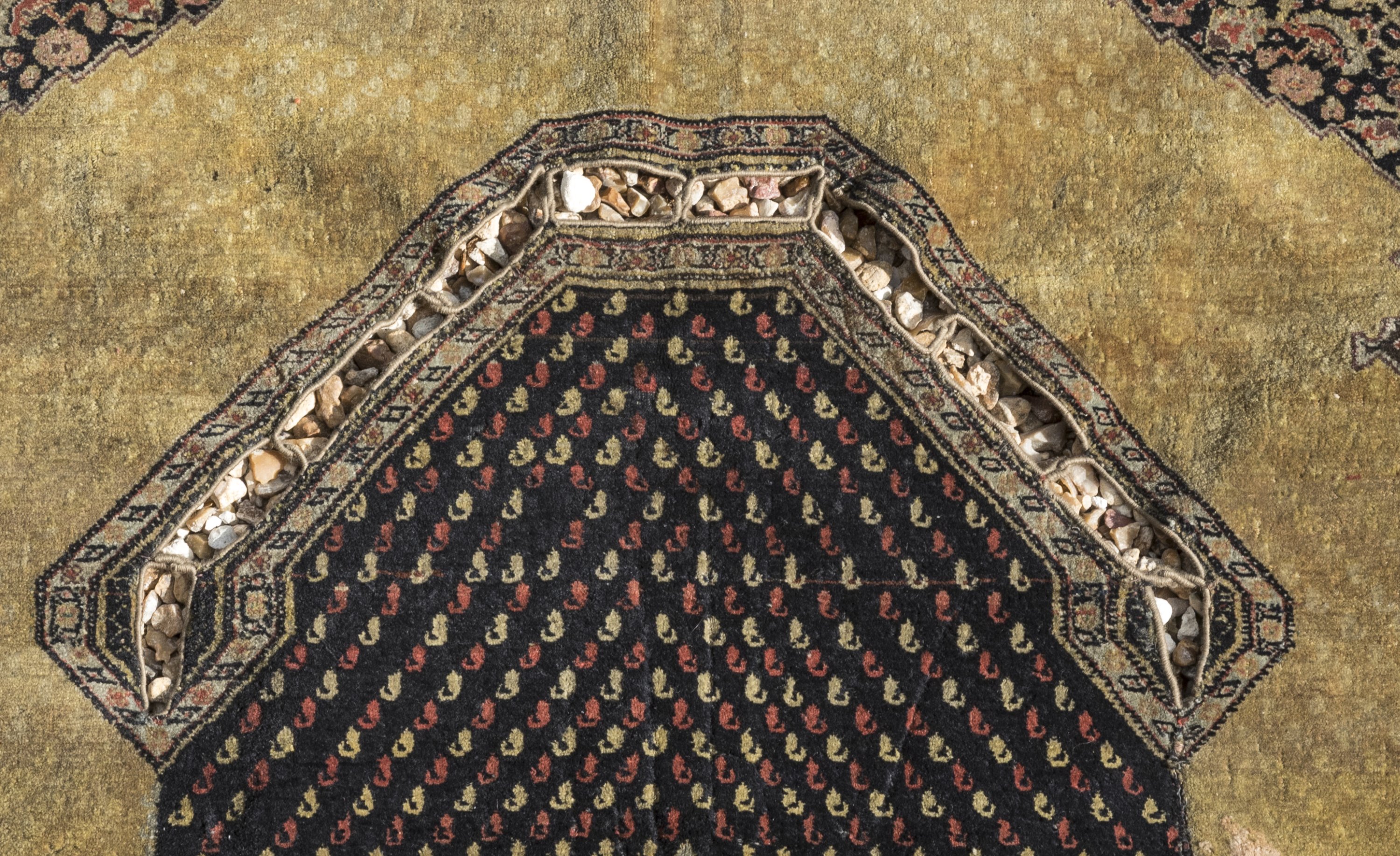 Orné de palmes avec jours pour la bosse du dromadaire sous une arcature jaune, écoinçons noirs, à dense décor herati de fleurs et palmes, bordure d’un galon de fleurs.
