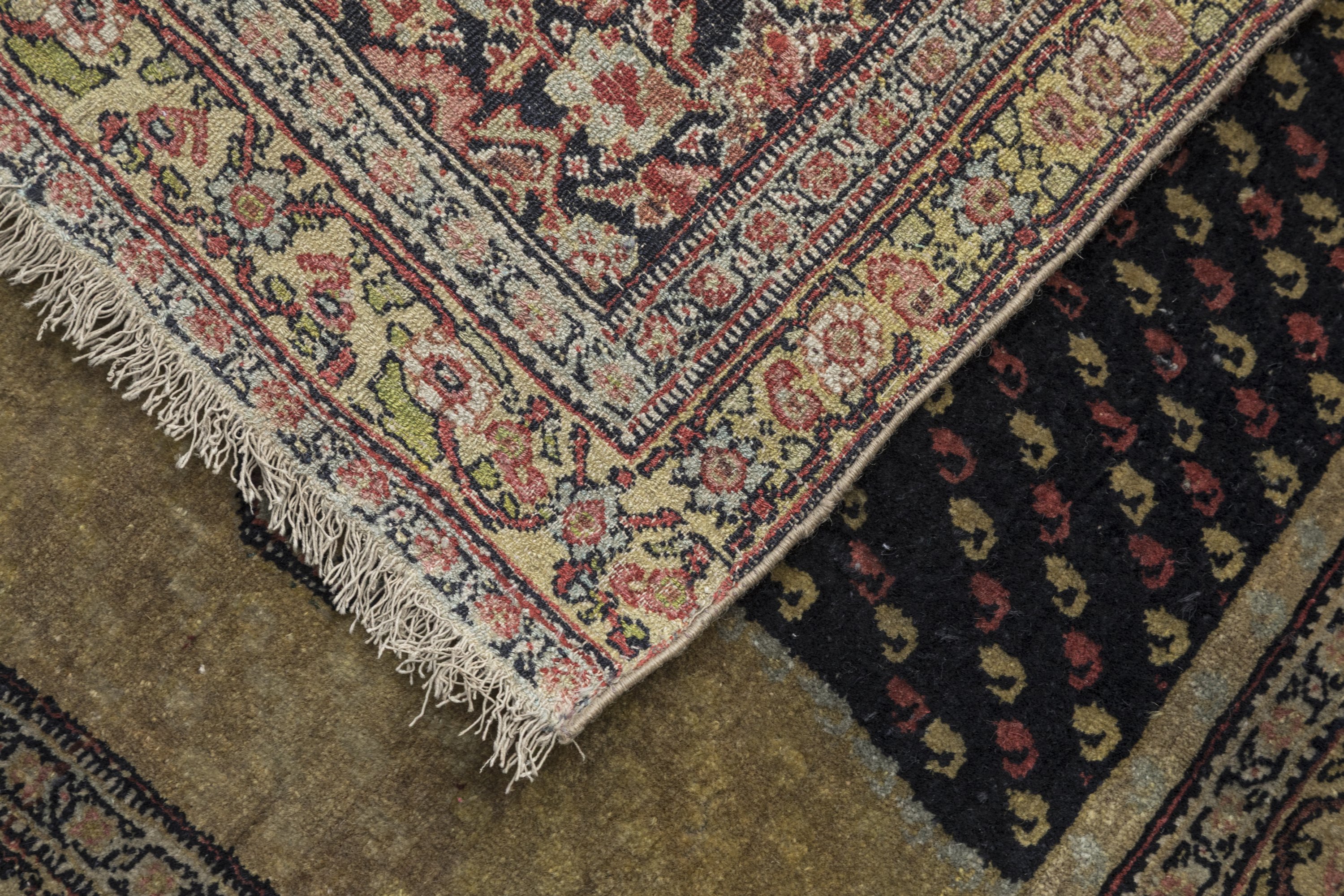 A Senneh dromedary saddle blanket featuring a palm and herati pattern on a black background.