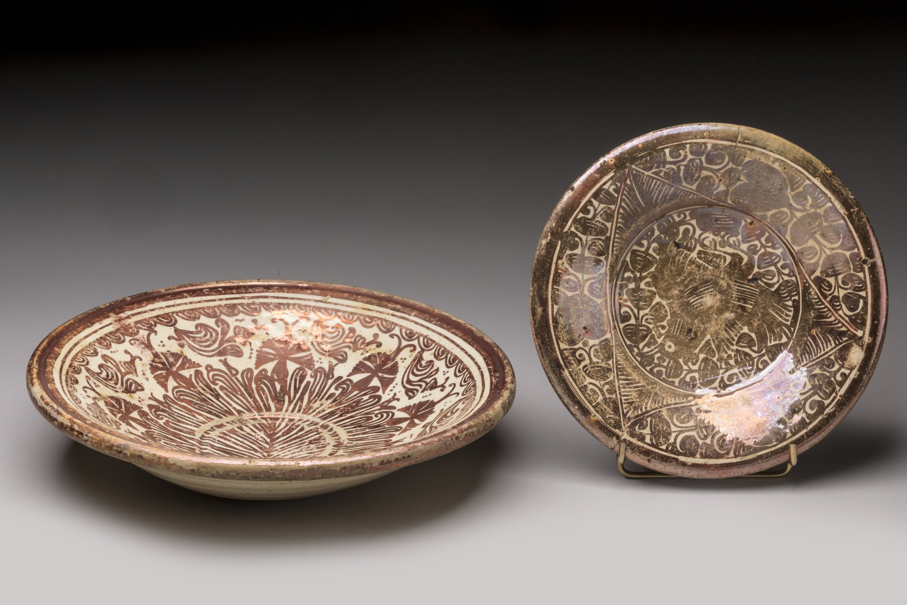 Faïence à décor ocre lustré sur fond chamois d’œillets dans un vase sur l’un et d’un pardalote sur fond de végétaux sur l’autre.