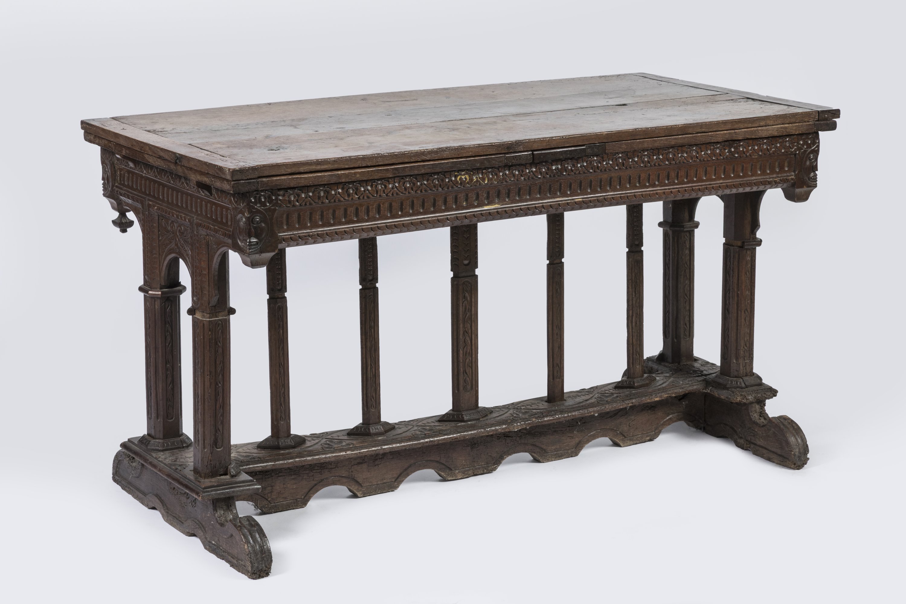 La table repose sur sept colonnes végétalisées réparties sur deux pieds reliés par une entretoise terminés par des pieds mouvementés.