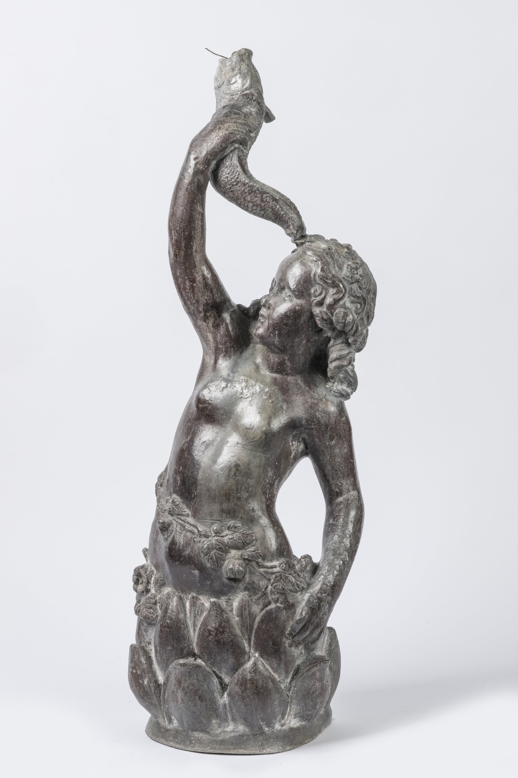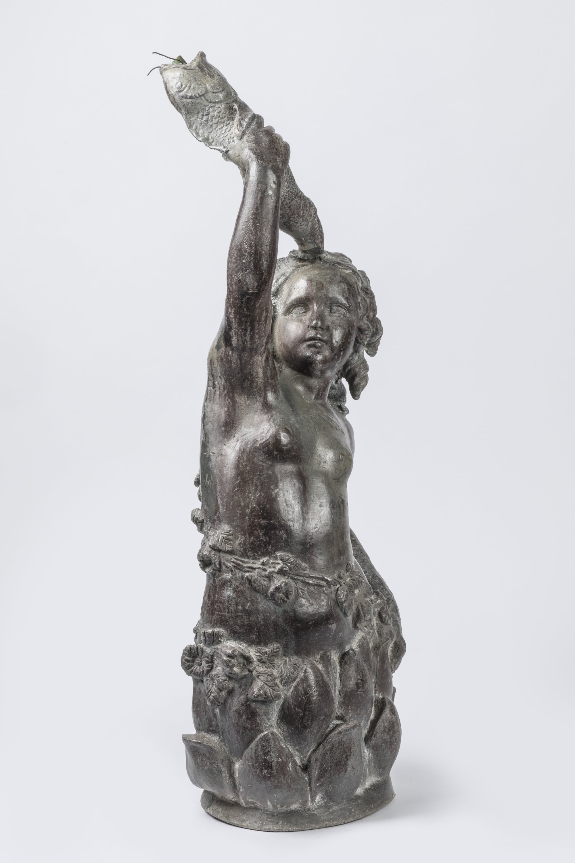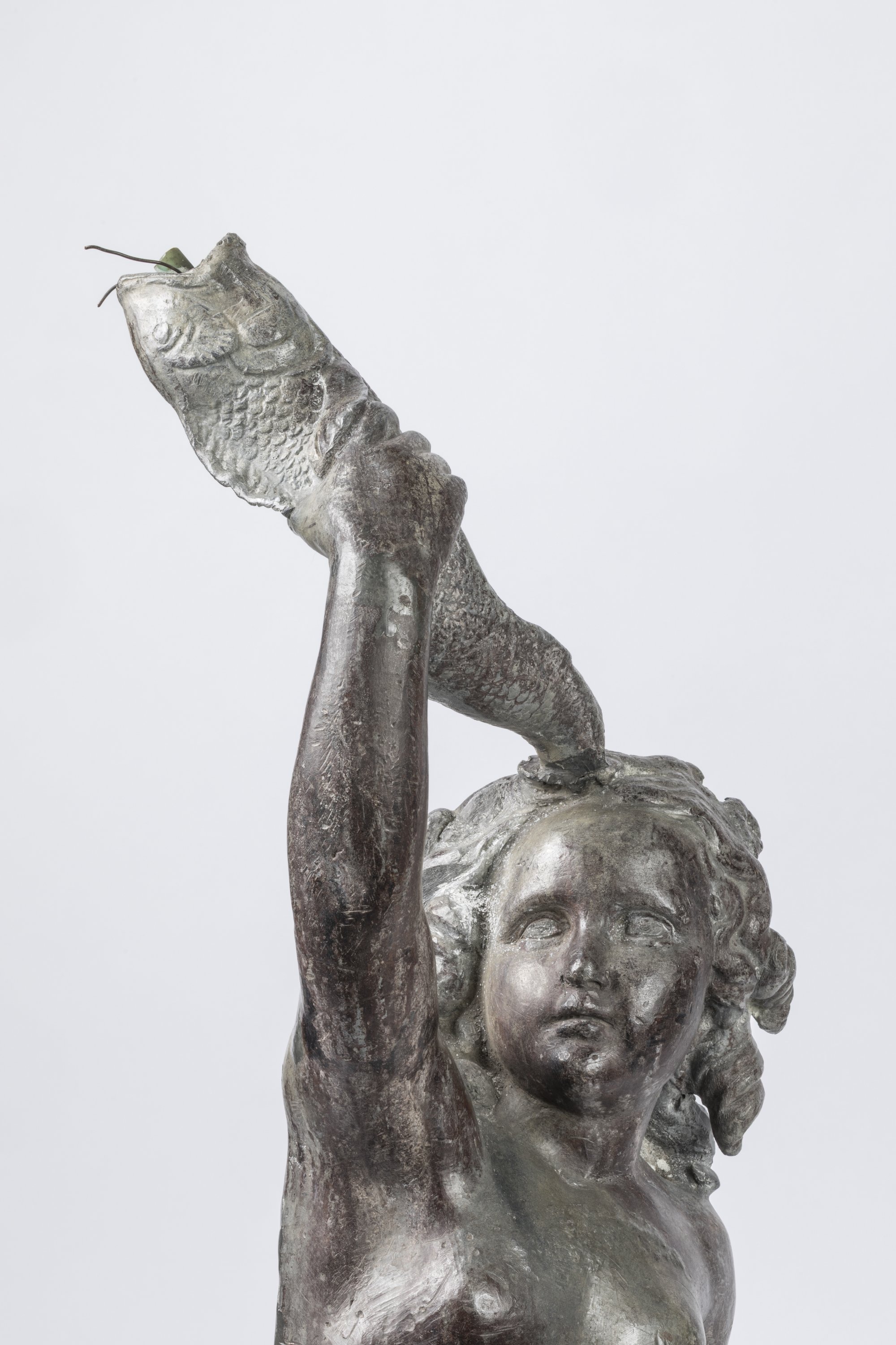 A lead garden fountain in the shape of a child holding a fish. England, 20th century.