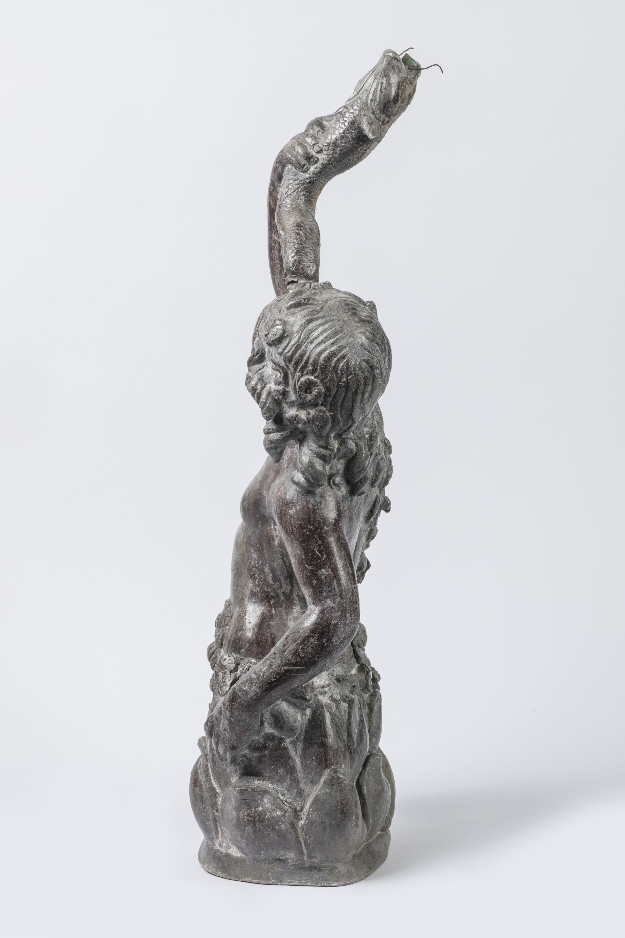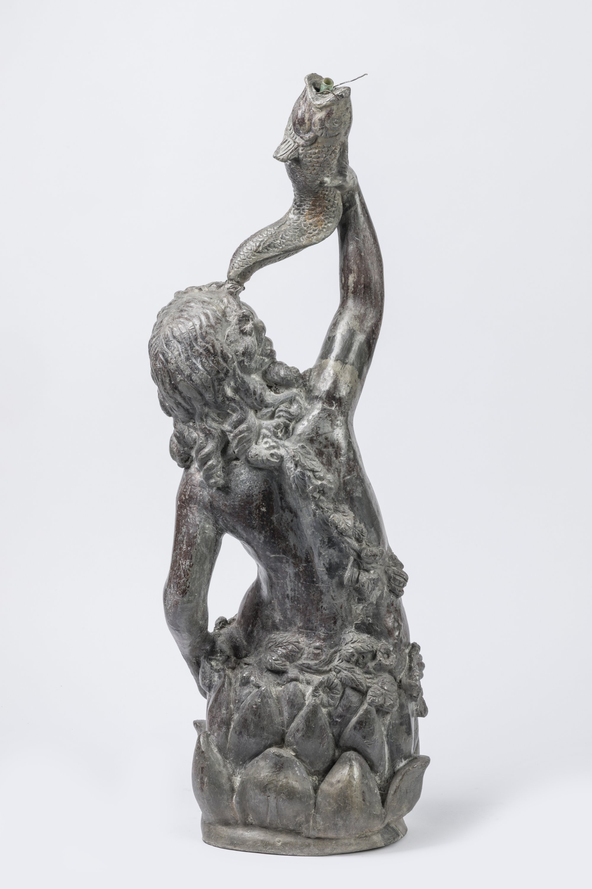 Plomb. Un enfant ceint de feuilles tient de la main droite un poisson. Il repose sur une base à décor d'un double rang de feuilles de lotus.