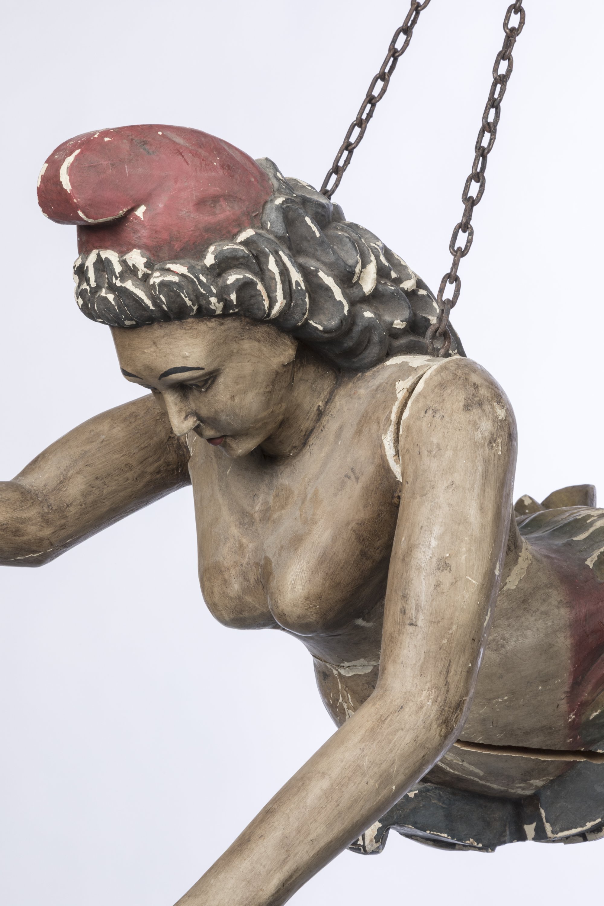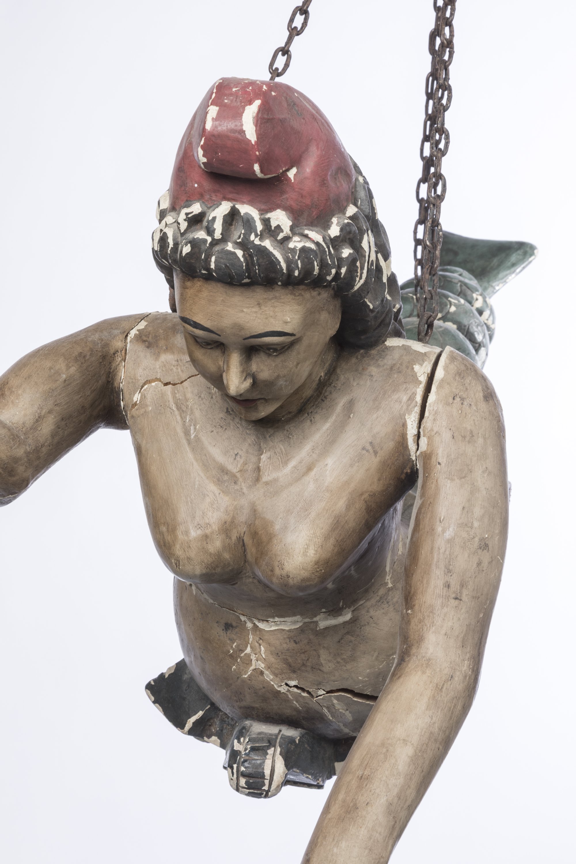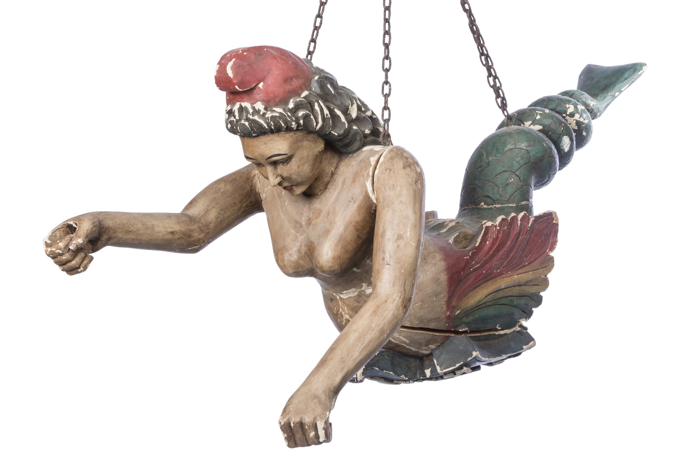 An 1877 polychrome carved wood and stucco shop sign featuring a mermaid.