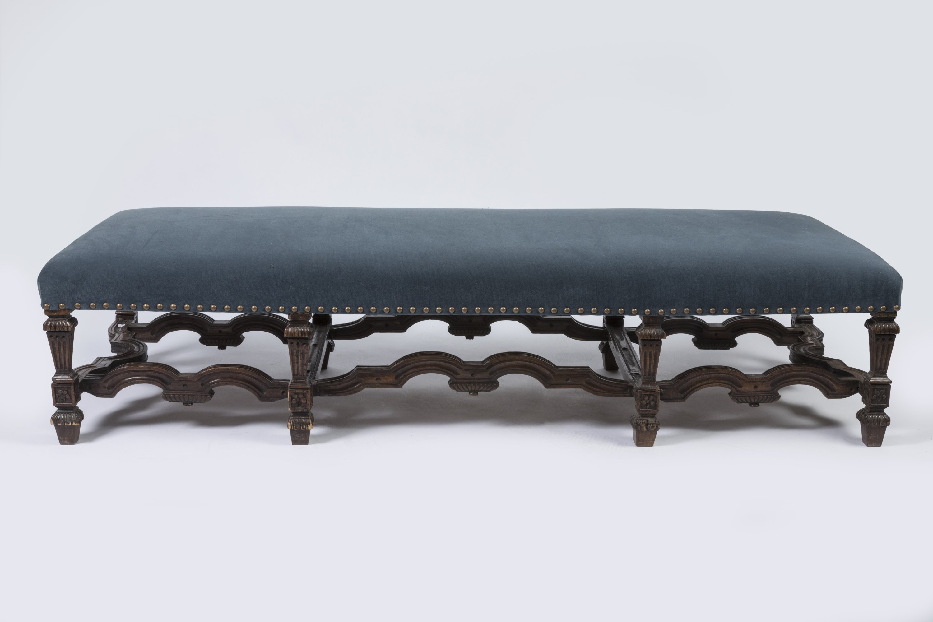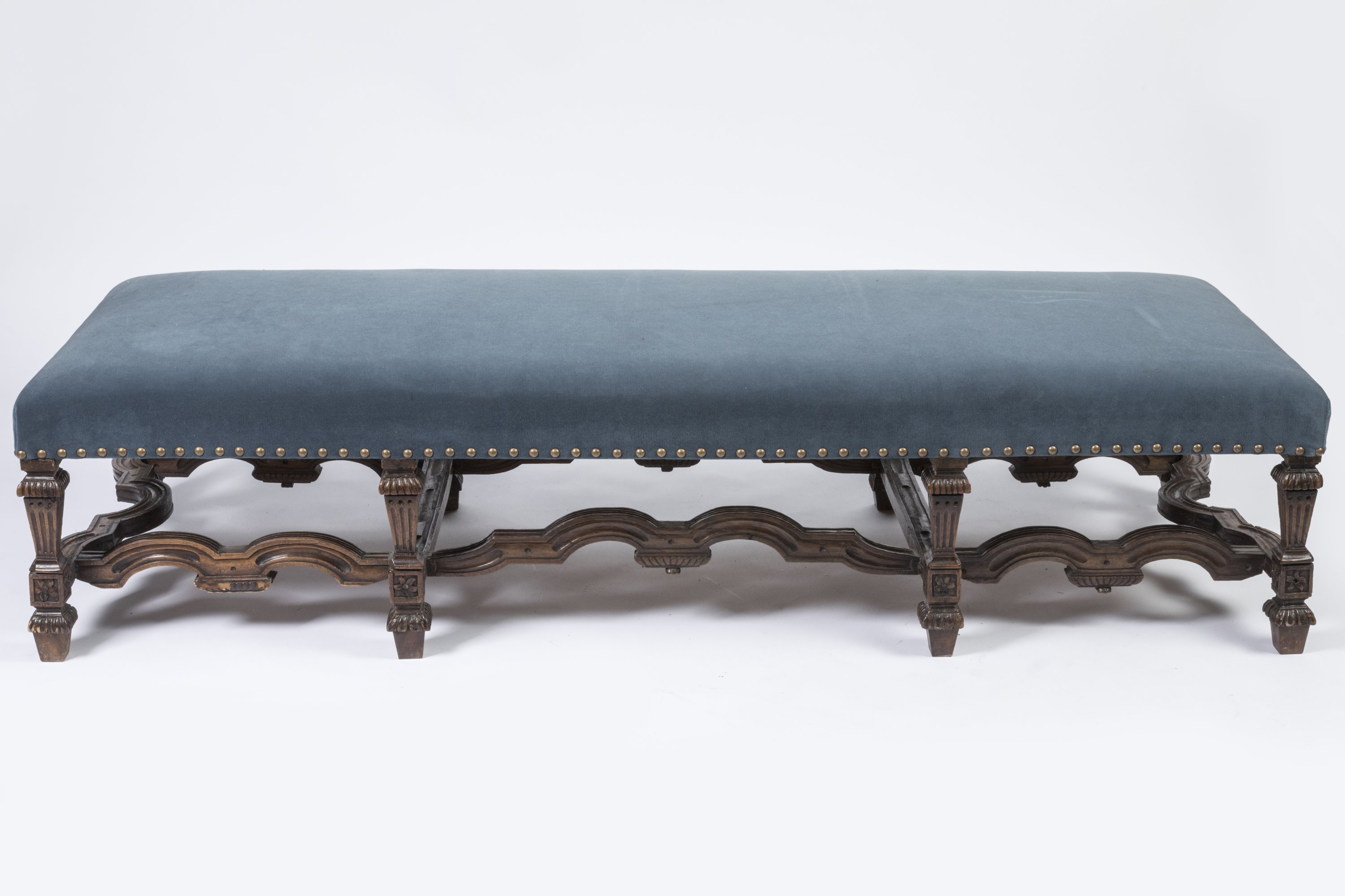 A moulded and carved walnut bench. Blue velvet upholstery.