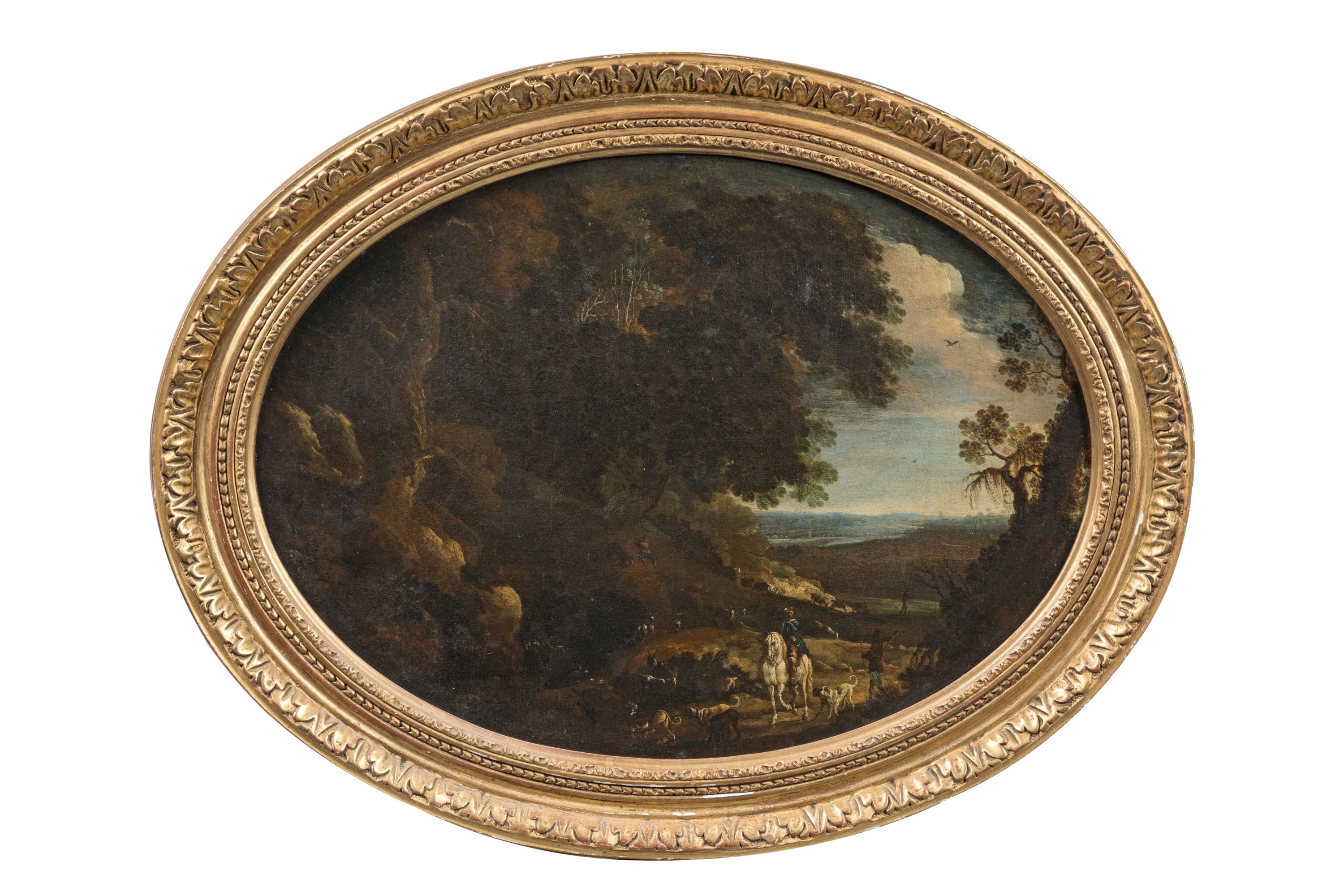 A painting of a landscape with a horserider by a follower of Filippo Napoletano. Oil on an oval canvas in a giltwood frame.