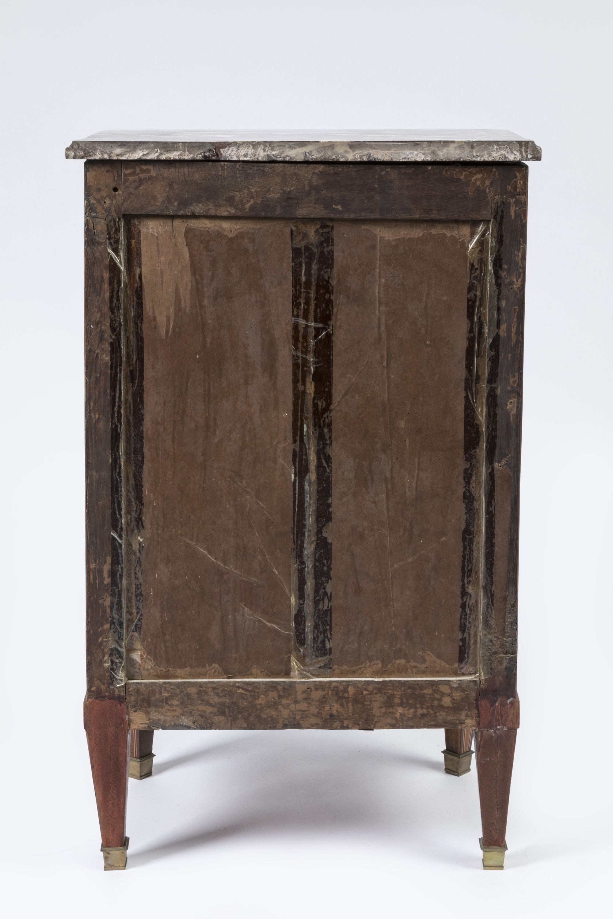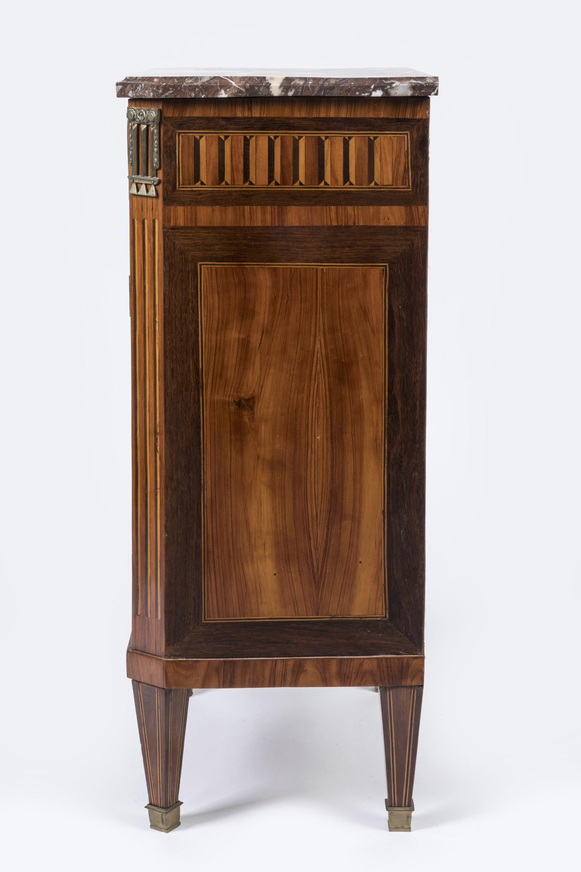 Il ouvre par un tiroir à décor géométrique et un vantail en aile de papillon dans un entourage de filets et un phylactère enrubanné. Les montants à pans coupés sont soulignés de cannelures simulées. Il repose sur quatre pieds en gaine.