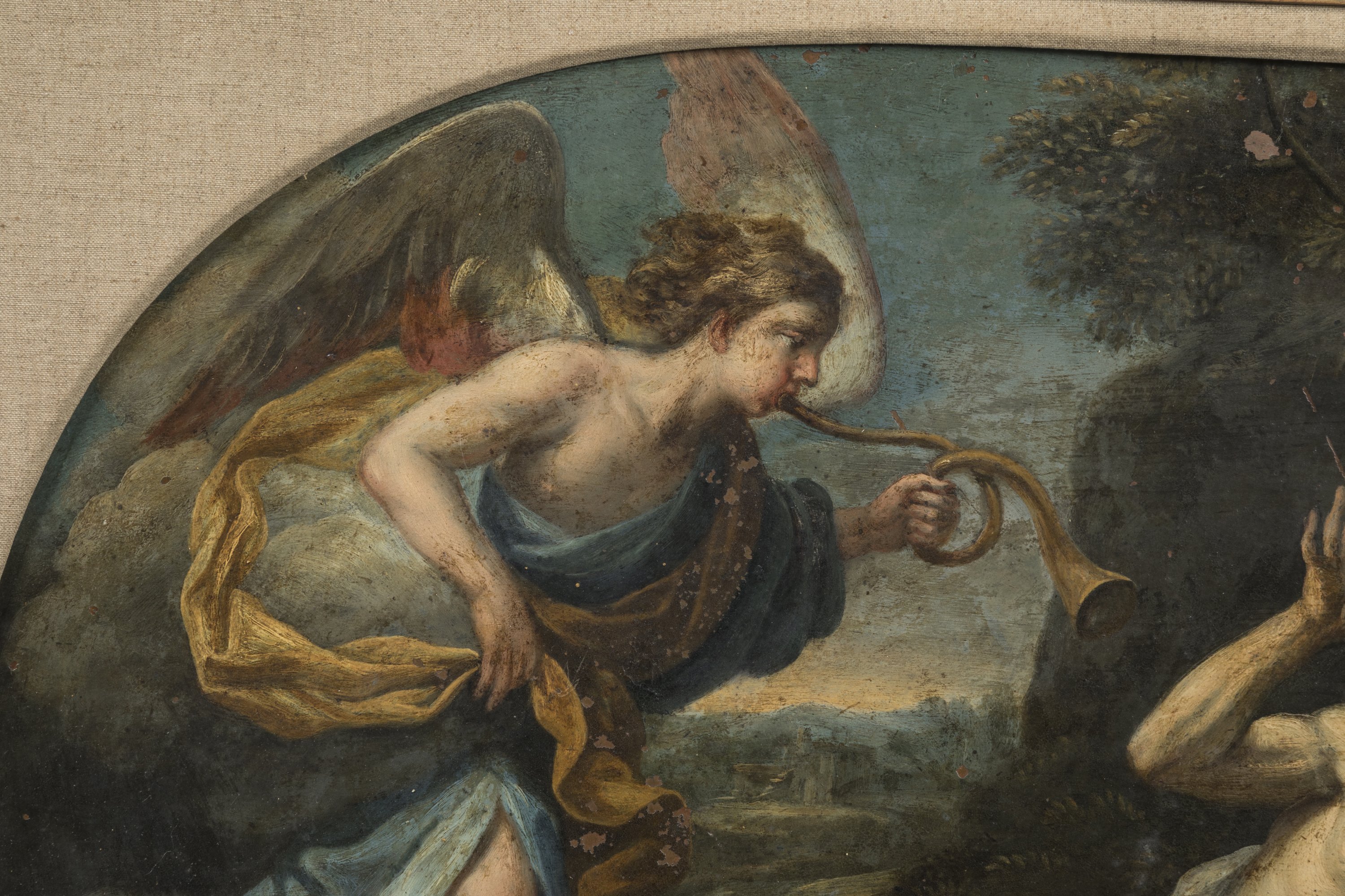 A painting featuring Saint Jerome and the Angel by the entourage of Giacinto Gimignani. Oil on oval copper plate. Roman School, 17th century.